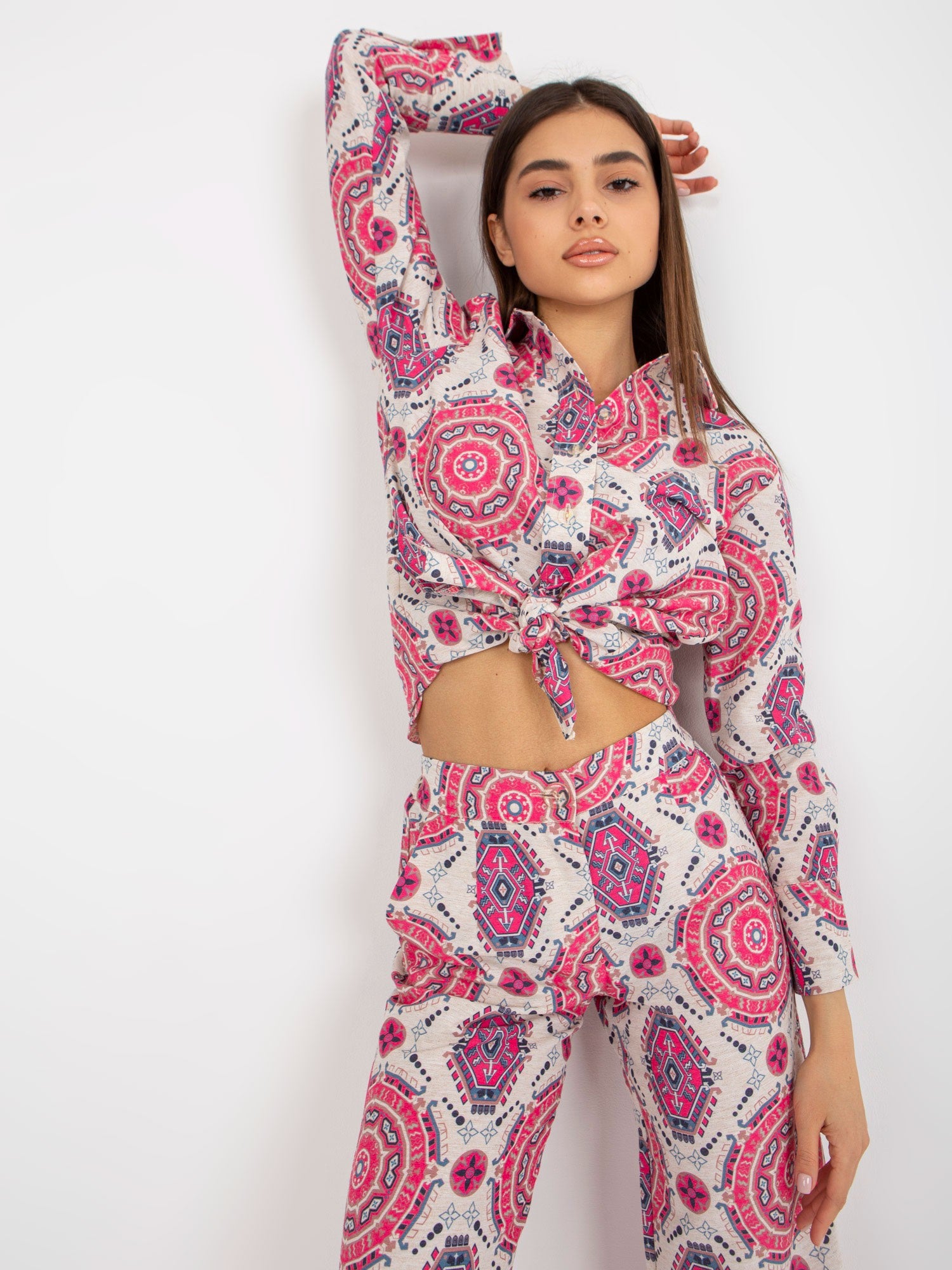 Wymiary kompletu w rozmiarze S/M mierzone na płasko: szerokość koszuli pod pachami - 50 cm, długość rękawa - 55 cm, długość koszuli - 70 cm, szerokość spodni w pasie - 31 cm, wysokość stanu - 29 cm, długość spodni - 109 cm.