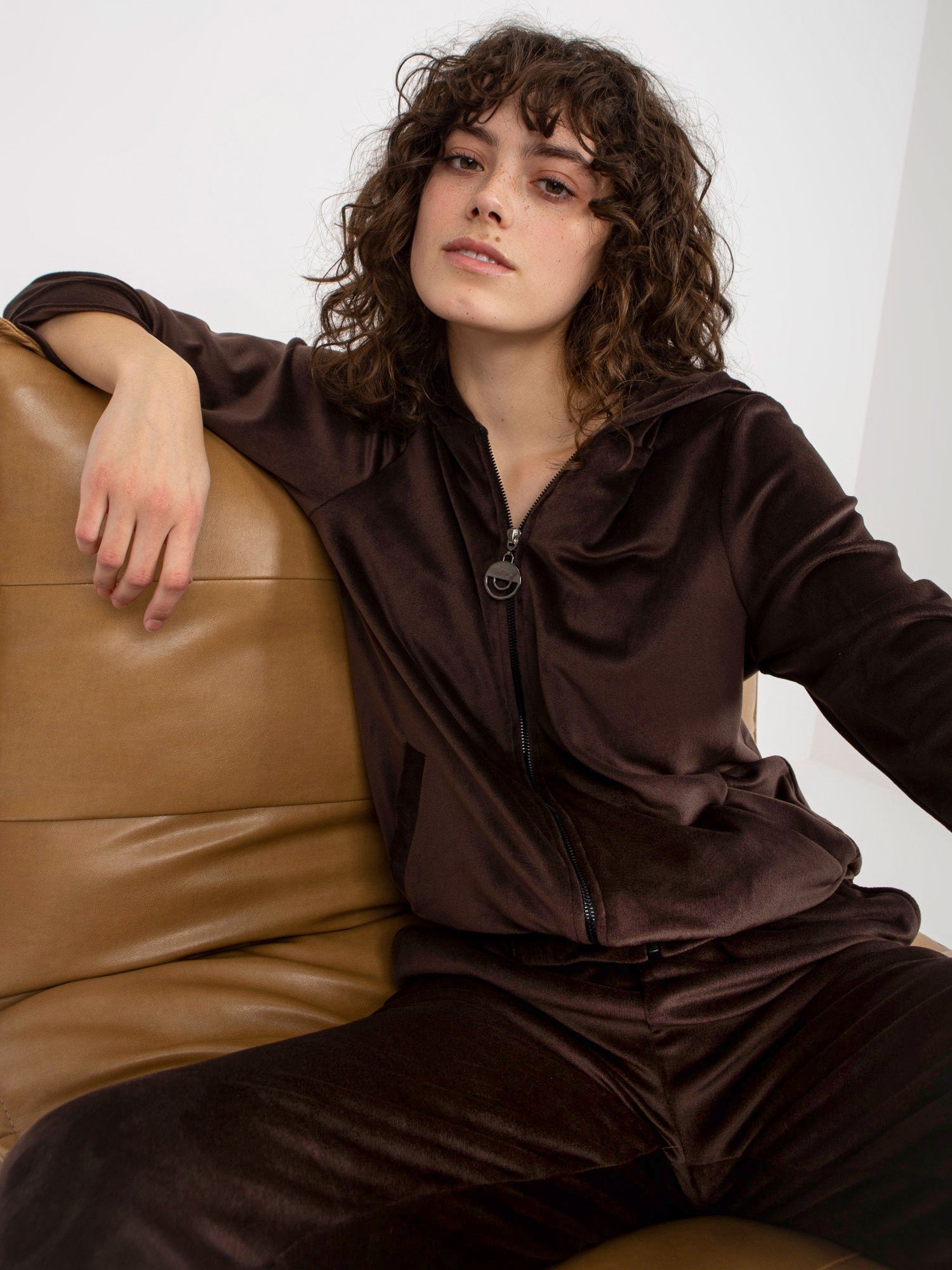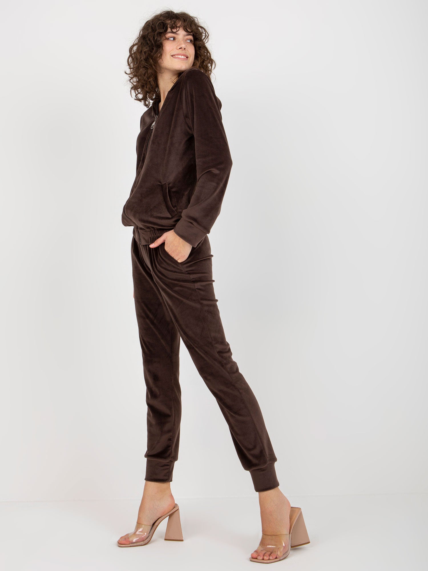Ciemnobrązowy damski komplet welurowy z bluzą z kapturem .