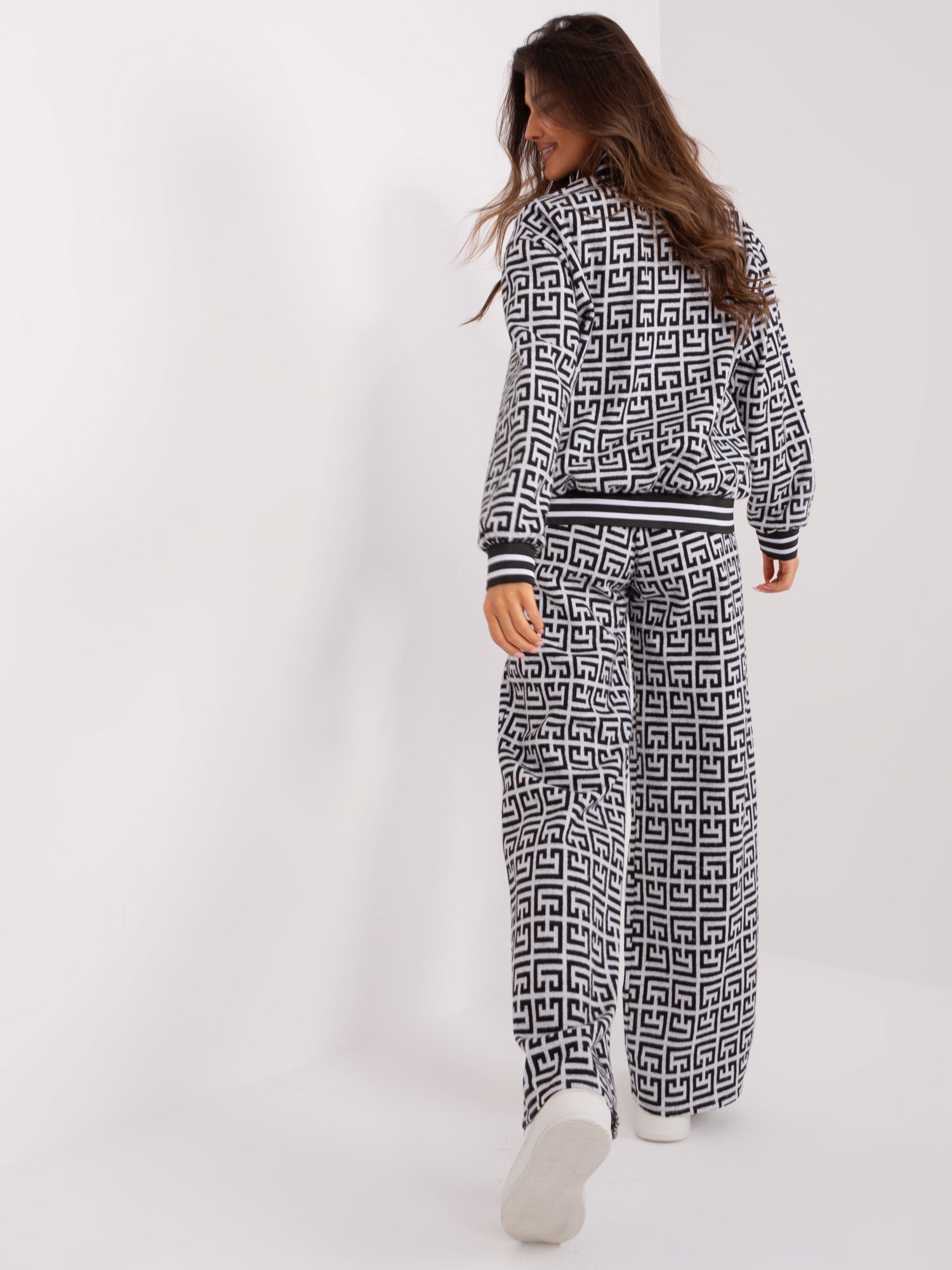 Wymiary kompletu w rozmiarze S/M mierzone na płasko: szerokość bluzy pod pachami - 61 cm długość rękawa - 54 cm, długość bluzy - 59 cm, szerokość spodni w pasie - 35 cm, wysokość stanu - 32 cm, długość spodni - 111- cm.