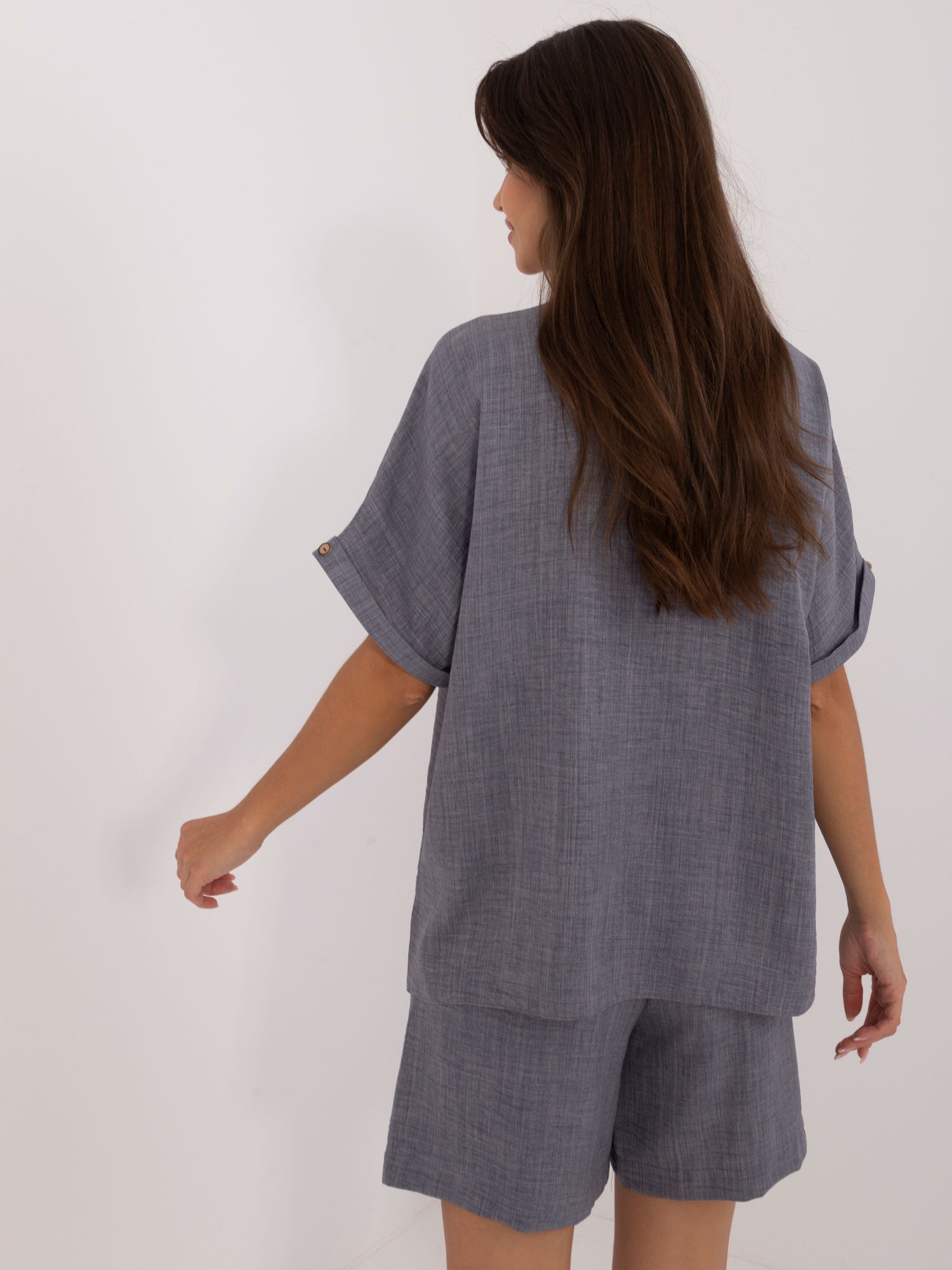 Wymiary kompletu w rozmiarze S/M mierzone na płasko: szerokość bluzki pod pachami - 63 cm, długość bluzki - 65 cm, szerokość szortów w pasie - 31 cm, wysokość stanu - 32 cm, długość szortów - 45 cm.