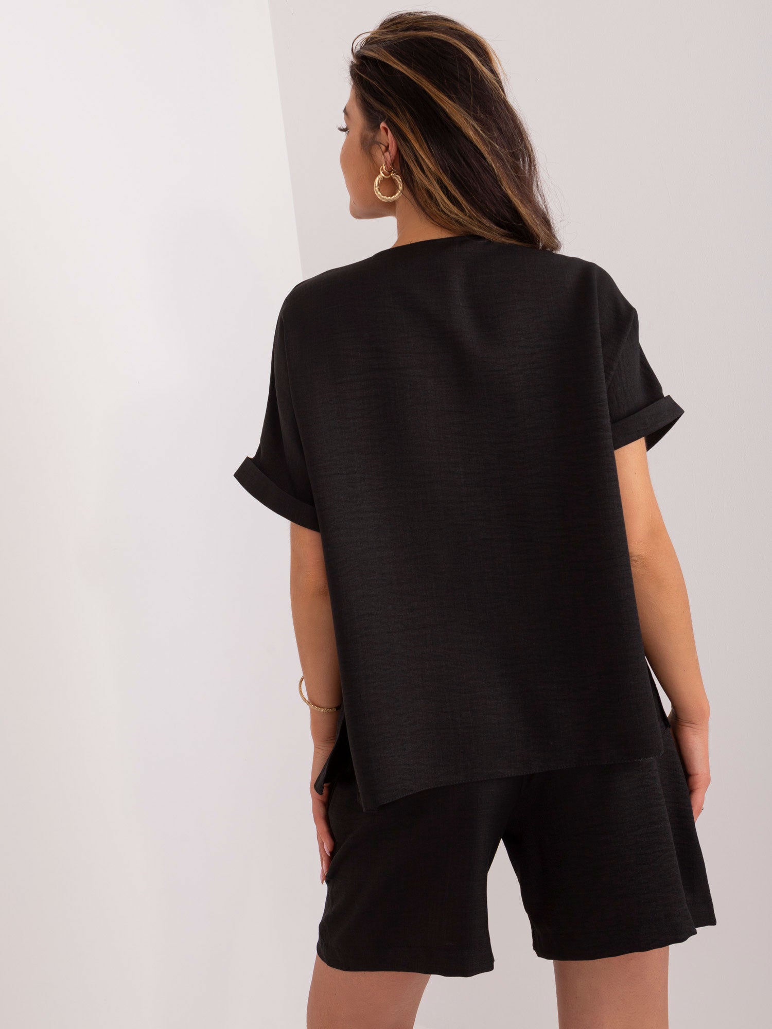 Wymiary kompletu w rozmiarze S/M mierzone na płasko: szerokość bluzki pod pachami - 63 cm, długość bluzki - 65 cm, szerokość szortów w pasie - 31 cm, wysokość stanu - 32 cm, długość szortów - 45 cm.