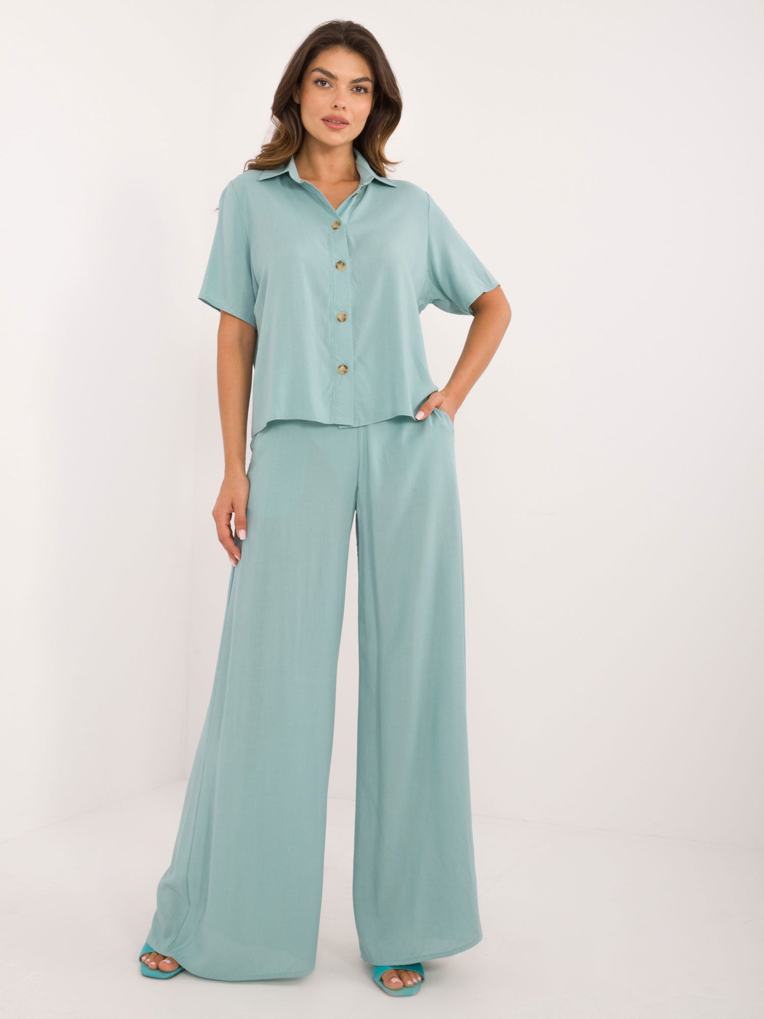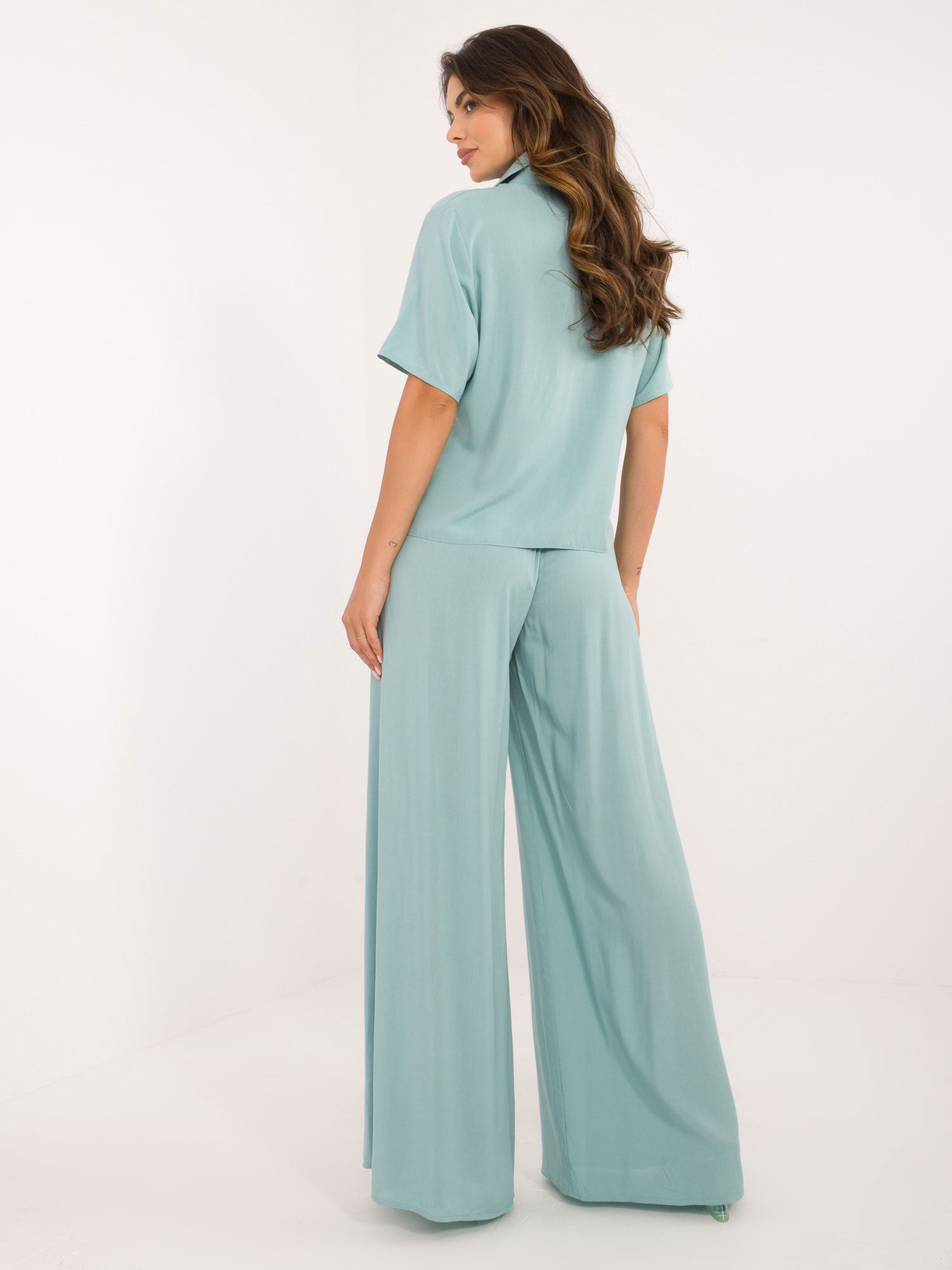 Wymiary kompletu w rozmiarze S/M mierzone na płasko: szerokość koszuli pod pachami - 55 cm, długość koszuli - 57 cm, szerokość spodni w pasie - 34 cm, wysokość stanu - 30 cm, długość spodni - 114 cm.