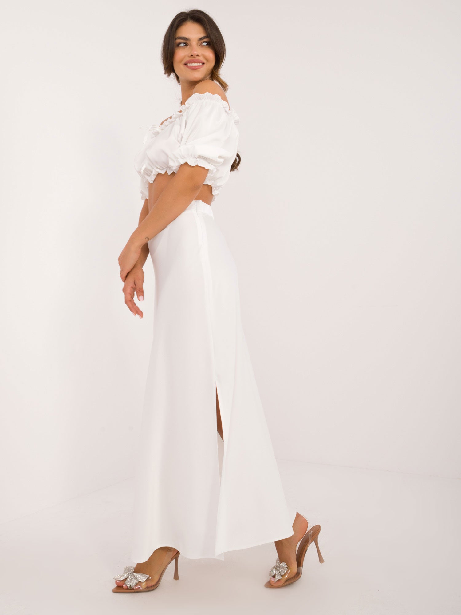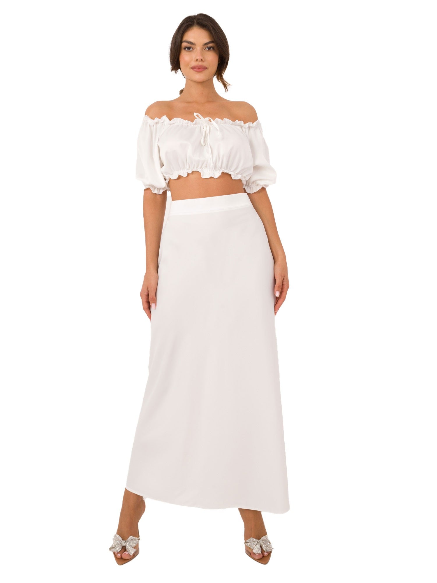 Wymiary kompletu w rozmiarze S/M mierzone na płasko: szerokość bluzki pod pachami - 38 cm, długość bluzki - 35 cm, szerokość spódnicy w pasie - 35 cm, długość spódnicy - 102 cm.