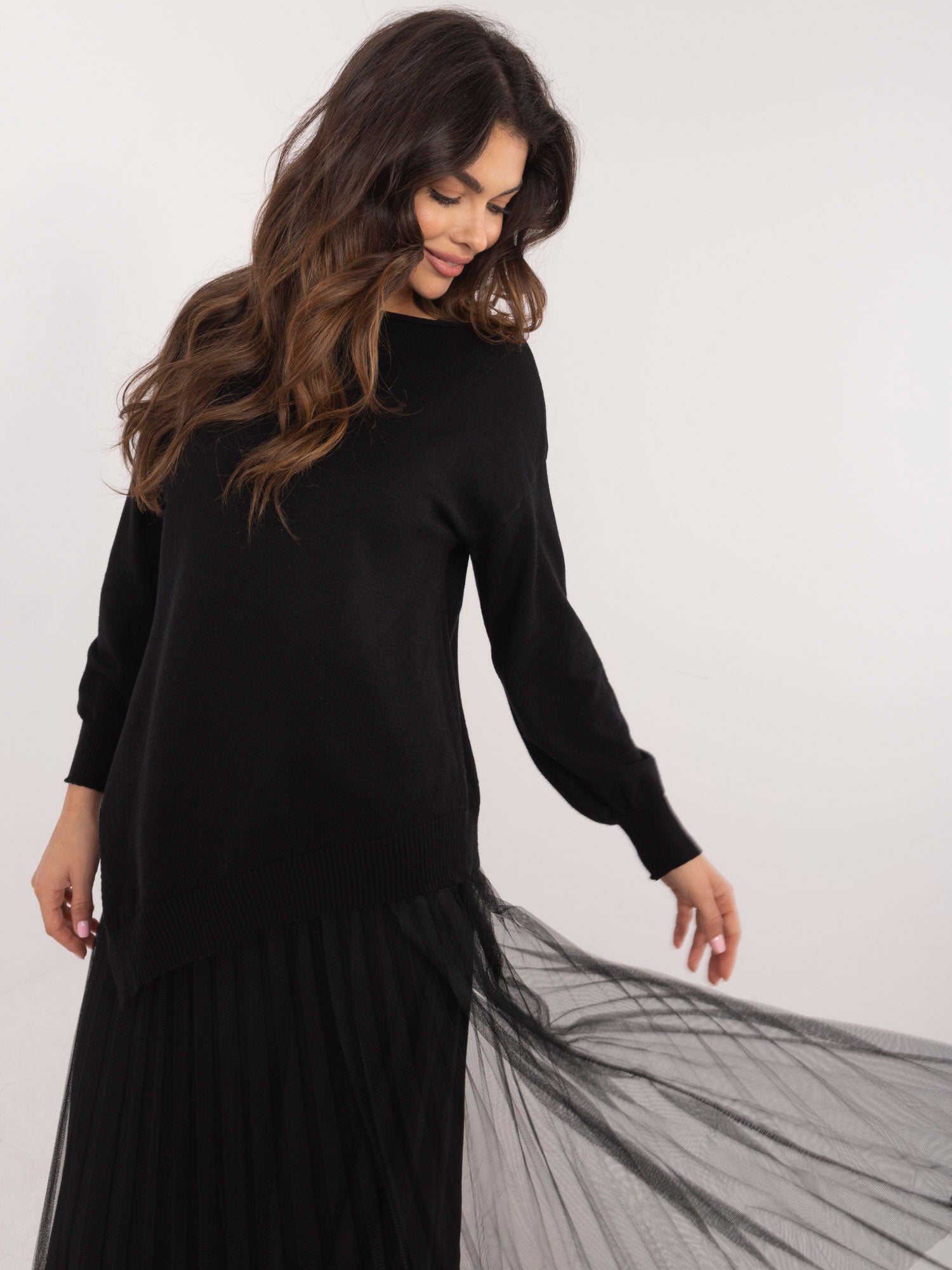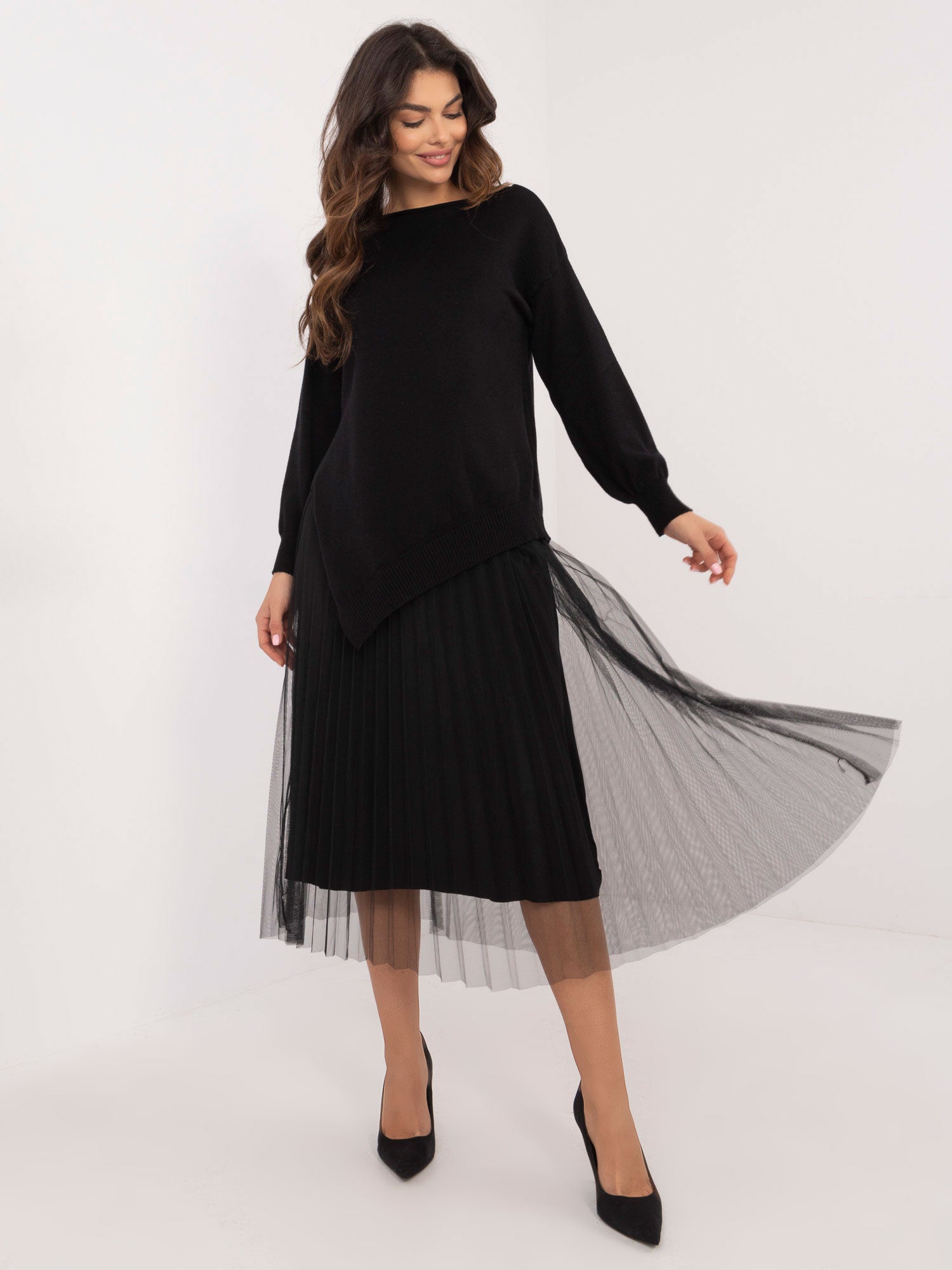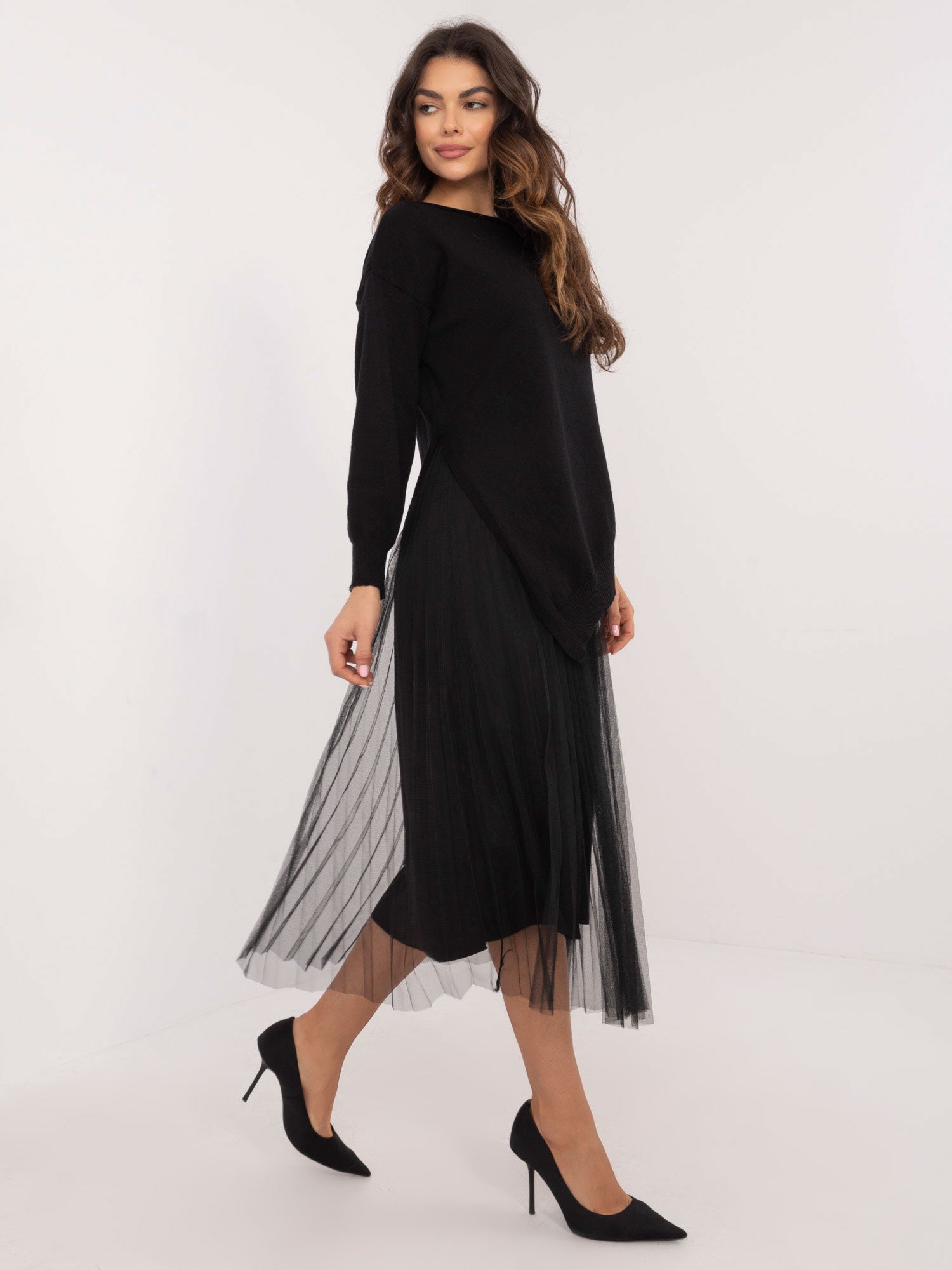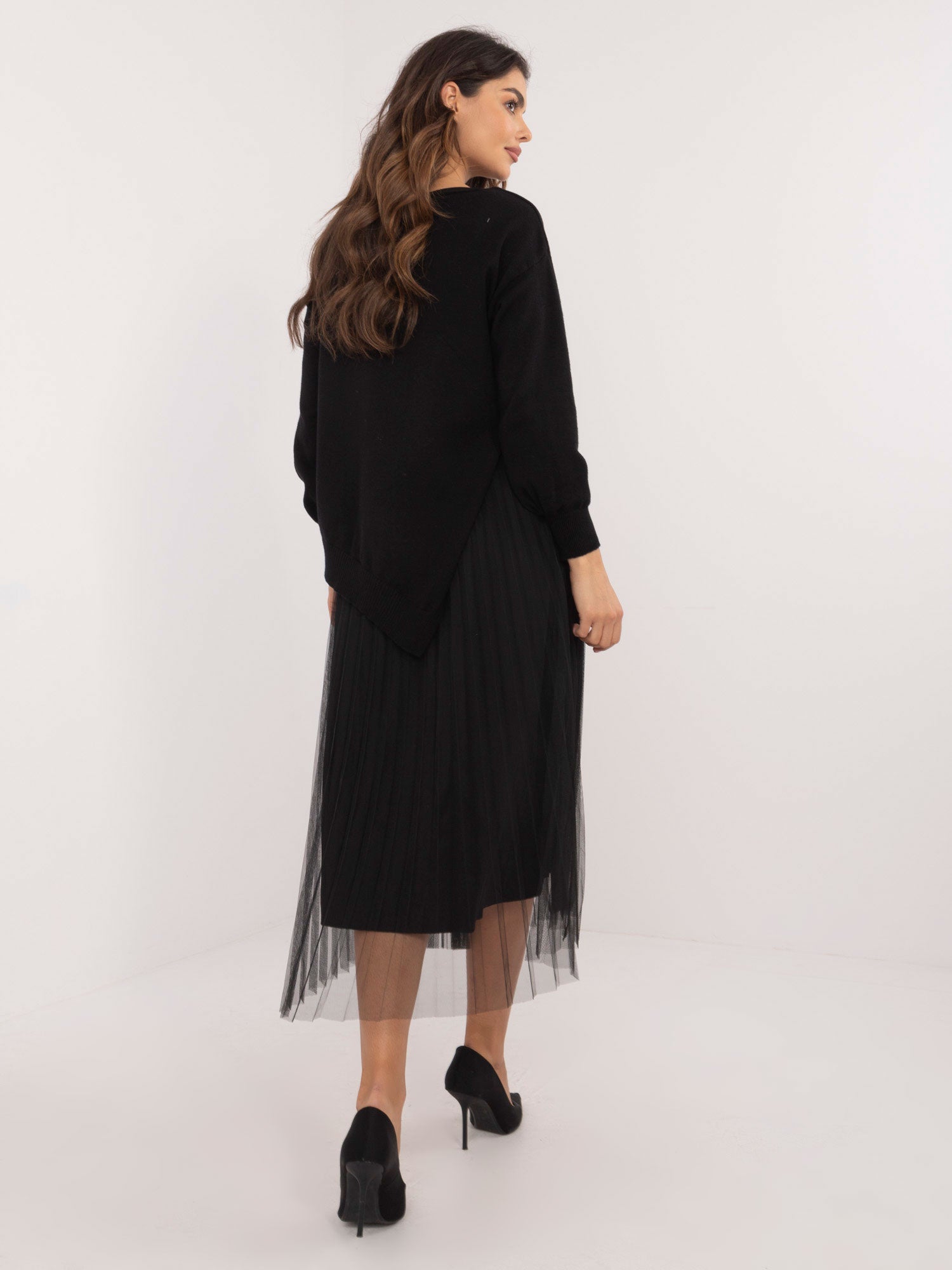 Wymiary kompletu w rozmiarze one size mierzone na płasko: szerokość swetra pod pachami - 45 cm, długość swetra - 77 cm, długość rękawa - 54 cm, szerokość sukienki pod pachami - 33 cm, długość sukienki - 127 cm.