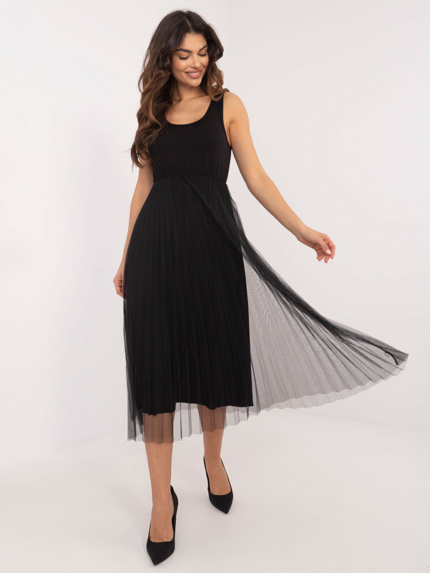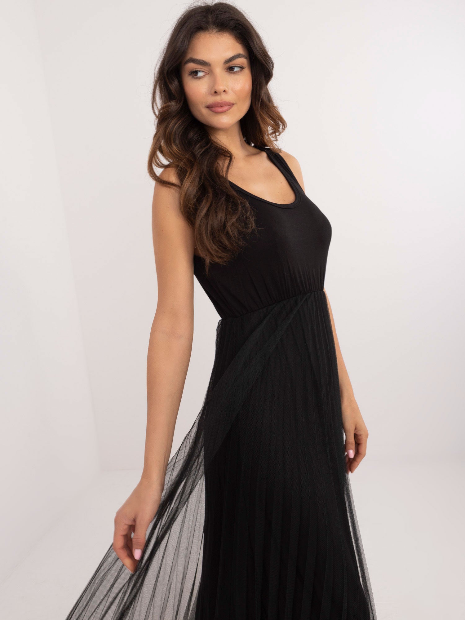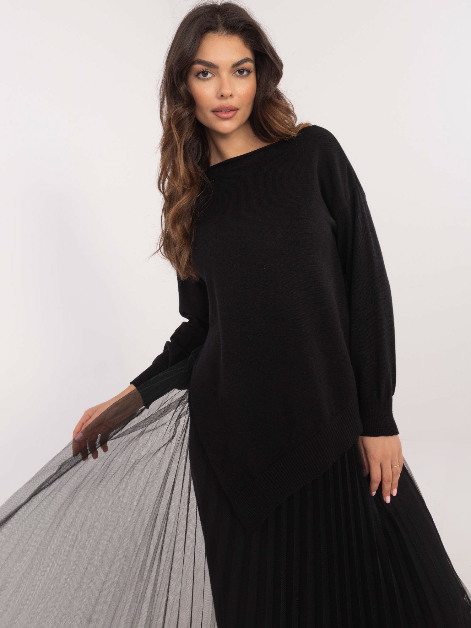 Modelka ma na sobie rozmiar one size. Wymiary modelki: wzrost 173 cm, biust 85 cm, talia 62 cm, biodra 95 cm.