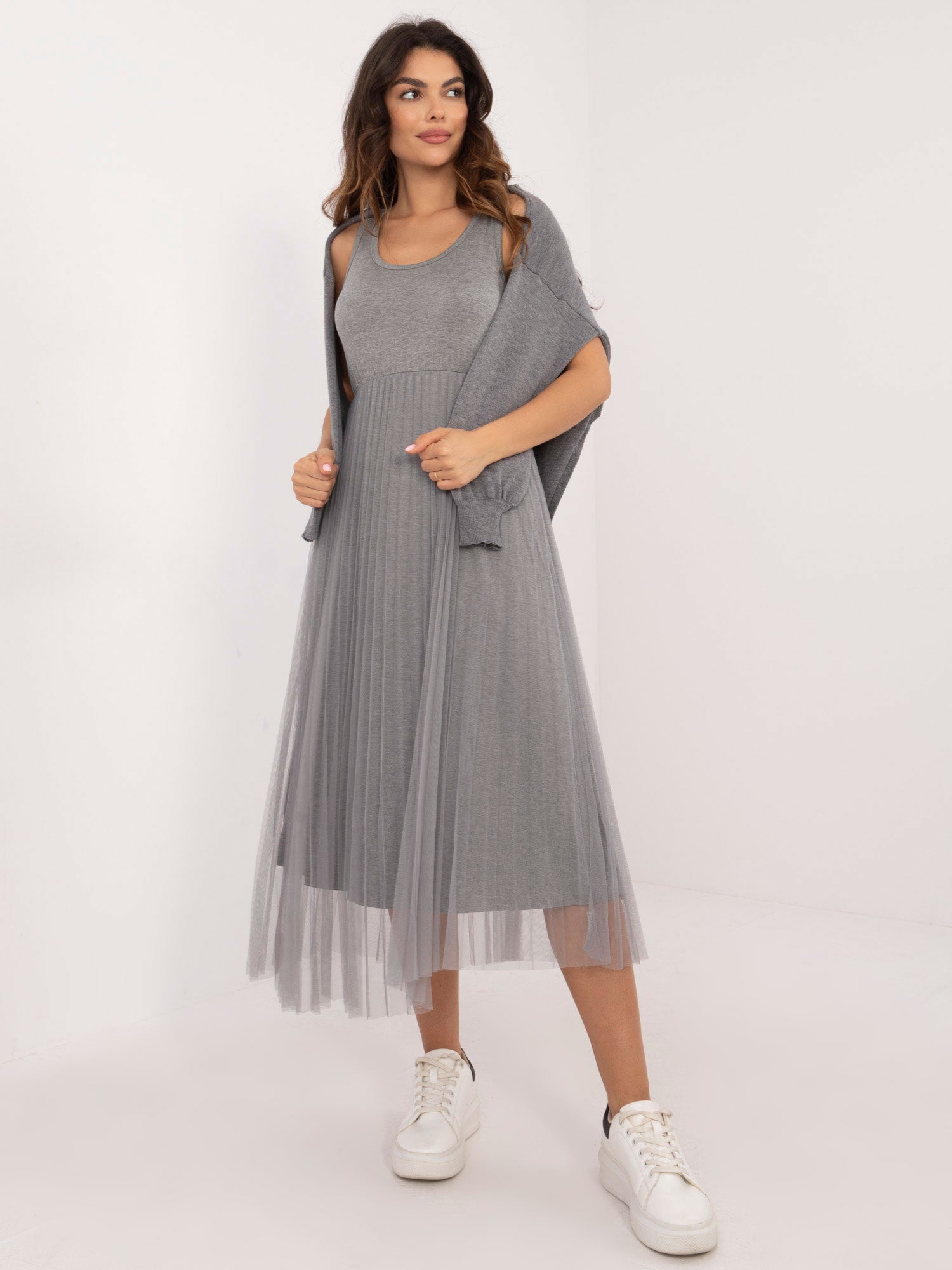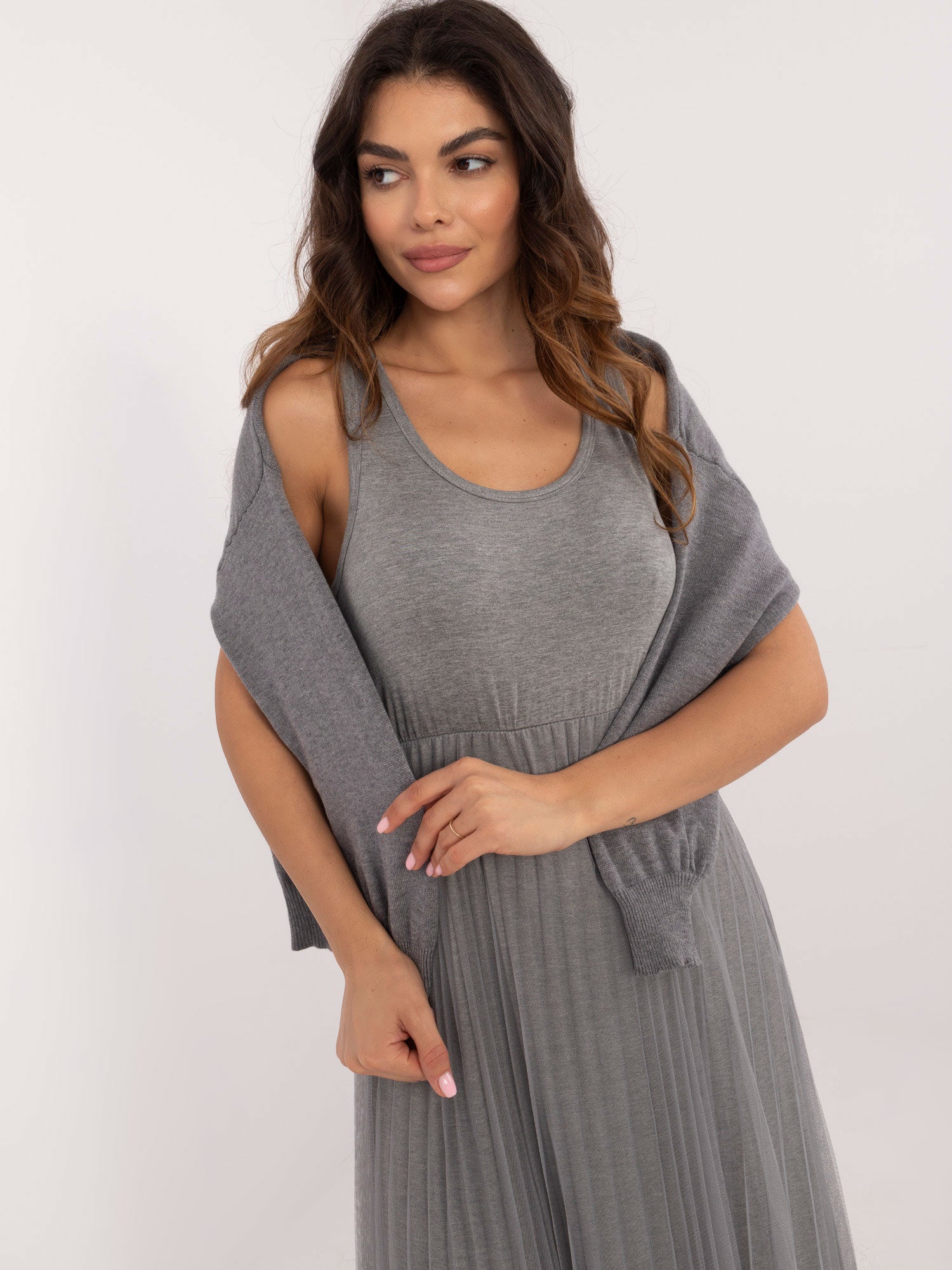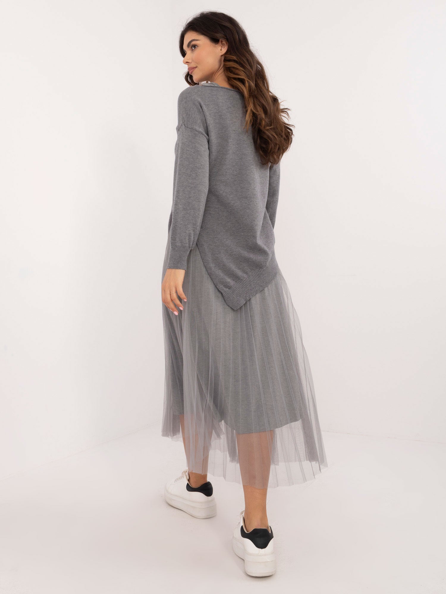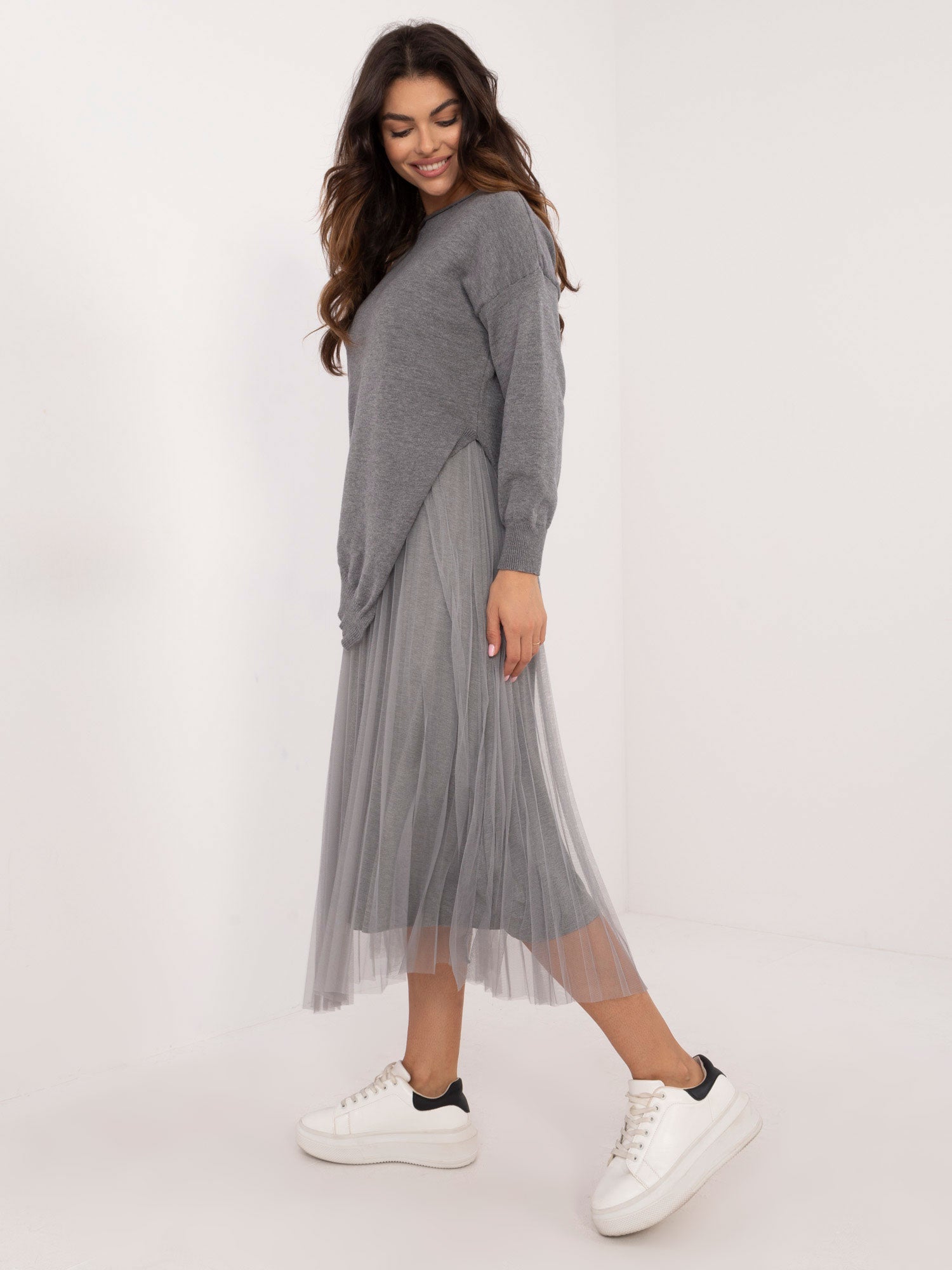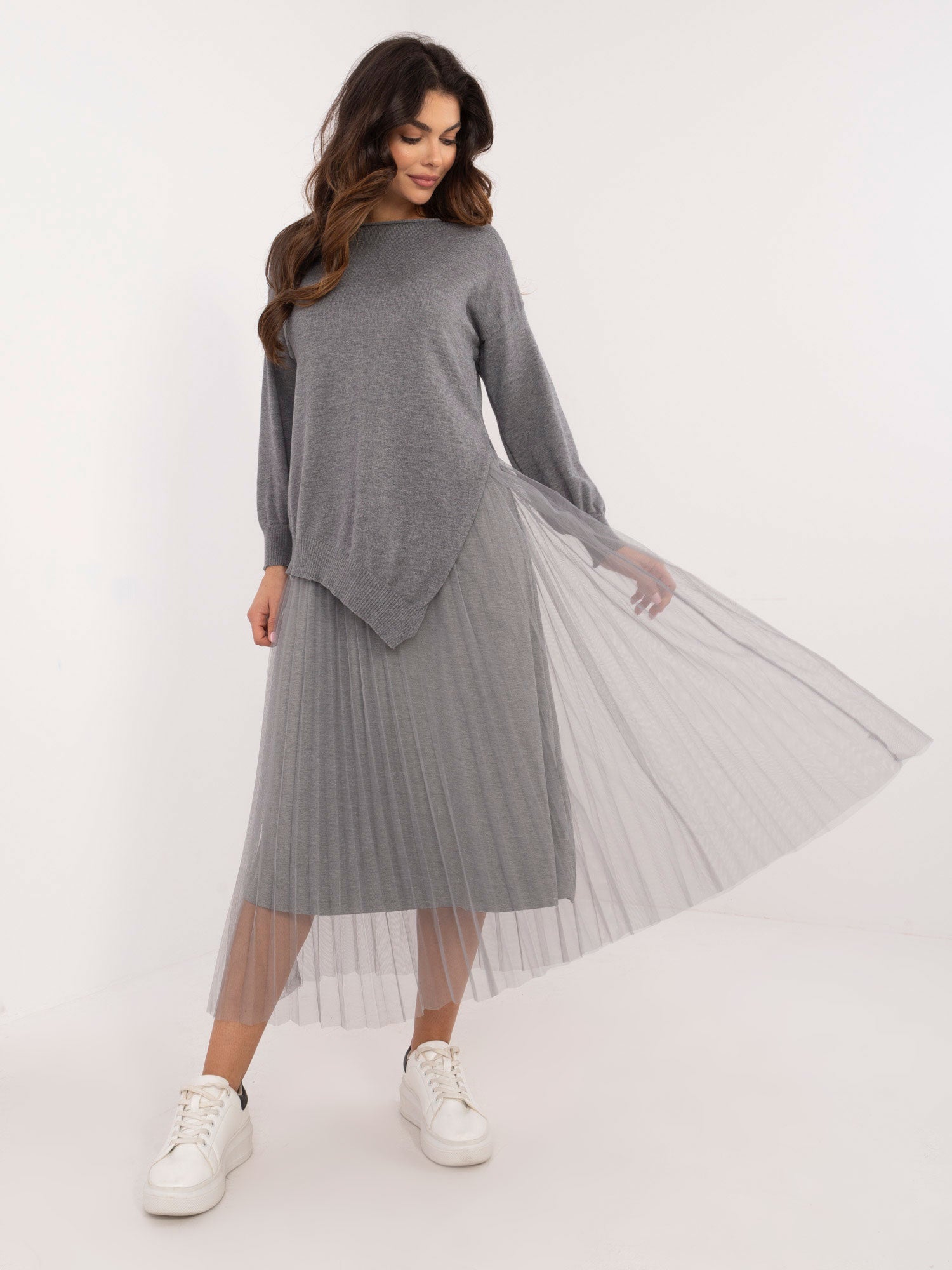 Wymiary kompletu w rozmiarze one size mierzone na płasko: szerokość swetra pod pachami - 45 cm, długość swetra - 77 cm, długość rękawa - 54 cm, szerokość sukienki pod pachami - 33 cm, długość sukienki - 127 cm.
