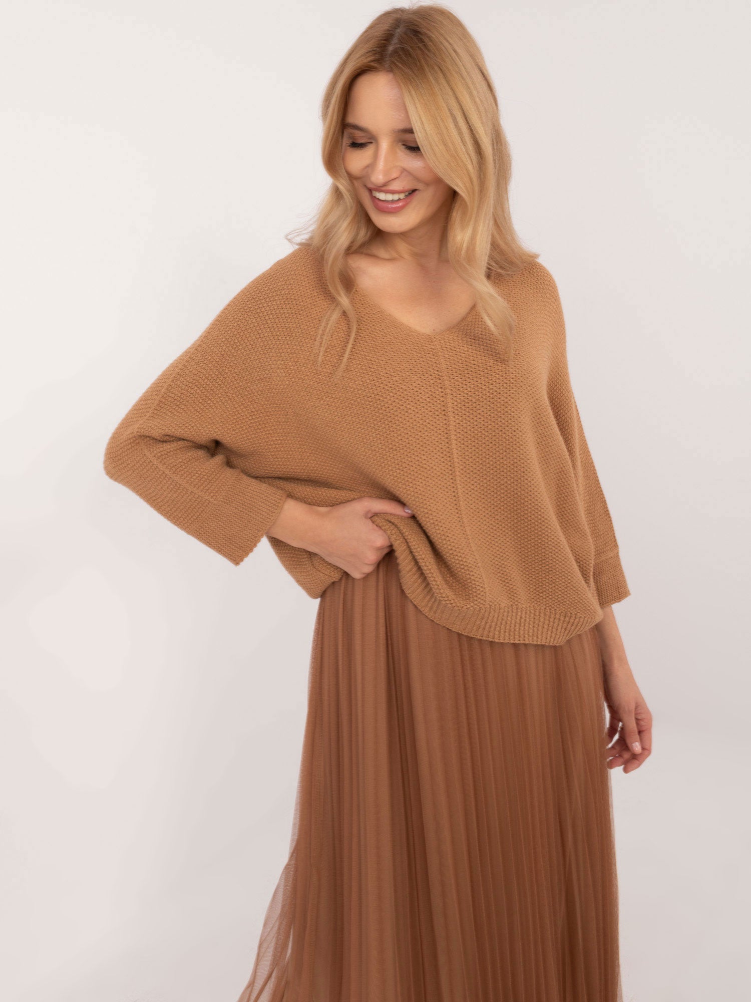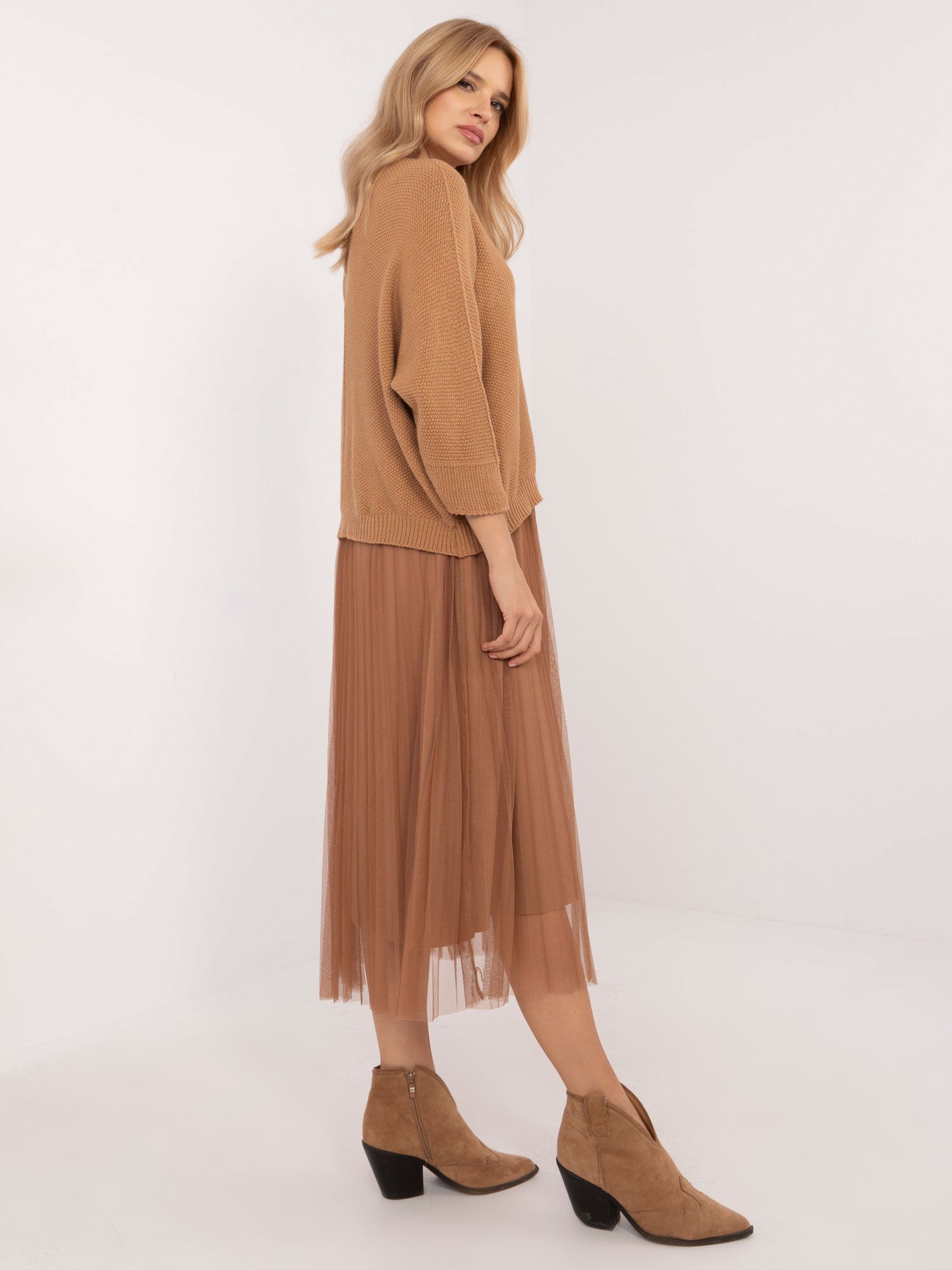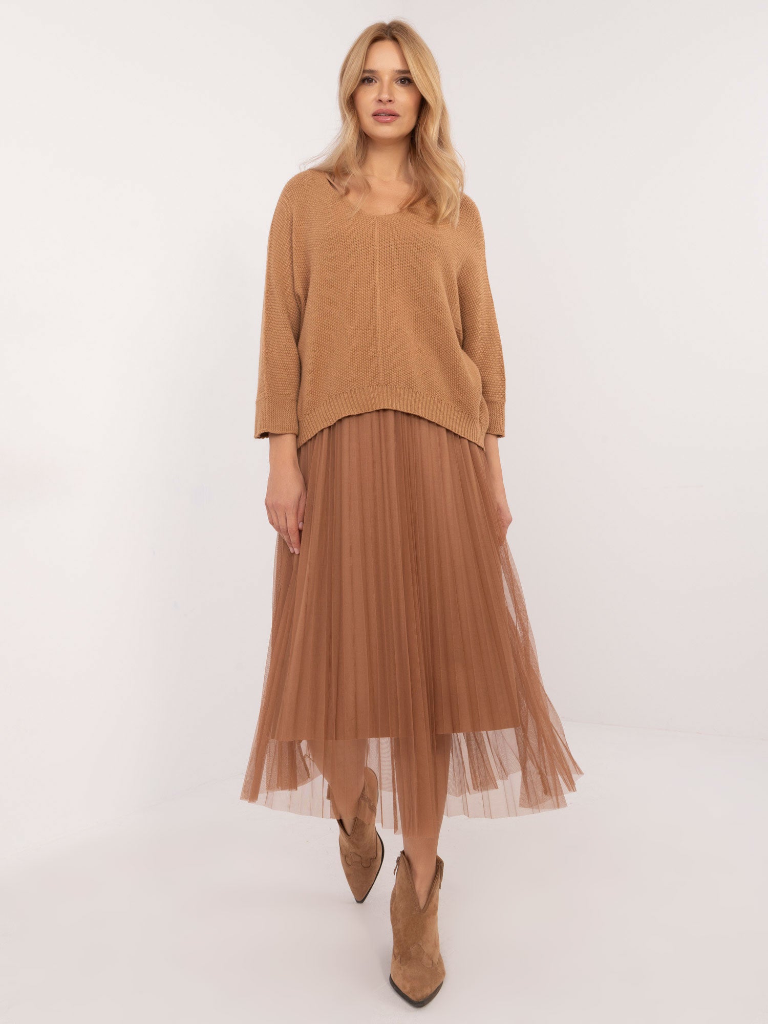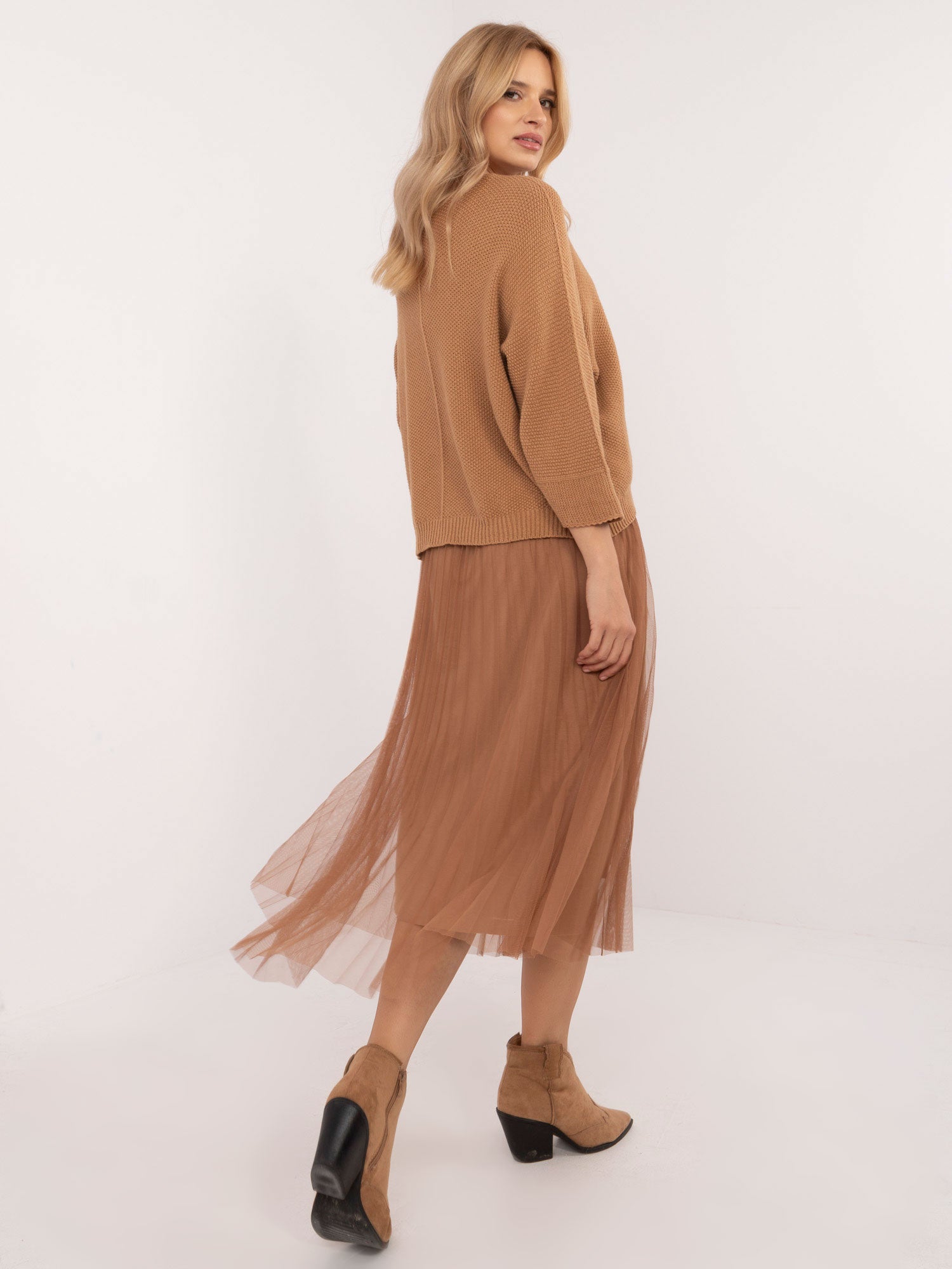 Wymiary kompletu w rozmiarze one size mierzone na płasko: szerokość swetra pod pachami - 62 cm, długość swetra - 55 cm, długość rękawa - 50 cm, szerokość sukienki pod pachami - 44 cm, długość sukienki - 124 cm.