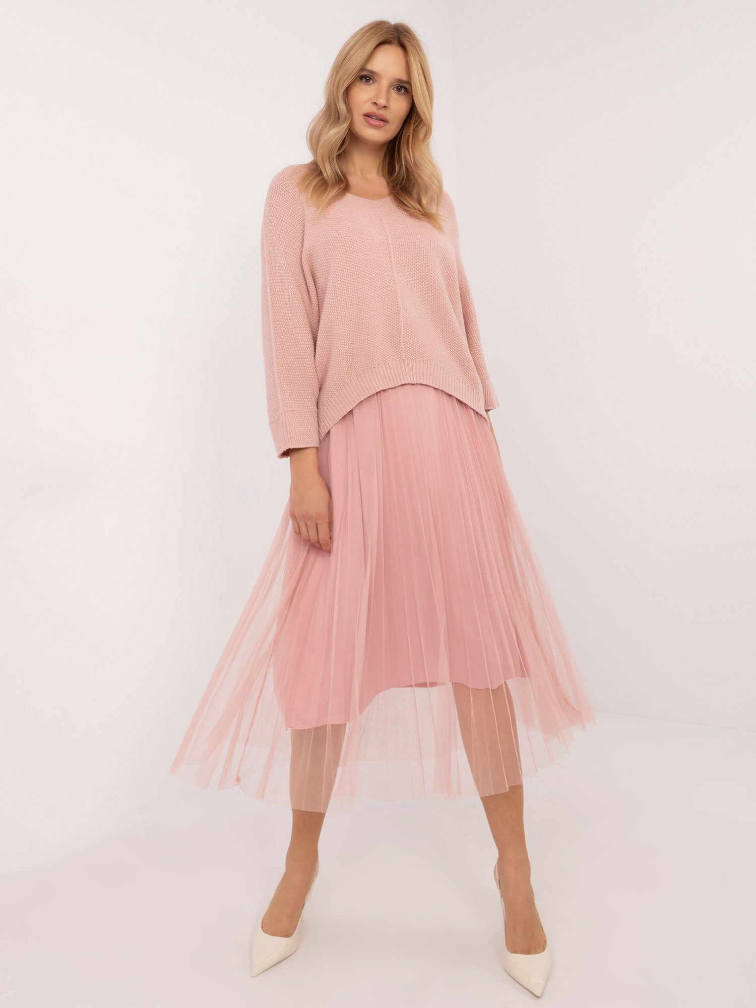 Wymiary kompletu w rozmiarze one size mierzone na płasko: szerokość swetra pod pachami - 62 cm, długość swetra - 55 cm, długość rękawa - 50 cm, szerokość sukienki pod pachami - 44 cm, długość sukienki - 124 cm.