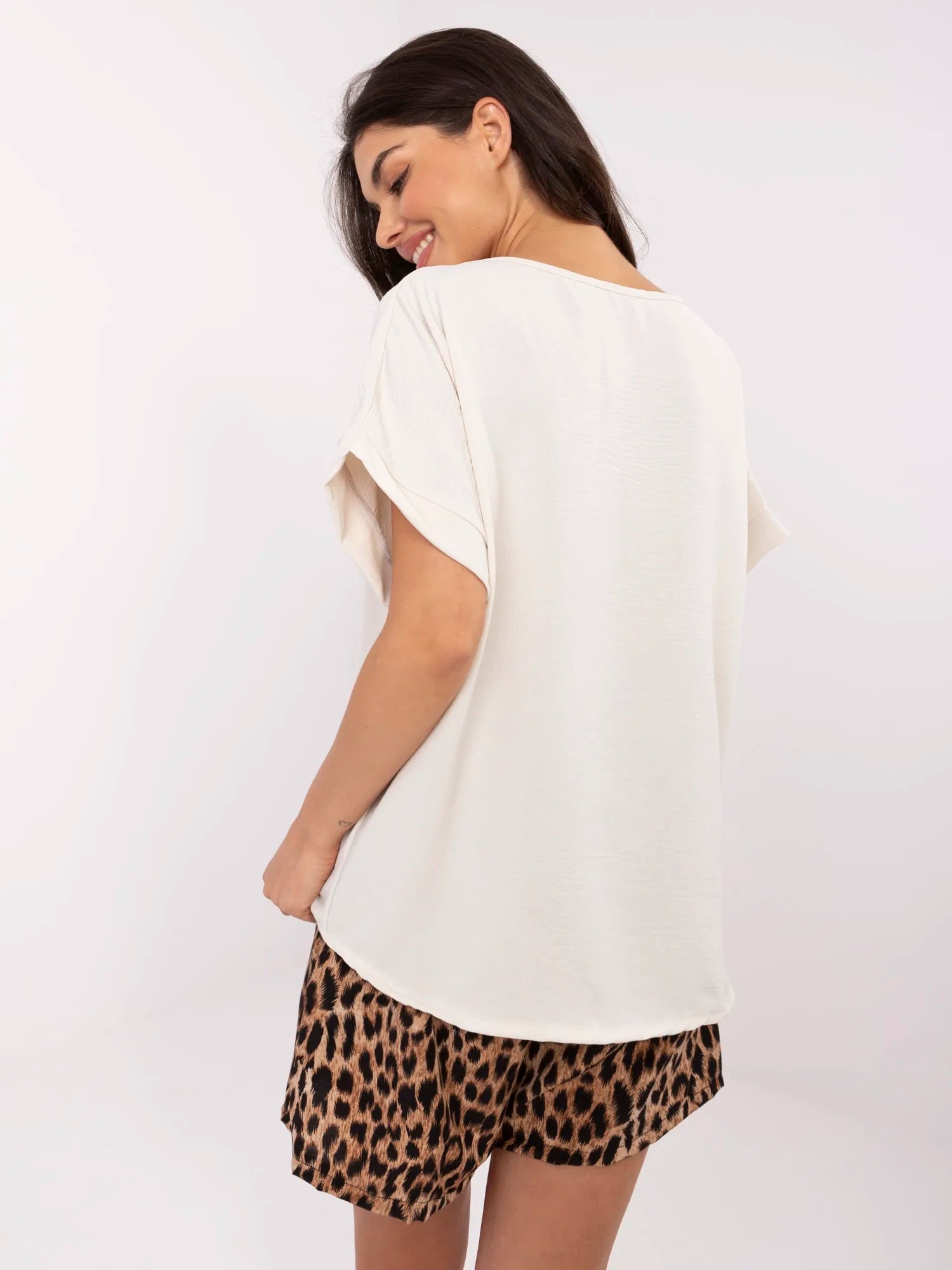 Wymiary bluzki w rozmiarze one size. mierzone na płasko: szerokość pod pachami - 61 cm, szerokość w biodrach - 56 cm, długość rękawa - 26 cm, długość całkowita - 68 cm.