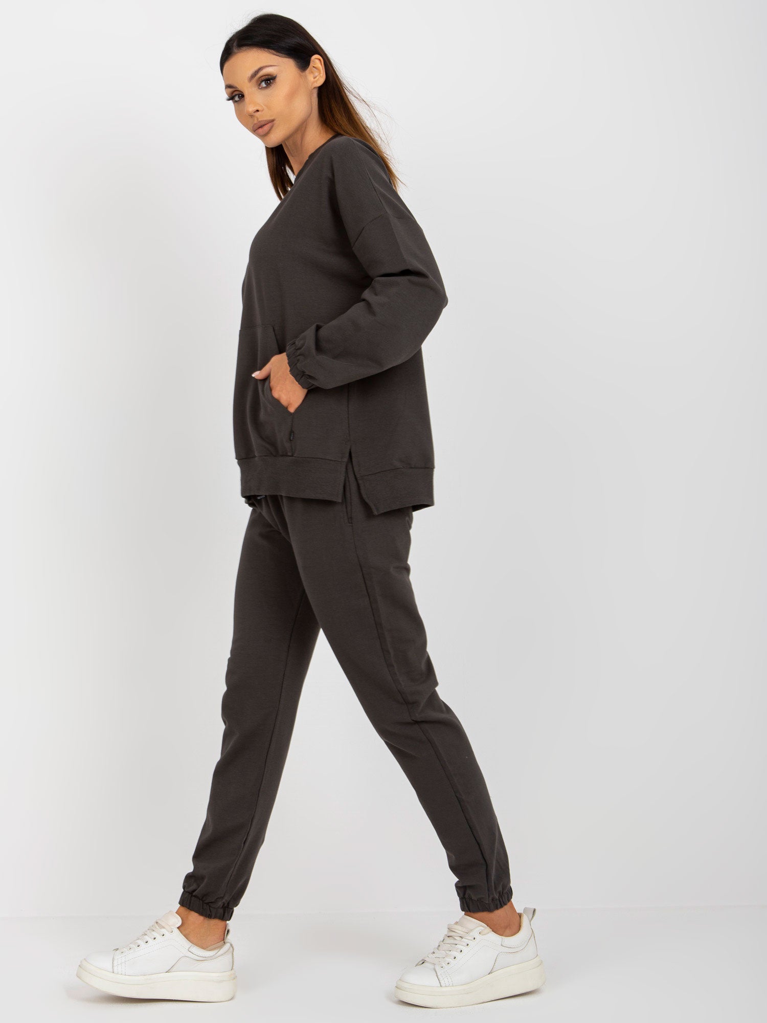 Khaki bawełniany komplet basic z bluzą bez kaptura .