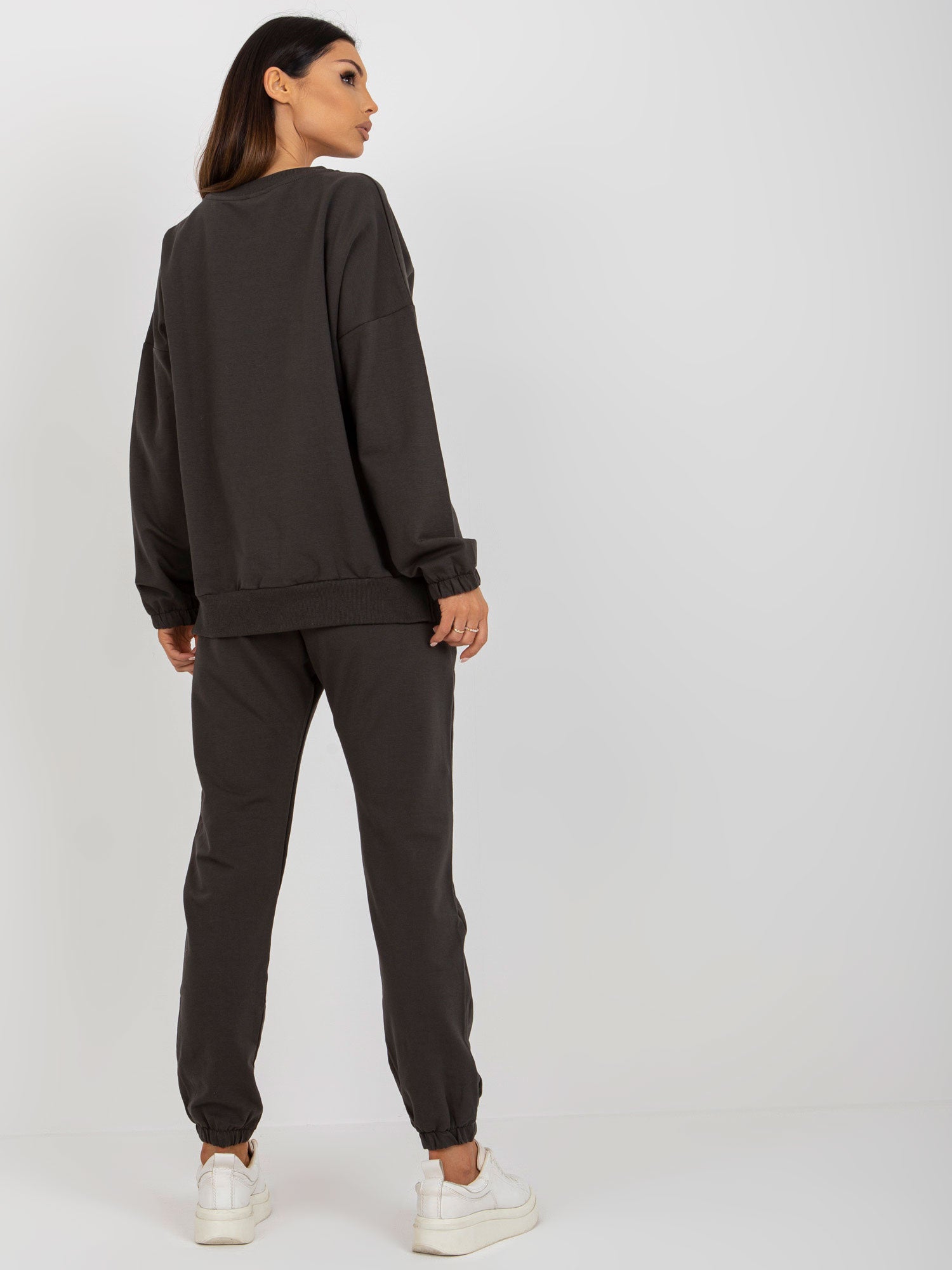 Wymiary kompletu w rozmiarze S/M mierzone na płasko: szerokość bluzy pod pachami - 65 cm, długość rękawa - 60 cm, długość bluzy - 67 cm, szerokość spodni w pasie - 37 cm, wysokość stanu - 30 cm, długość spodni - 94 cm.