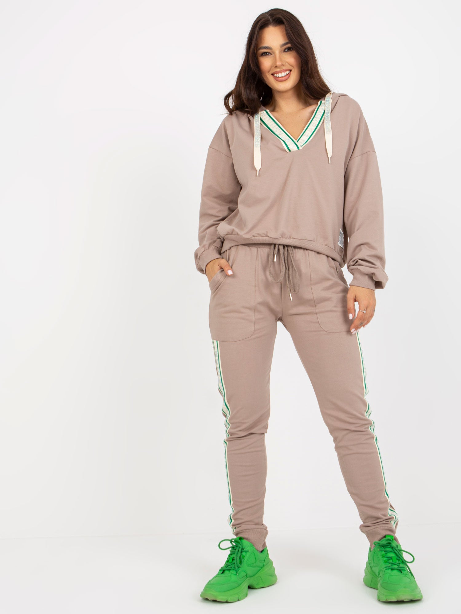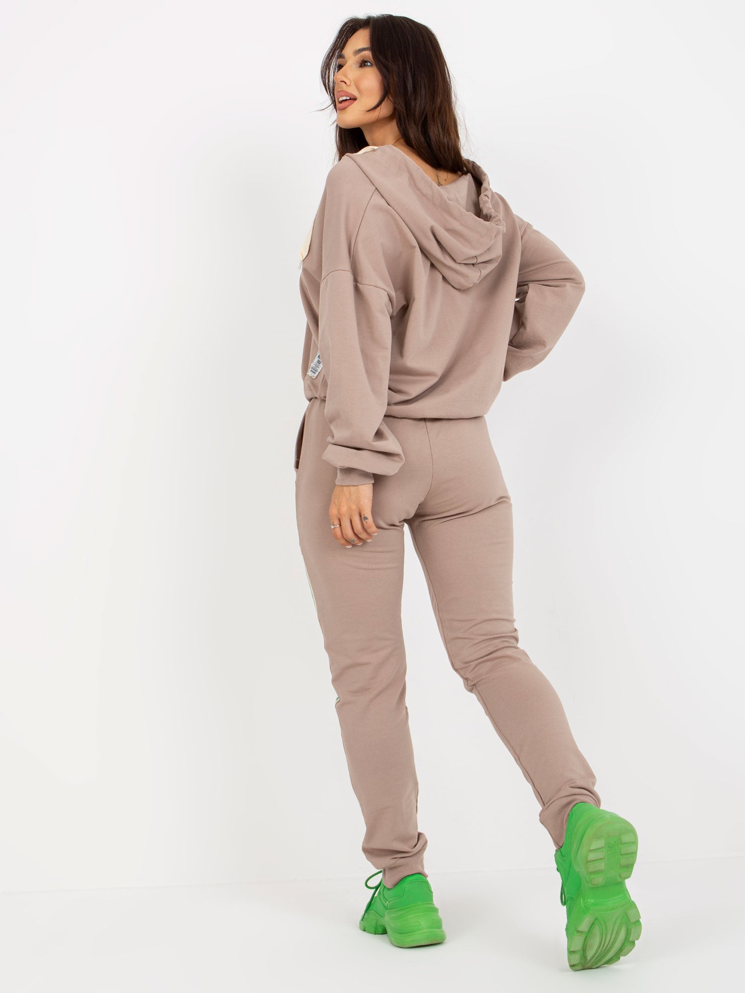 Ciemnobeżowy damski komplet casualowy z aplikacją .