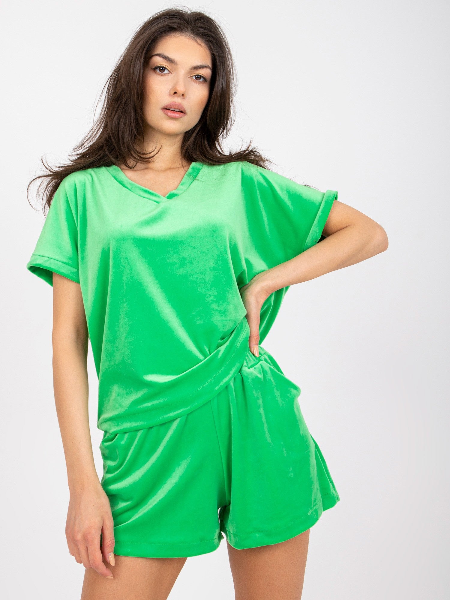 Wymiary kompletu w rozmiarze S mierzone na płasko: szerokość bluzki pod pachami - 57 cm, długość bluzki - 54 cm, szerokość szortów w pasie - 33 cm, wysokość stanu - 32 cm, długość szortów - 35 cm.