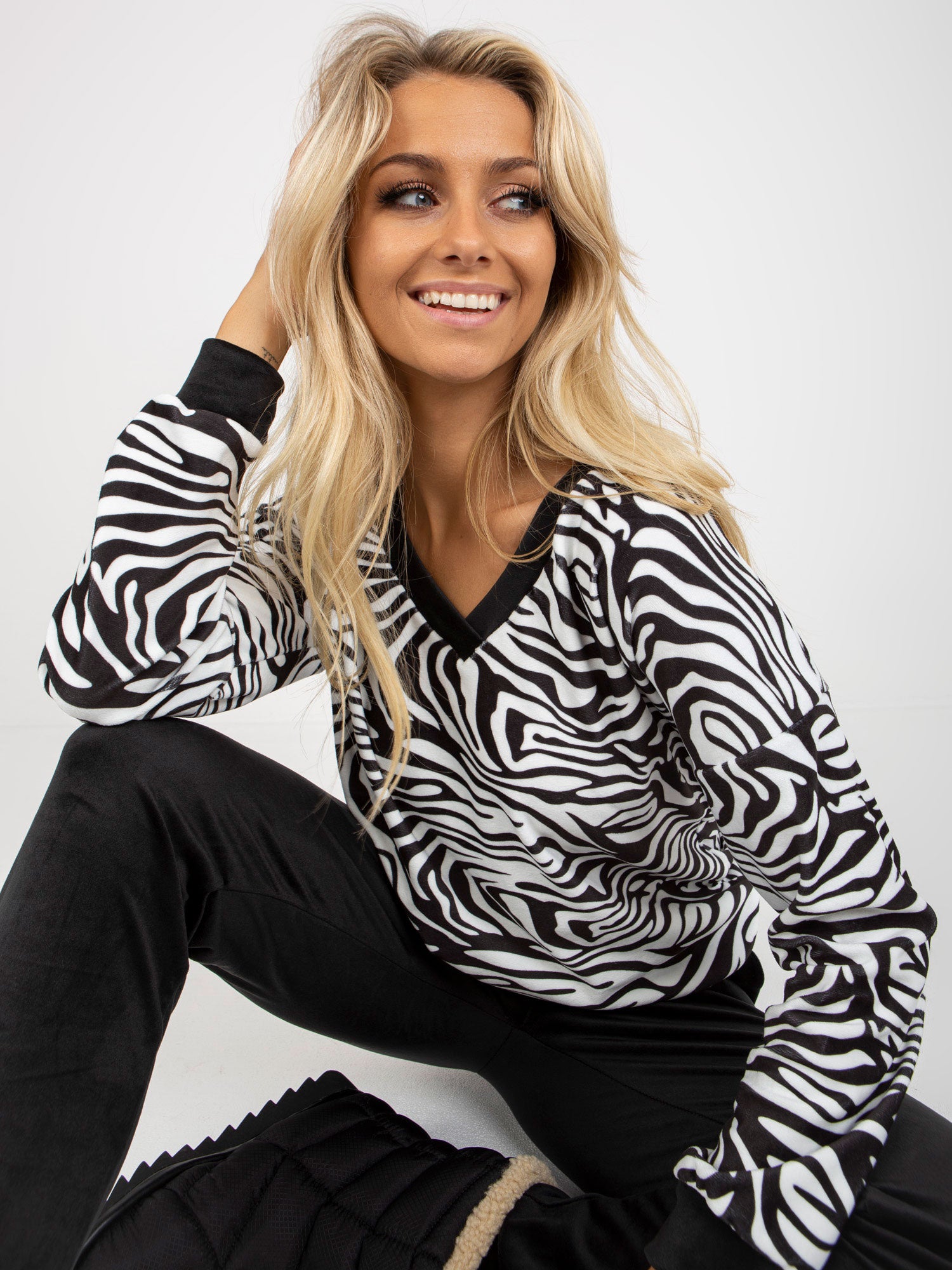 Biało-czarny komplet welurowy z bluzą w zebrę RUE PARIS .