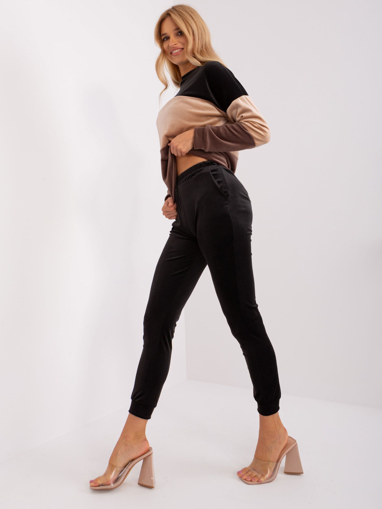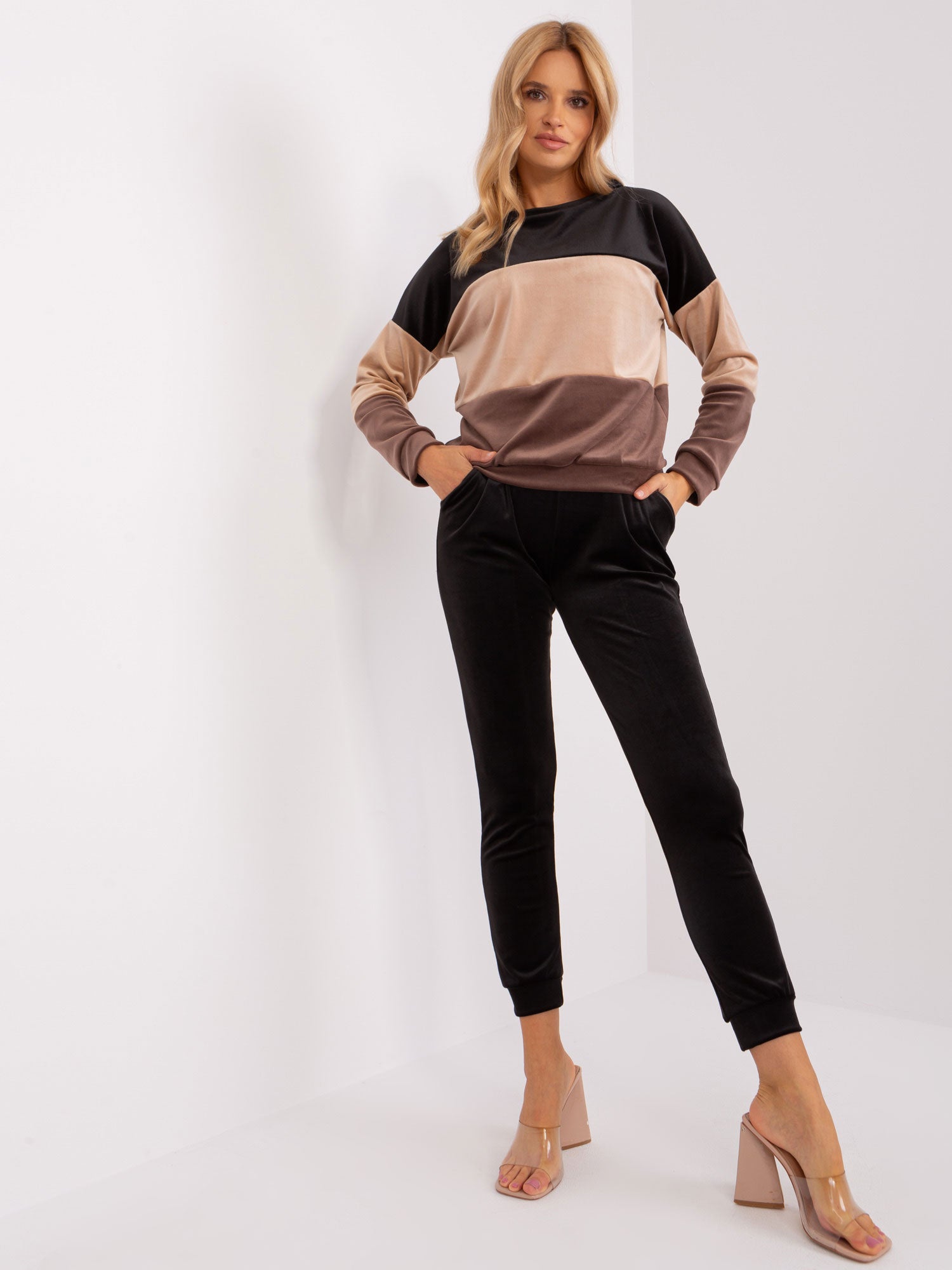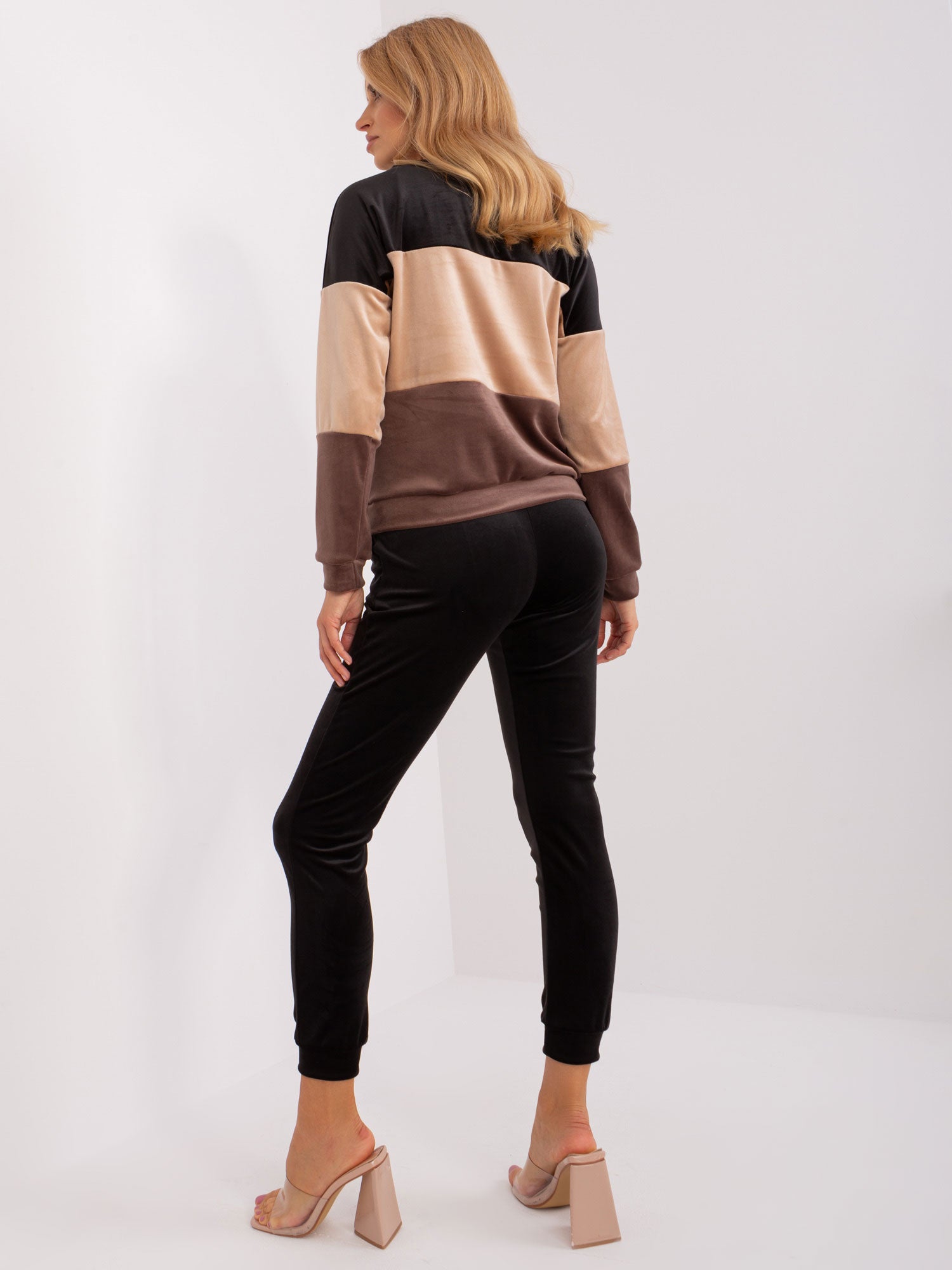 Czarno-brązowy komplet welurowy ze spodniami RUE PARIS.