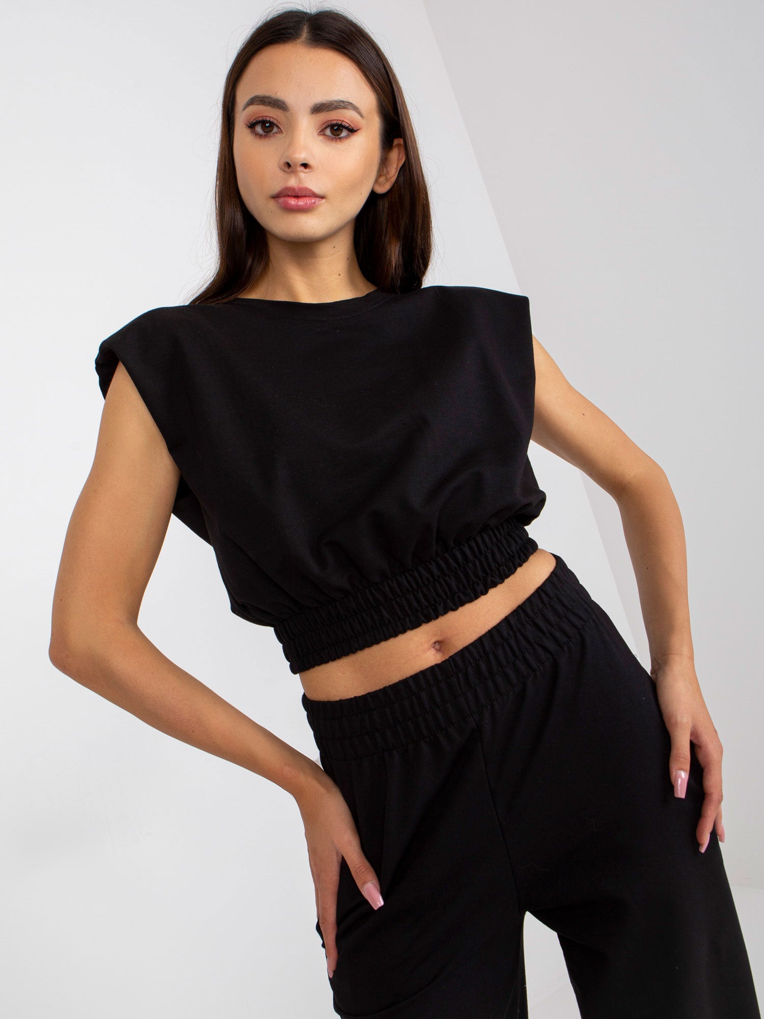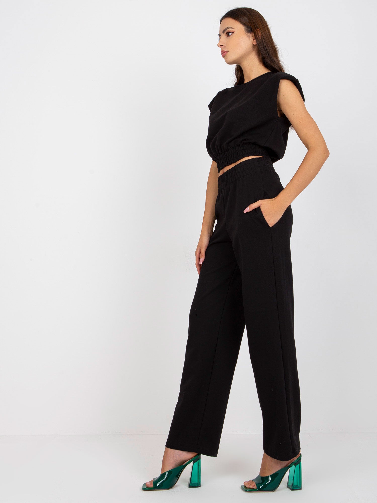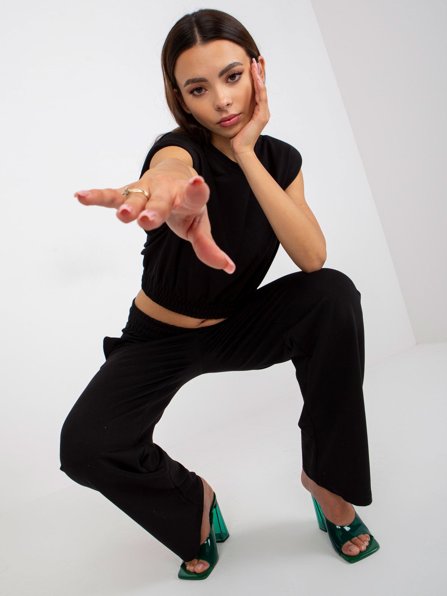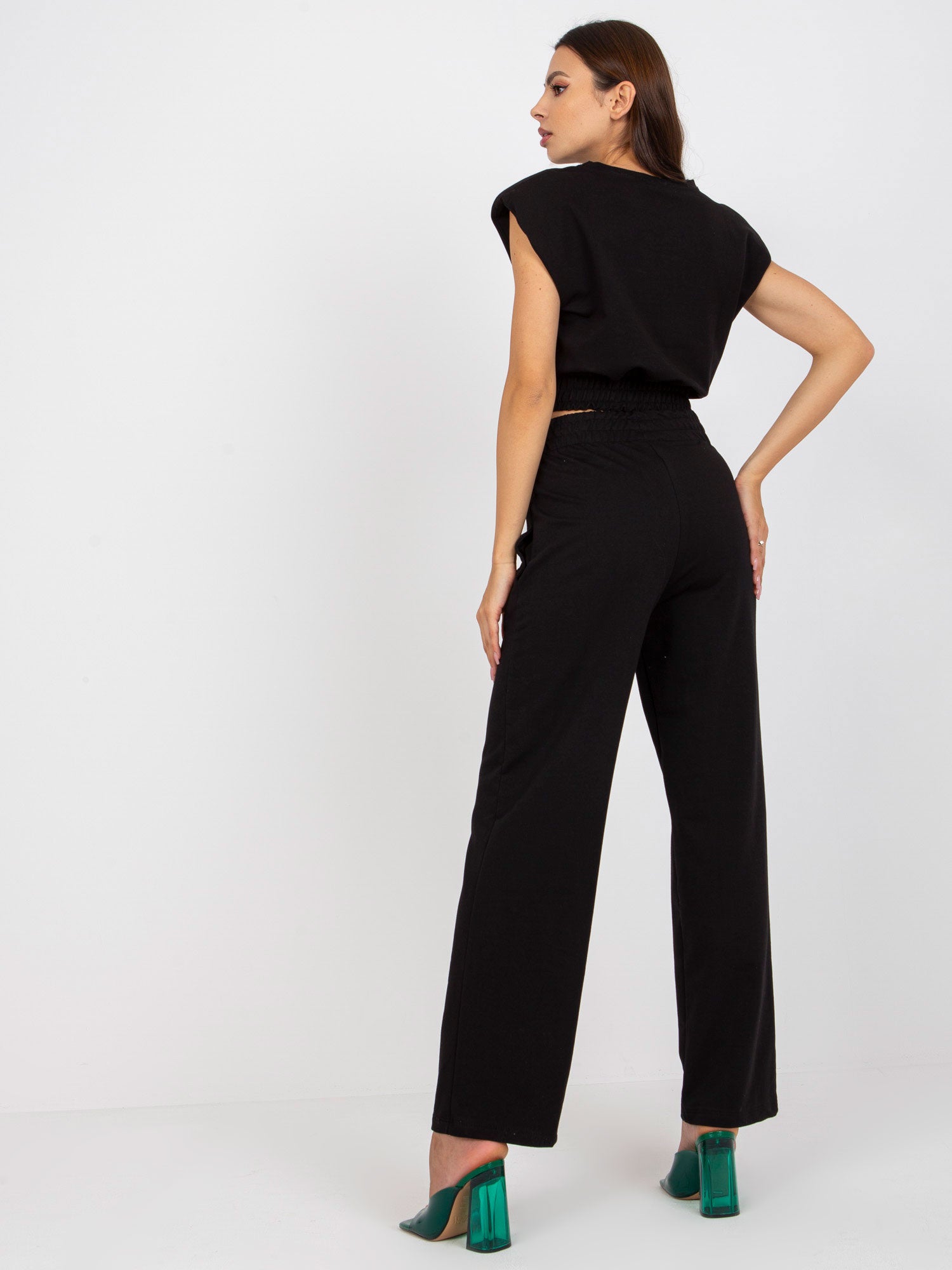 Wymiary kompletu w rozmiarze S mierzone na płasko: szerokość bluzki pod pachami - 47 cm, długość bluzki - 44 cm, szerokość spodni w pasie - 34 cm, wysokość stanu - 31 cm, długość spodni - 103 cm.