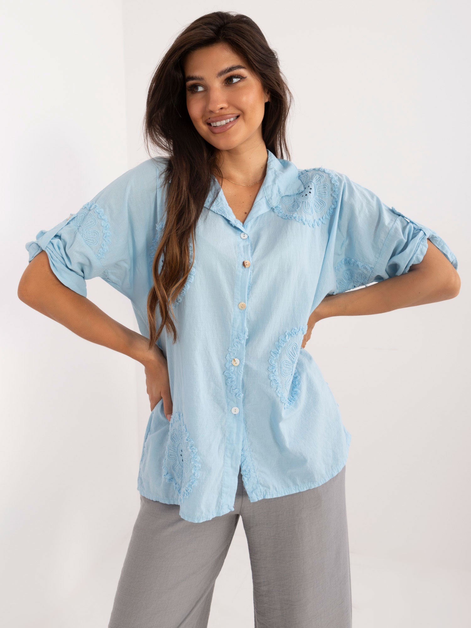 Wymiary koszuli w rozmiarze one size mierzone na płasko: szerokość pod pachami - 60 cm, długość rękawa - 38 cm, długość całkowita - 71 cm..