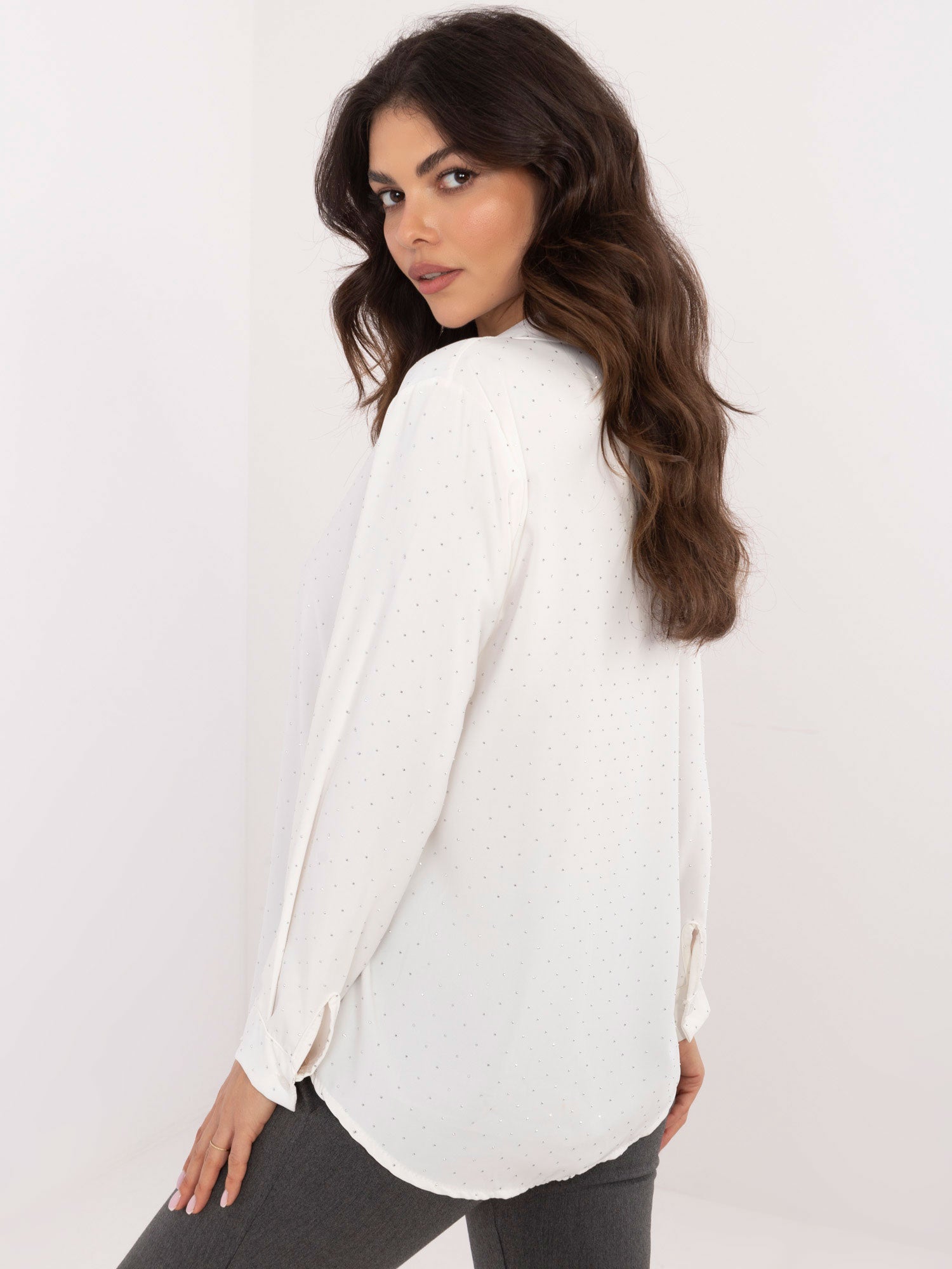 Wymiary koszuli w rozmiarze one size mierzone na płasko: szerokość pod pachami - 52 cm, szerokość w biodrach - 56 cm, długość rękawa - 56 cm (od szwu), długość całkowita - 69 cm.