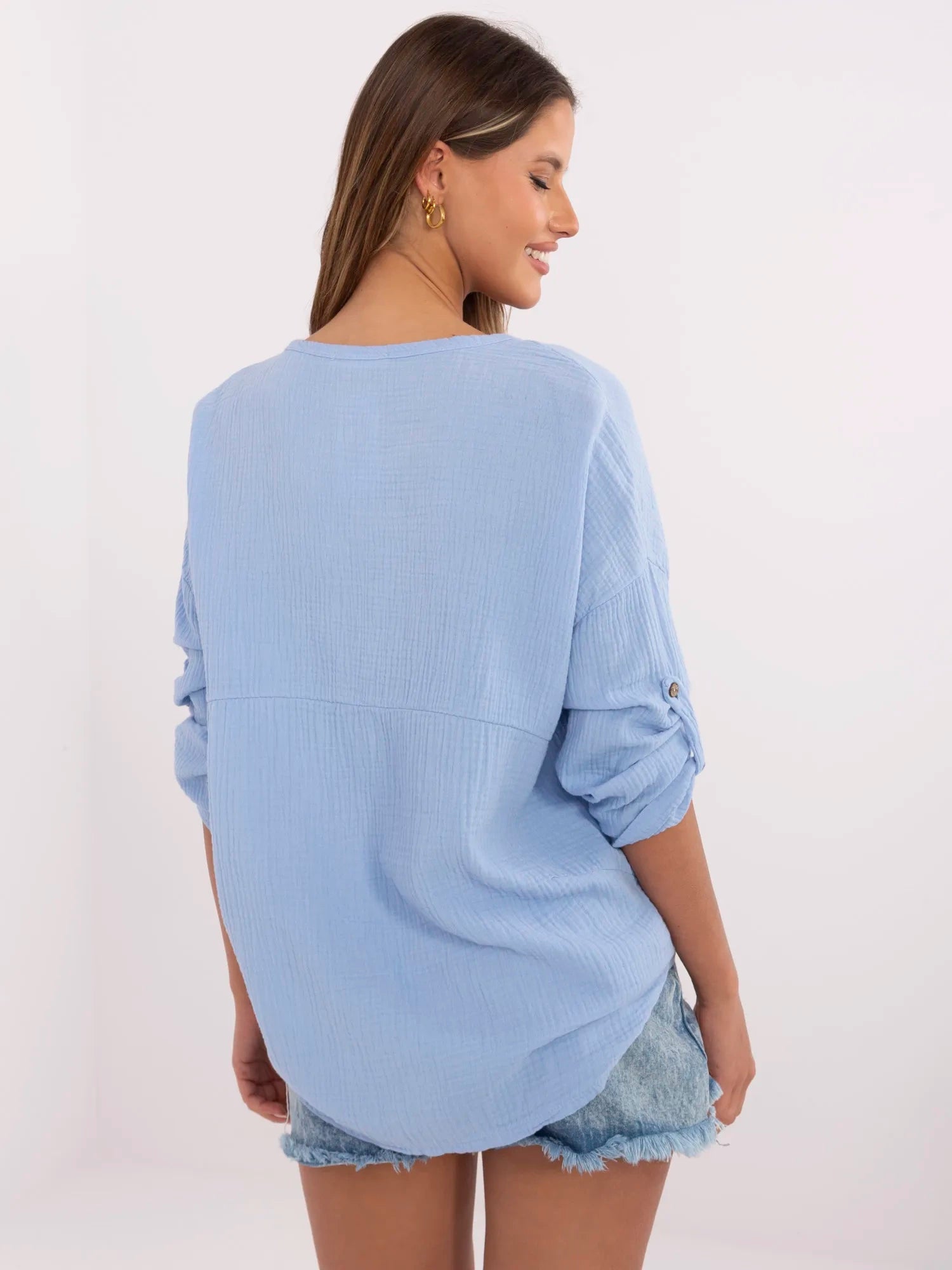 Wymiary koszuli w rozmiarze one size mierzone na płasko: szerokość pod pachami - 70 cm długość rękawa - 40 cm (od szwu), szerokość w biodrach - 70 cm, długość całkowita - 76 cm.