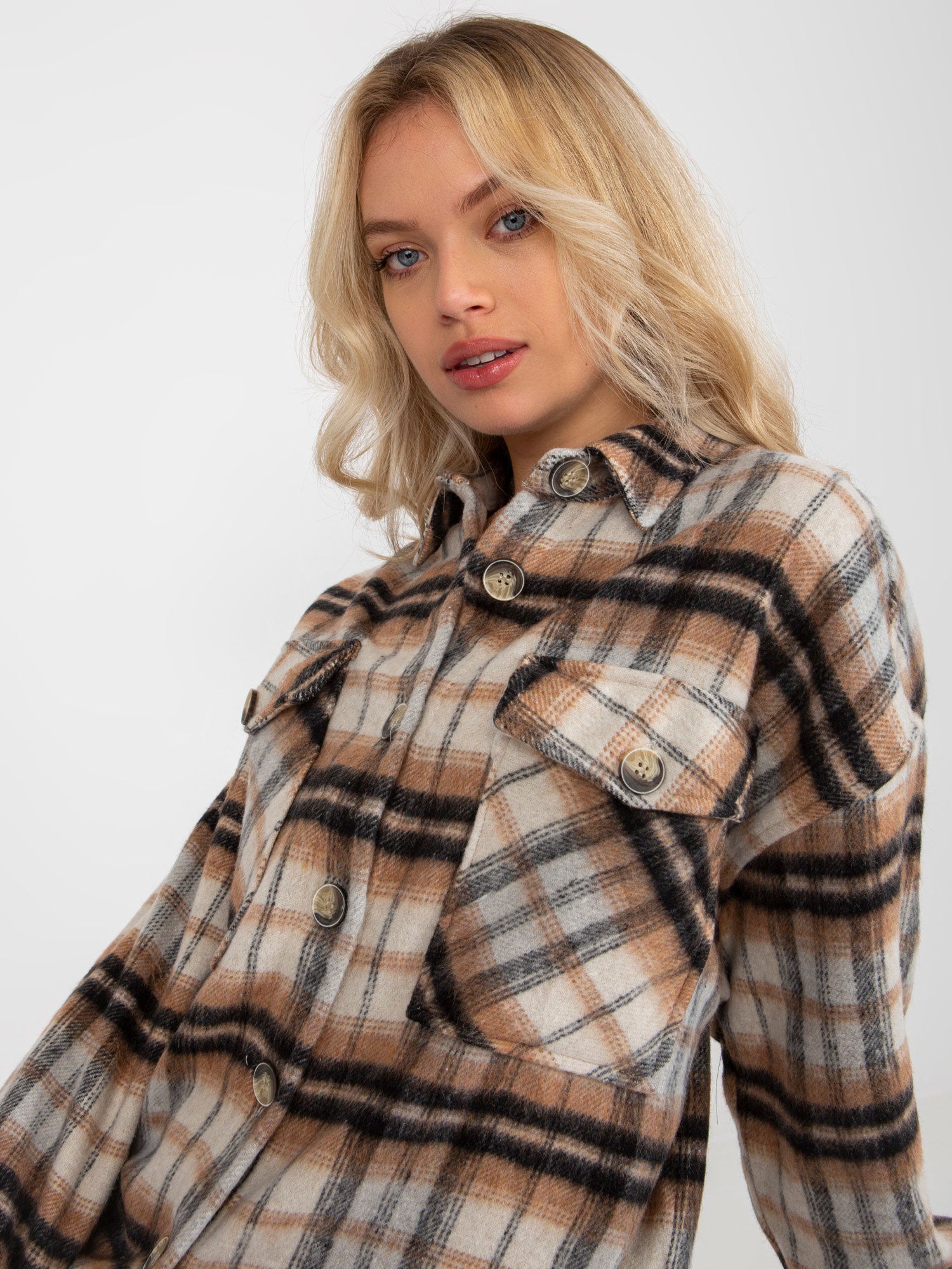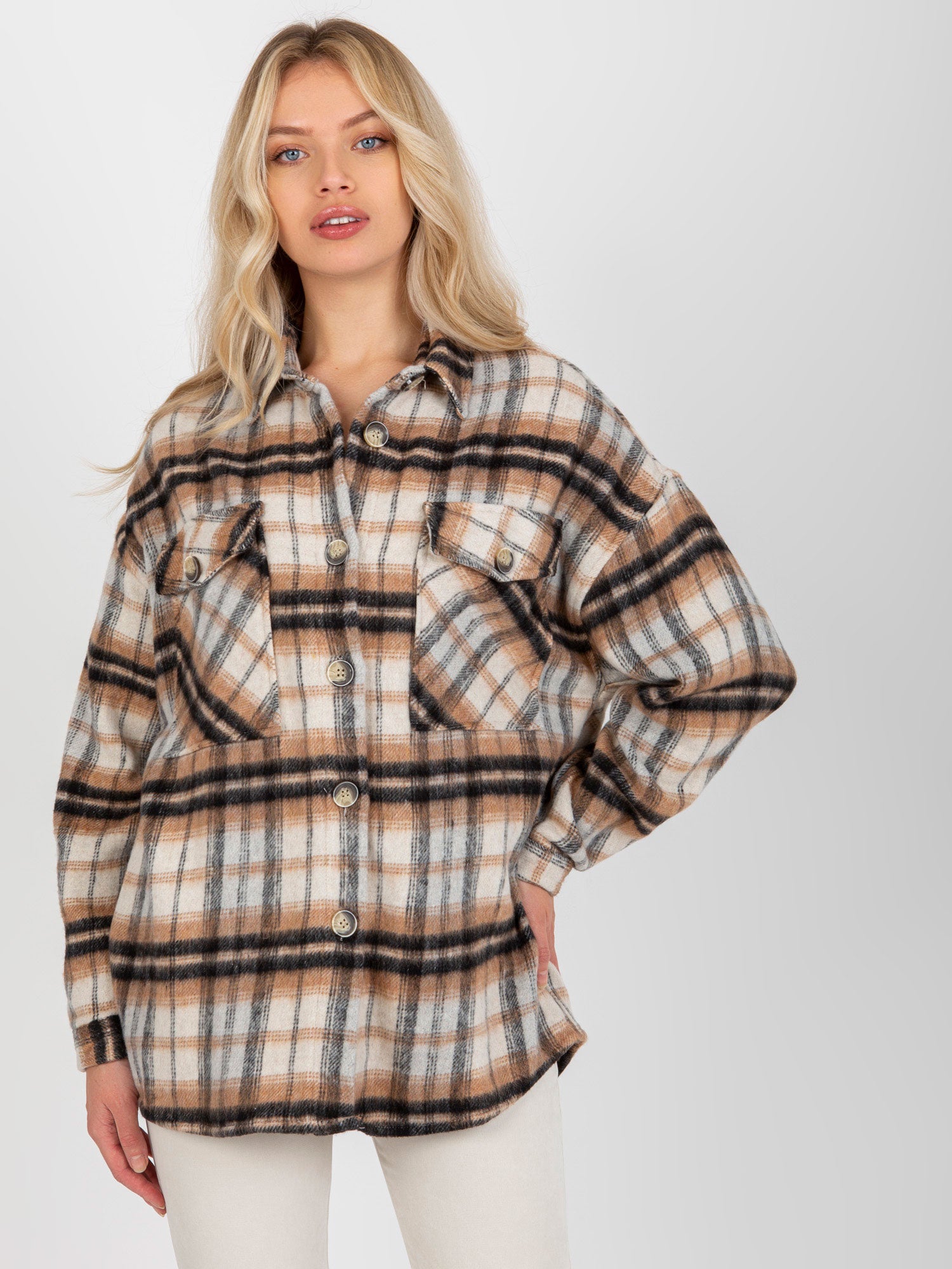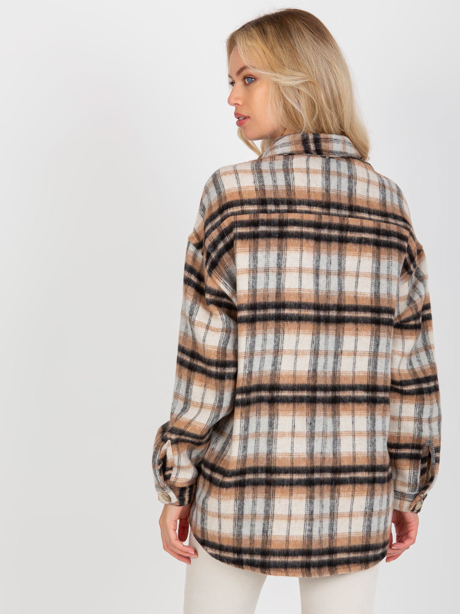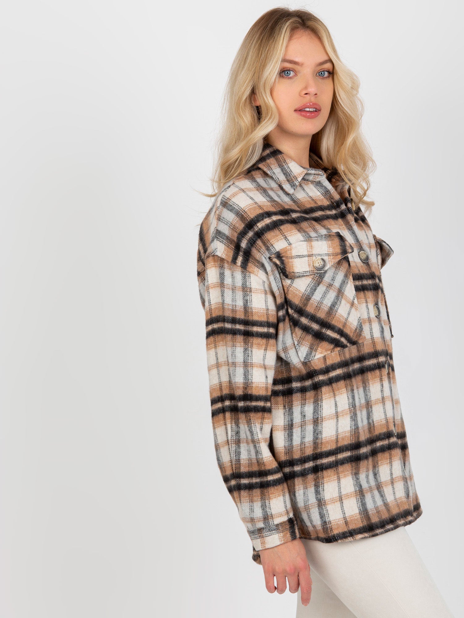 Beżowa ciepła koszula w kratę z zapięciem na guziki .