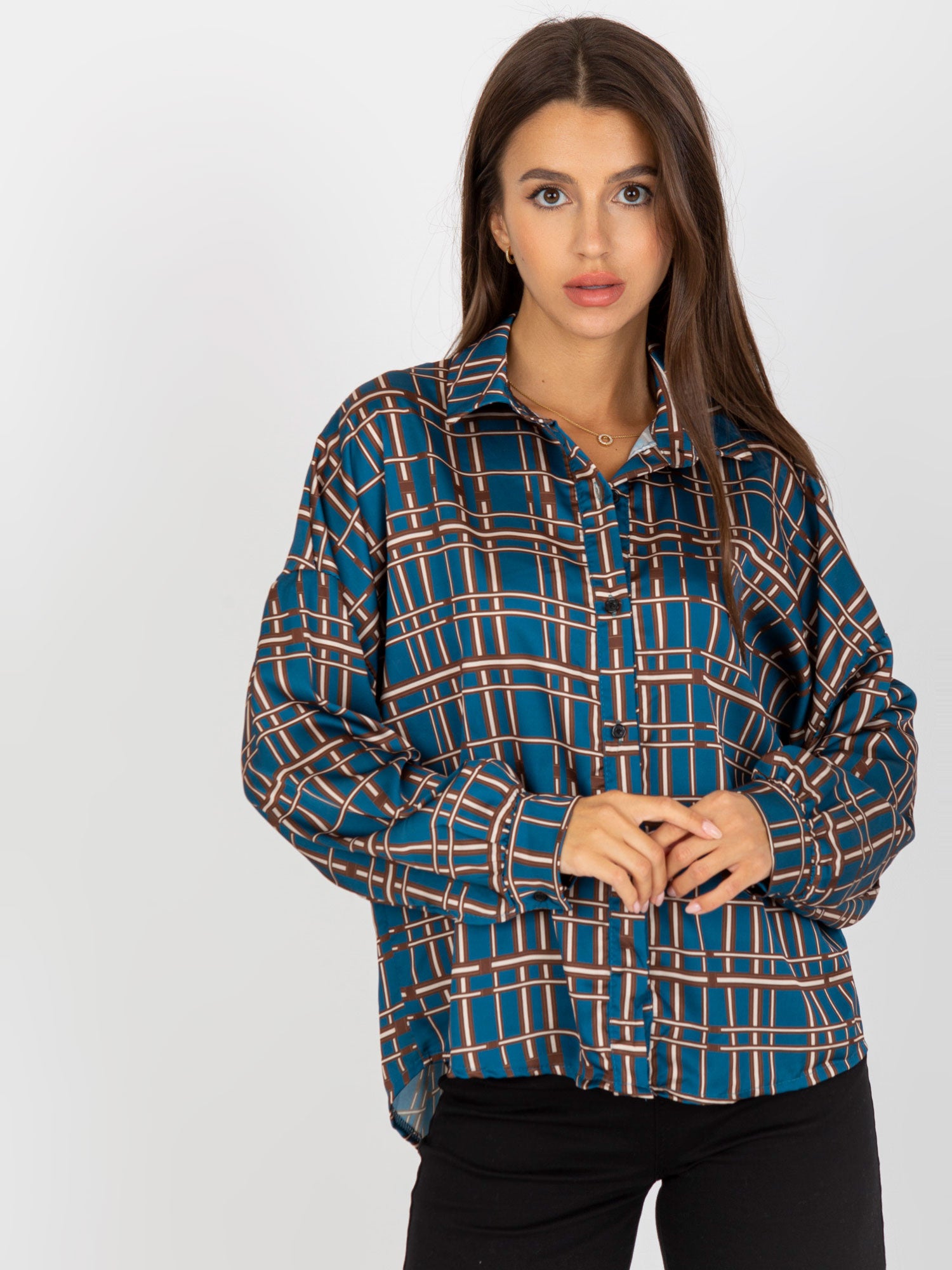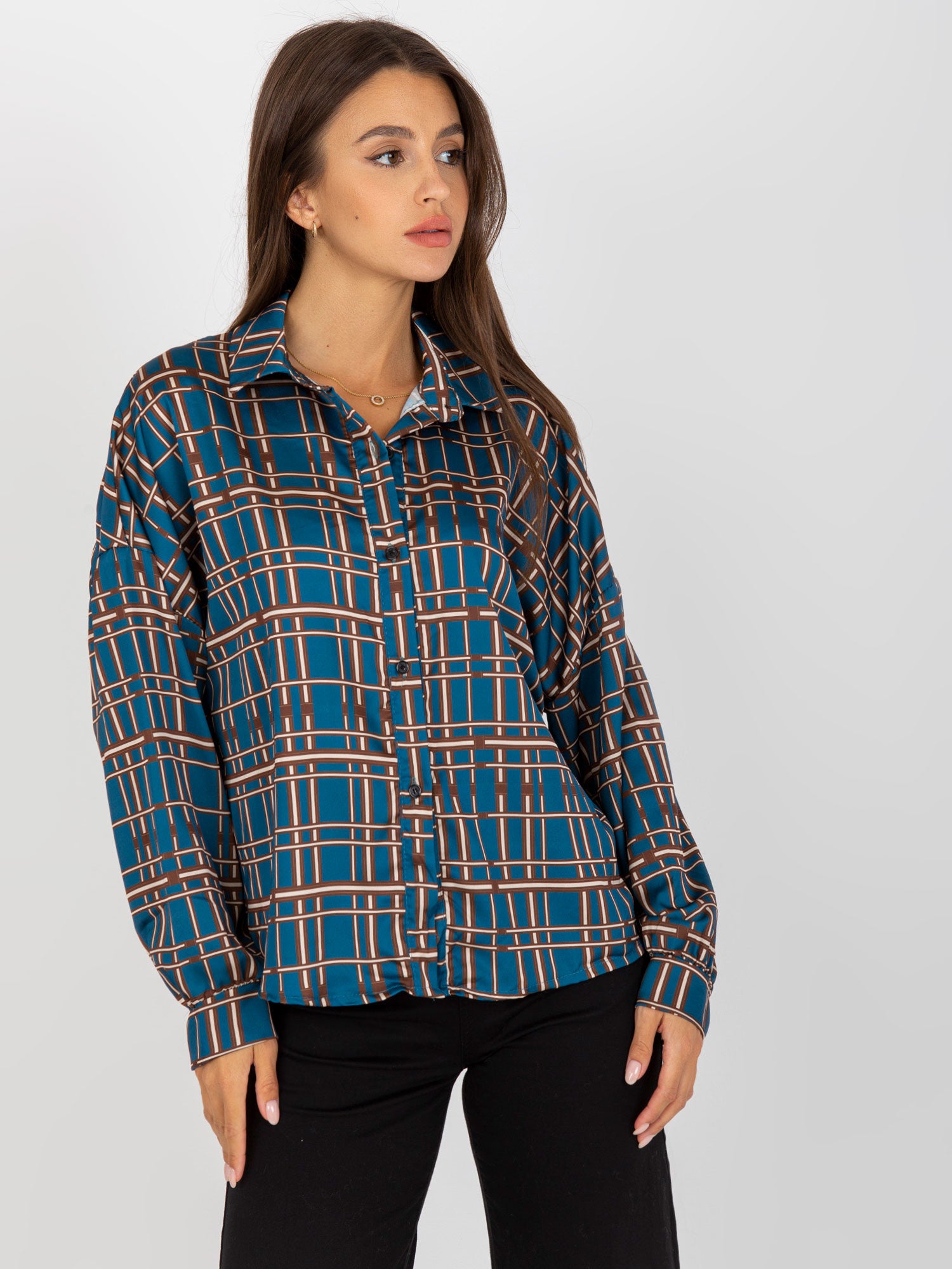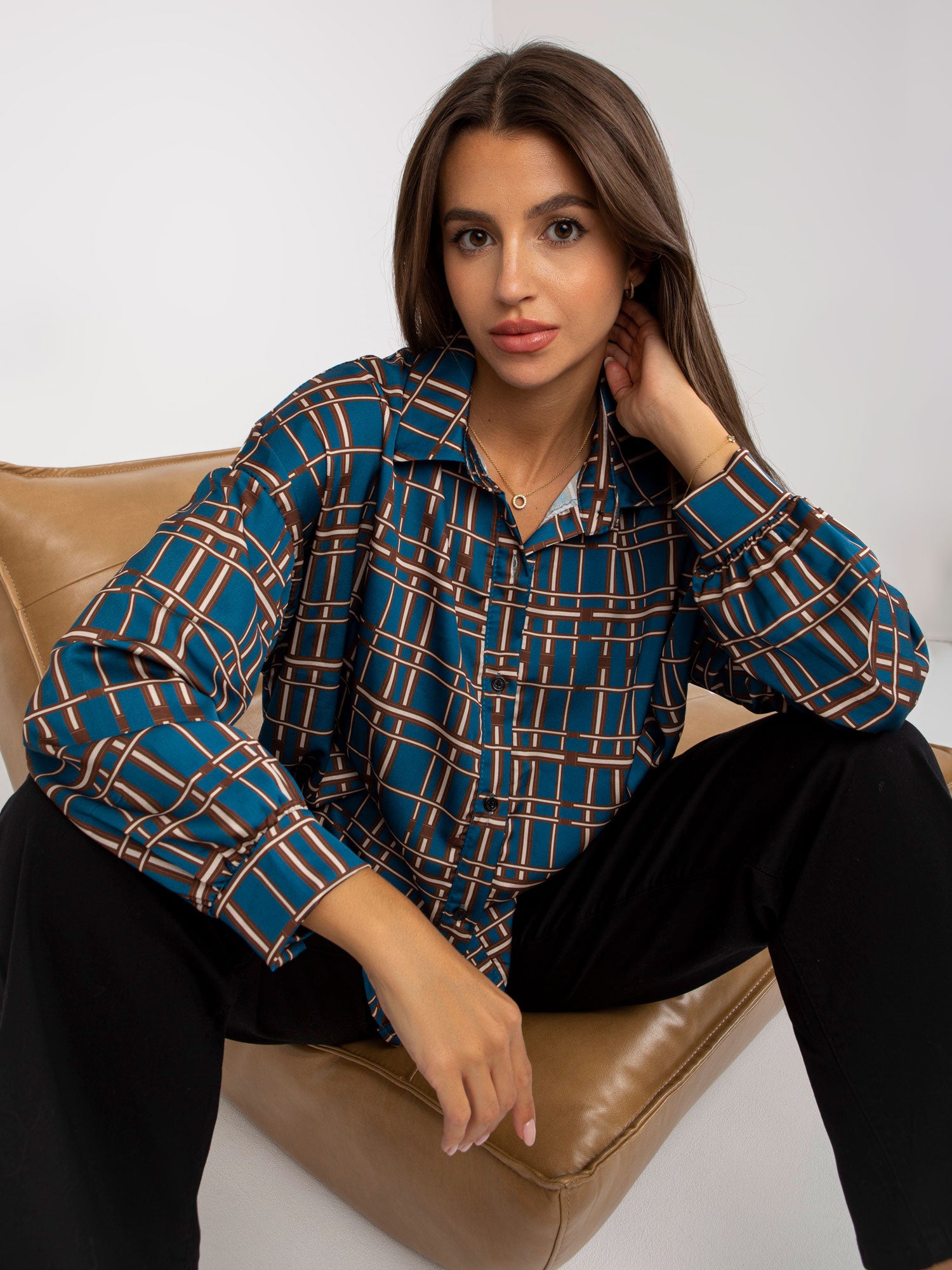Ciemnoniebieska koszula w kratę z długim rękawem.