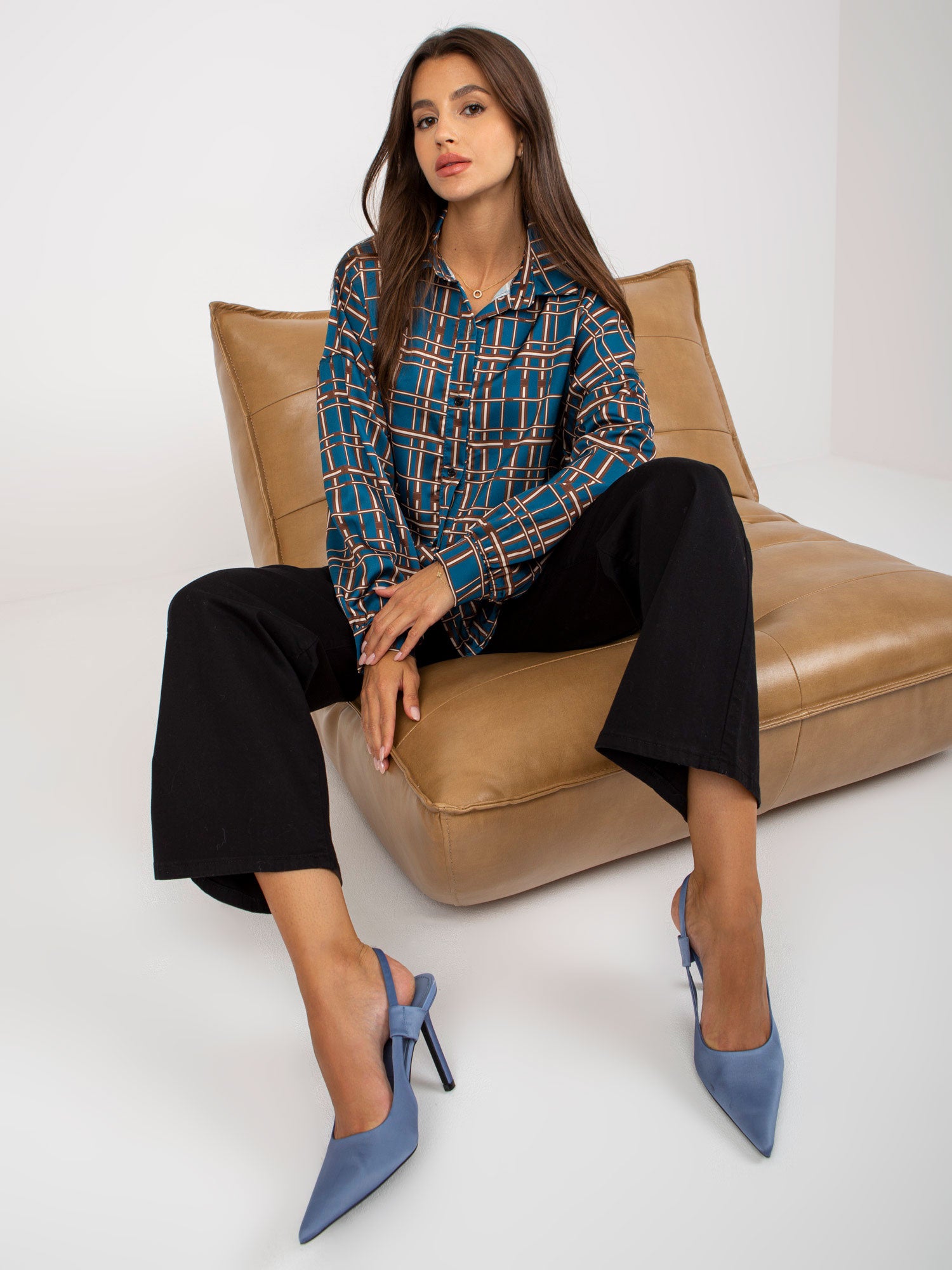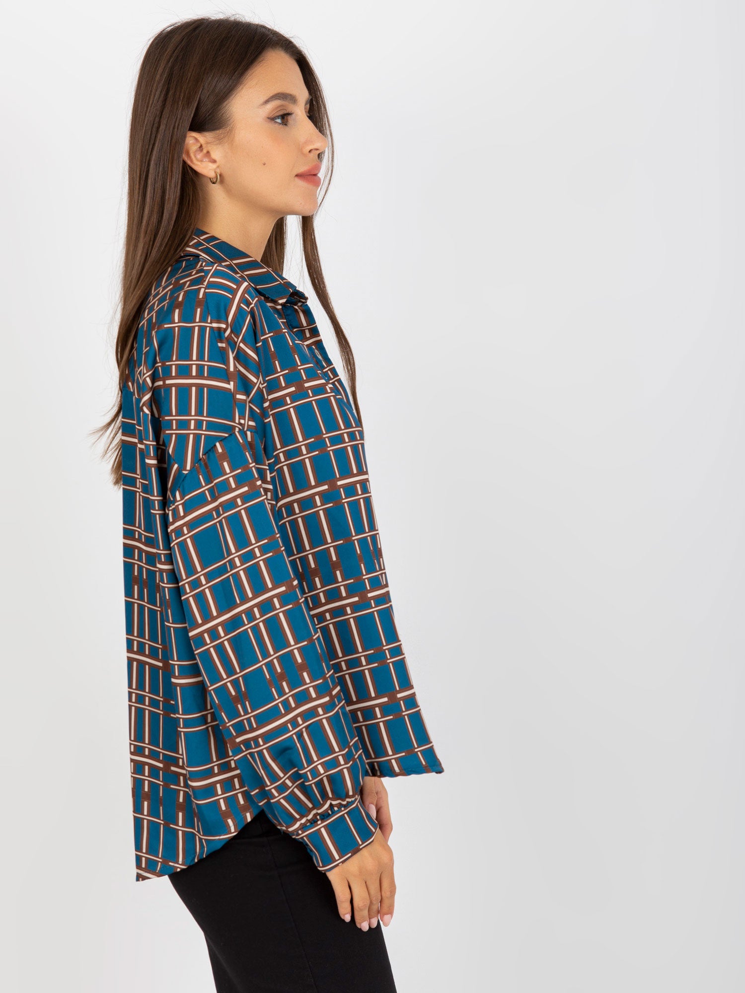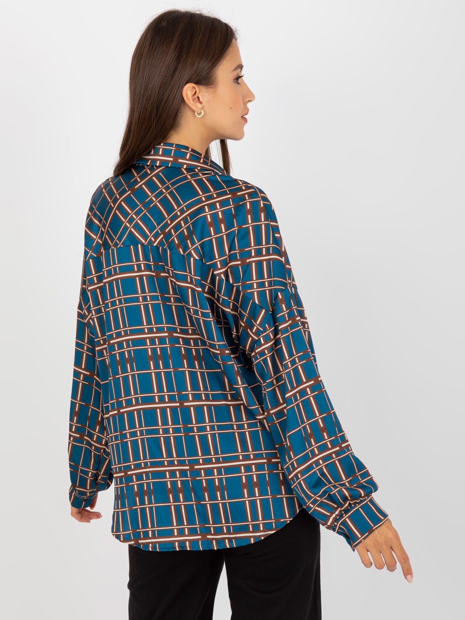 Ciemnoniebieska koszula w kratę z długim rękawem.
