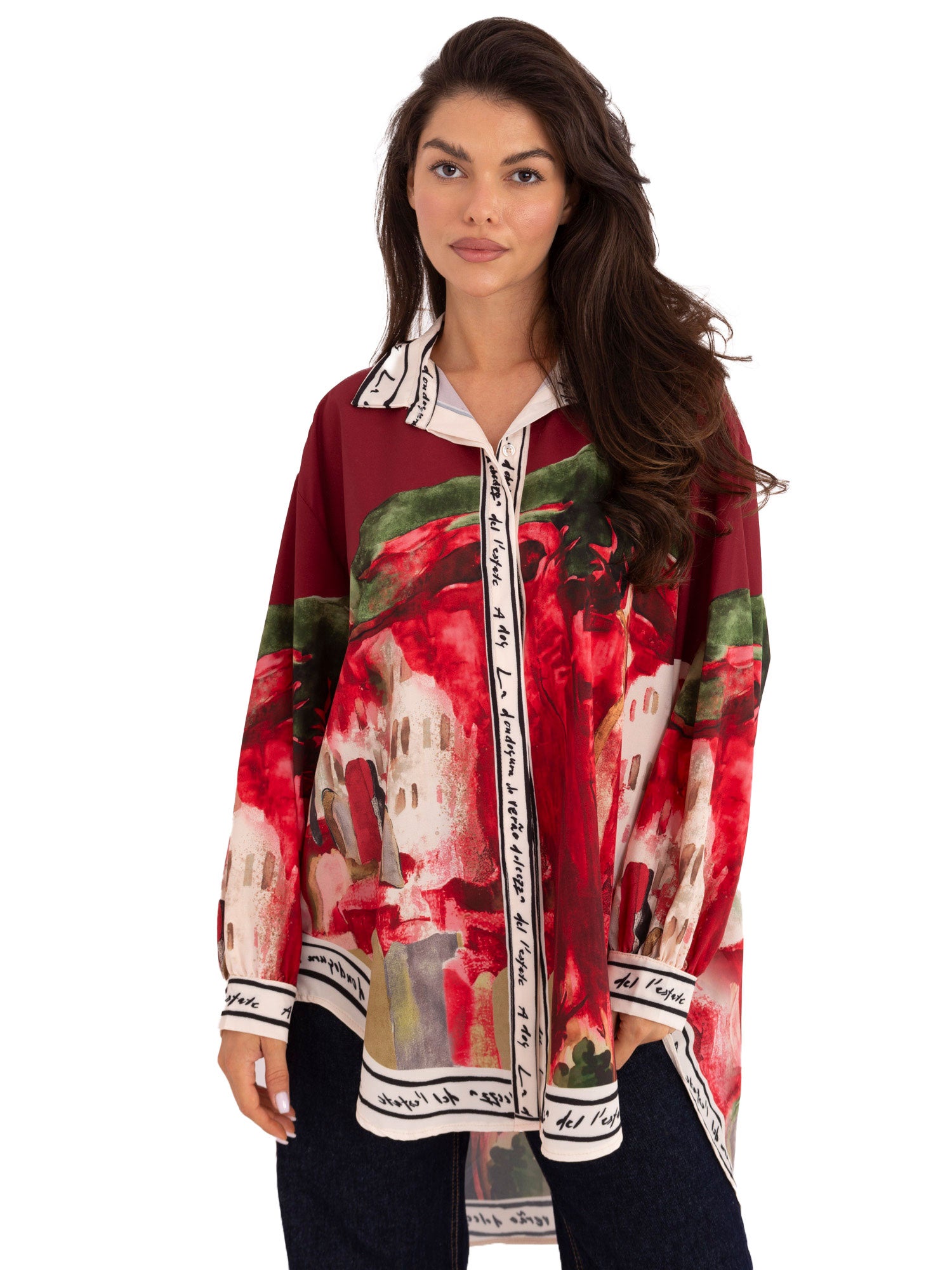 Wymiary koszuli w rozmiarze one size mierzone na płasko: szerokość pod pachami - 78 cm, długość rękawa - 55 cm (od szwu), szerokość w biodrach - 78 cm, długość całkowita - 78 cm (przód), długość całkowita - 101 cm (tył) .