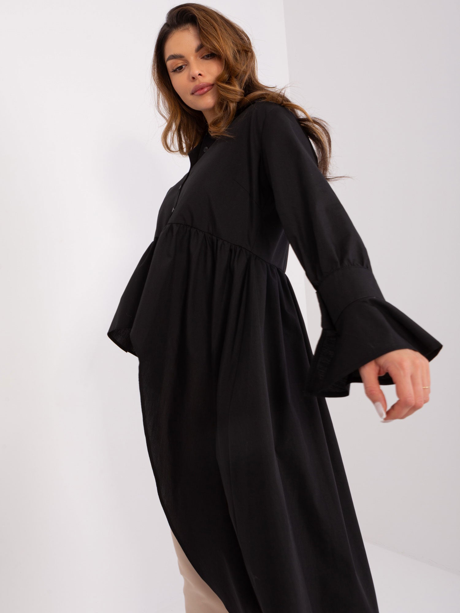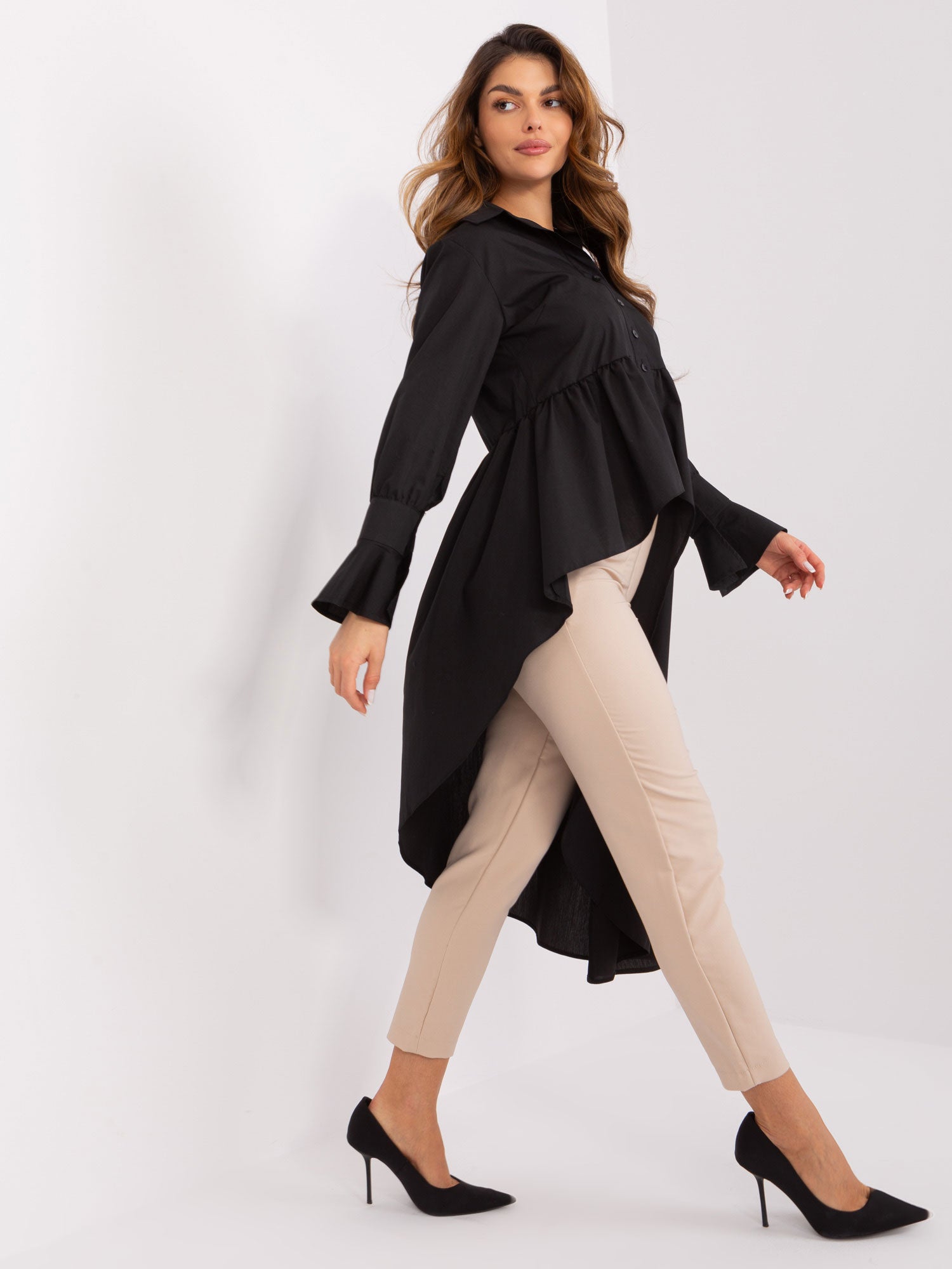 Wymiary koszuli w rozmiarze S/M mierzone na płasko: szerokość pod pachami - 53 cm, długość rękawa - 59 cm, długość (do końca falbany) - 58 cm, długość całkowita (w najdłuższym miejscu) - 122 cm