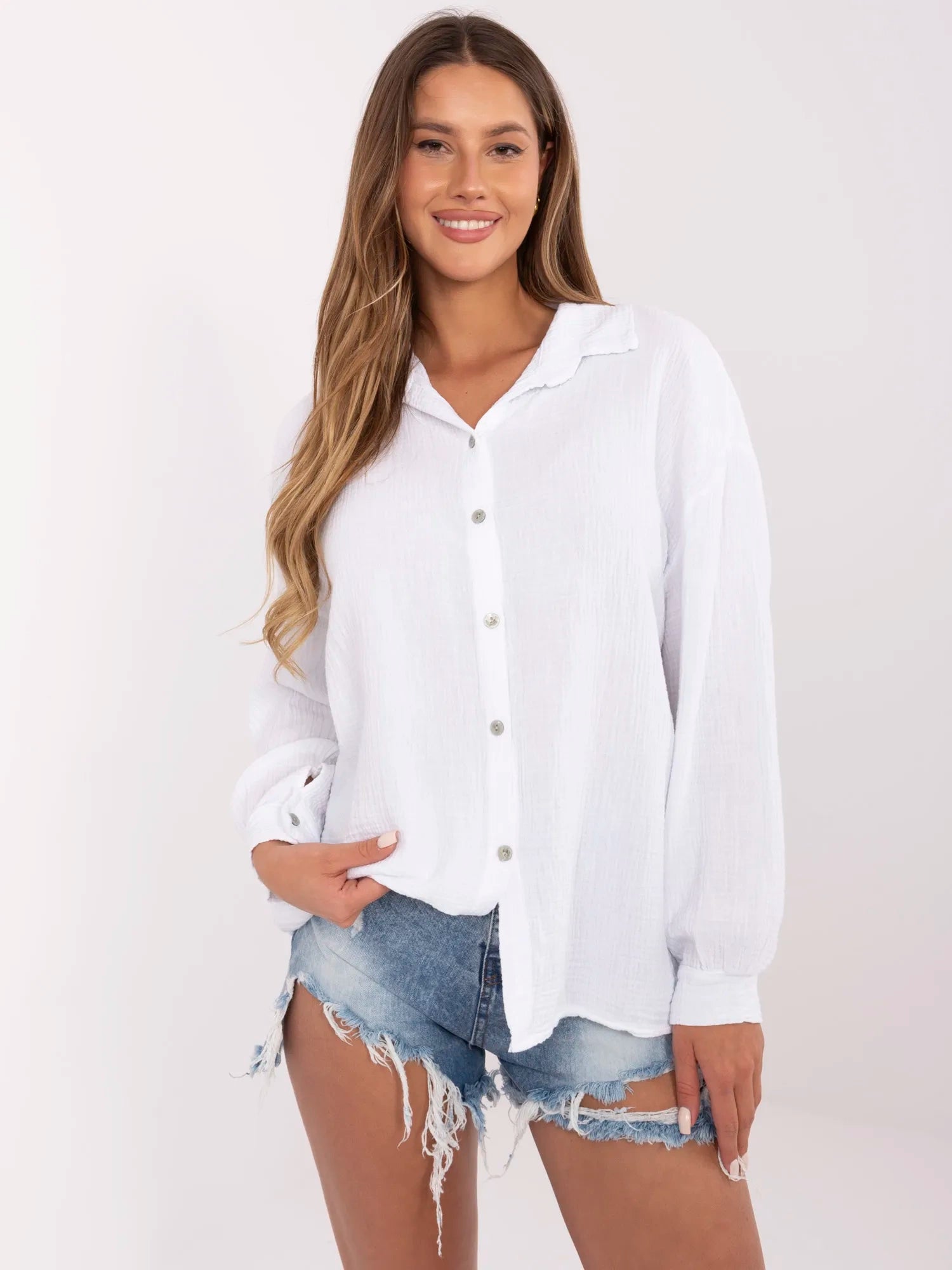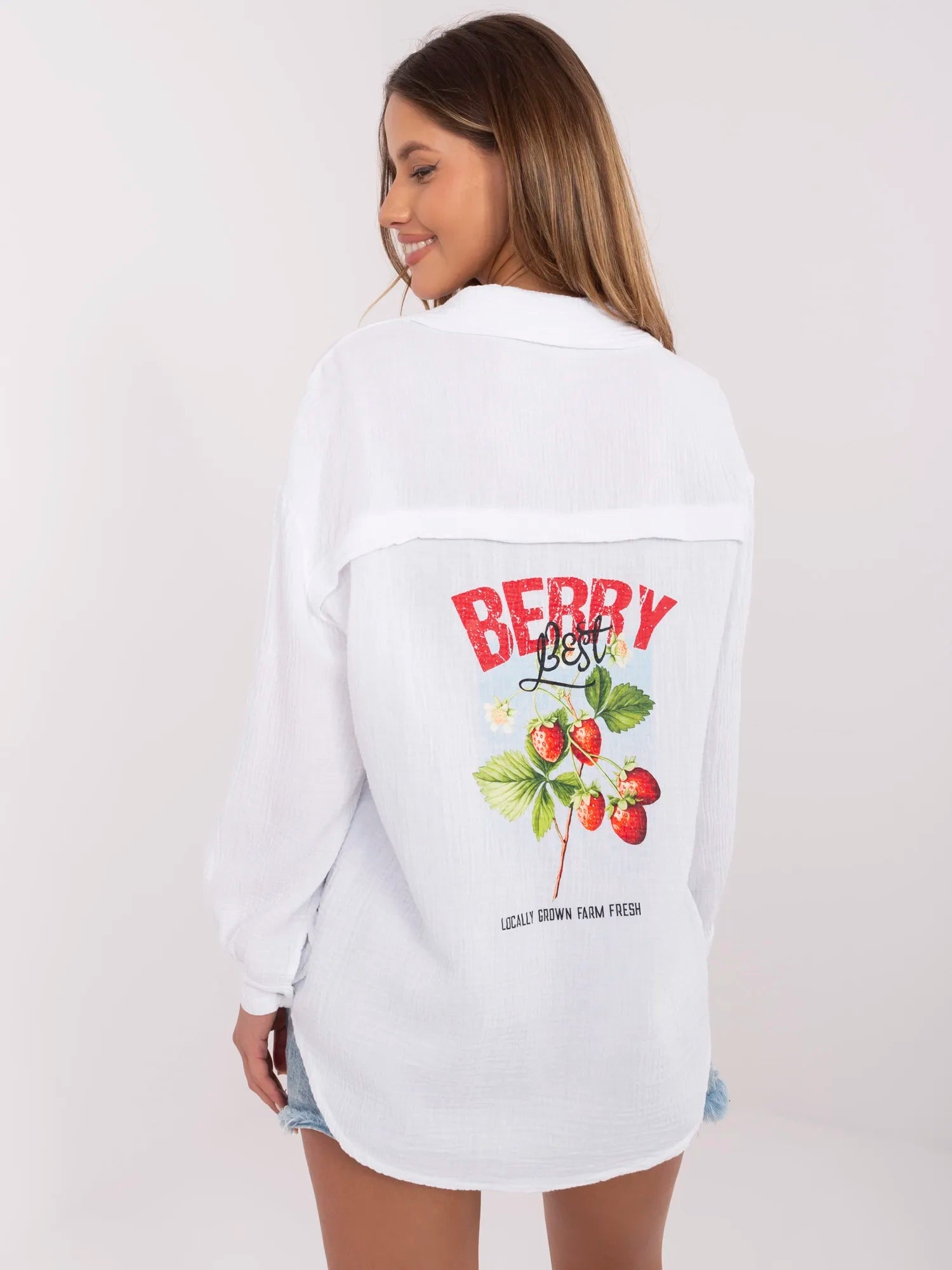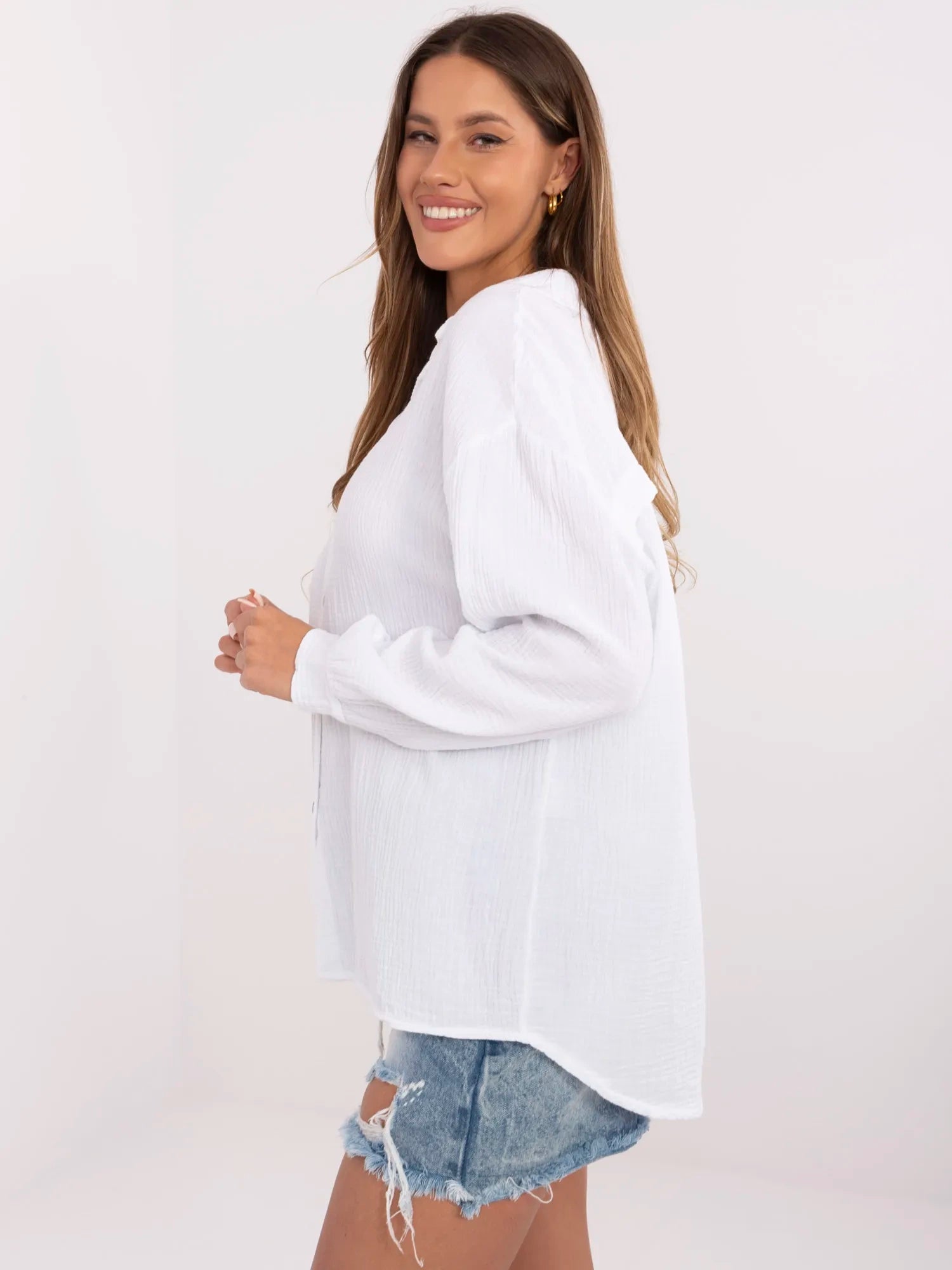Wymiary koszuli w rozmiarze one size mierzone na płasko: szerokość pod pachami - 59 cm długość rękawa - 50 cm (od szwu), szerokość w biodrach - 60 cm, długość całkowita - 75 cm.