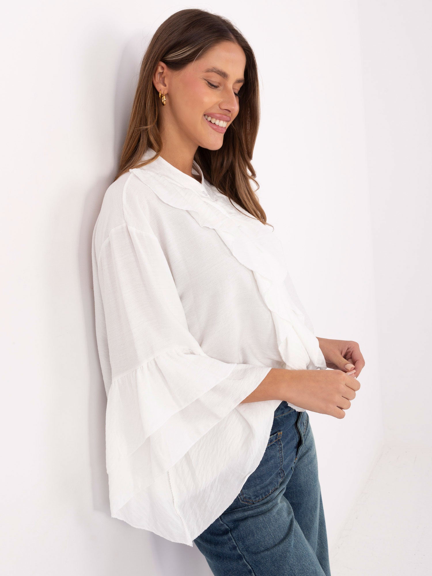Wymiary koszuli w rozmiarze one size mierzone na płasko: szerokość pod pachami - 62 cm, długość całkowita - 63 cm, szerokość w biodrach - 63 cm, długość rękawa - 50 cm.