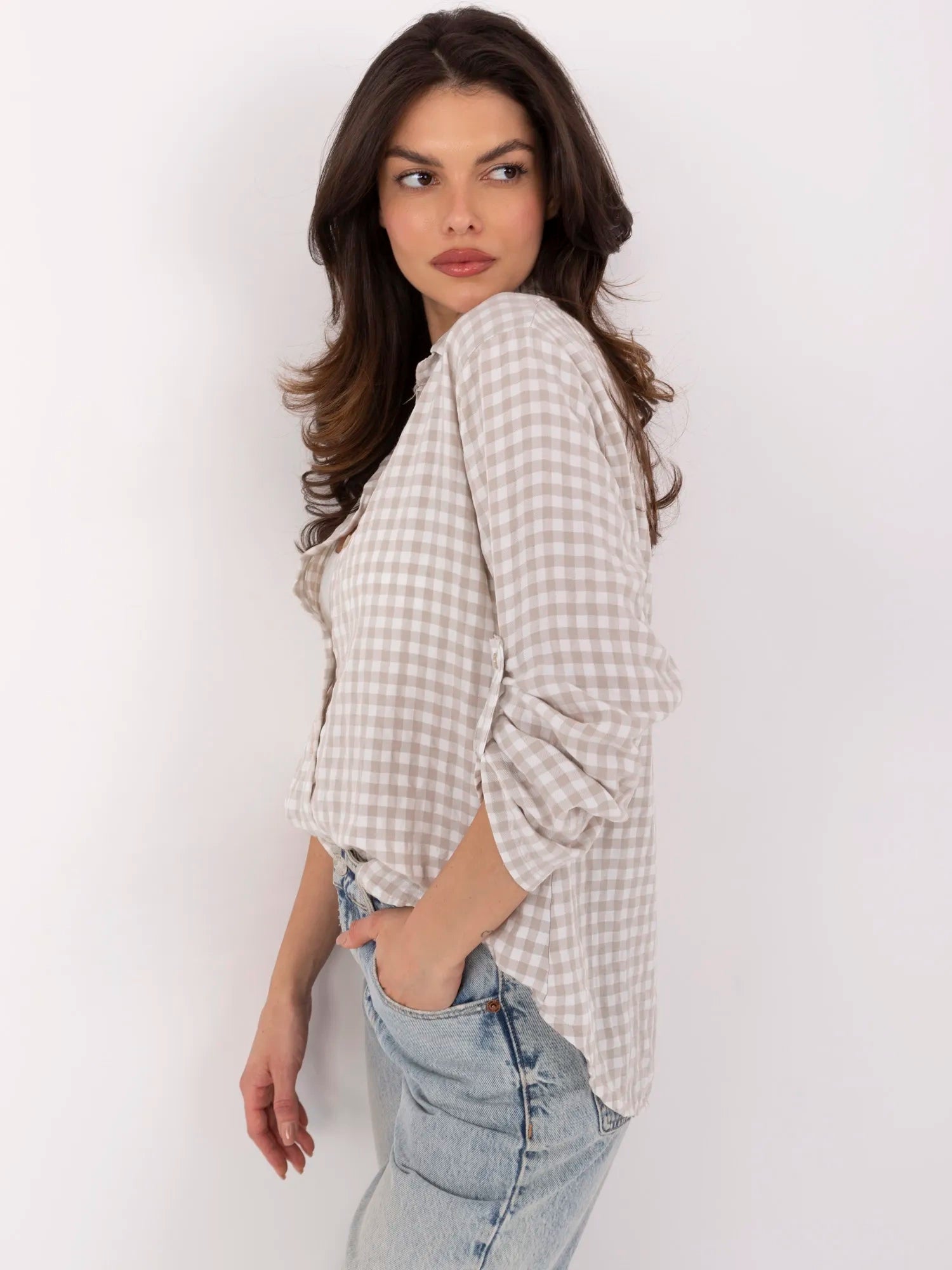 Wymiary koszuli w rozmiarze one size mierzone na płasko: szerokość pod pachami - 56 cm, długość rękawa - 58 cm (od pachy), szerokość w biodrach - 62 cm, długość całkowita - 65 cm (przód), długość całkowita - 71 cm (tył).