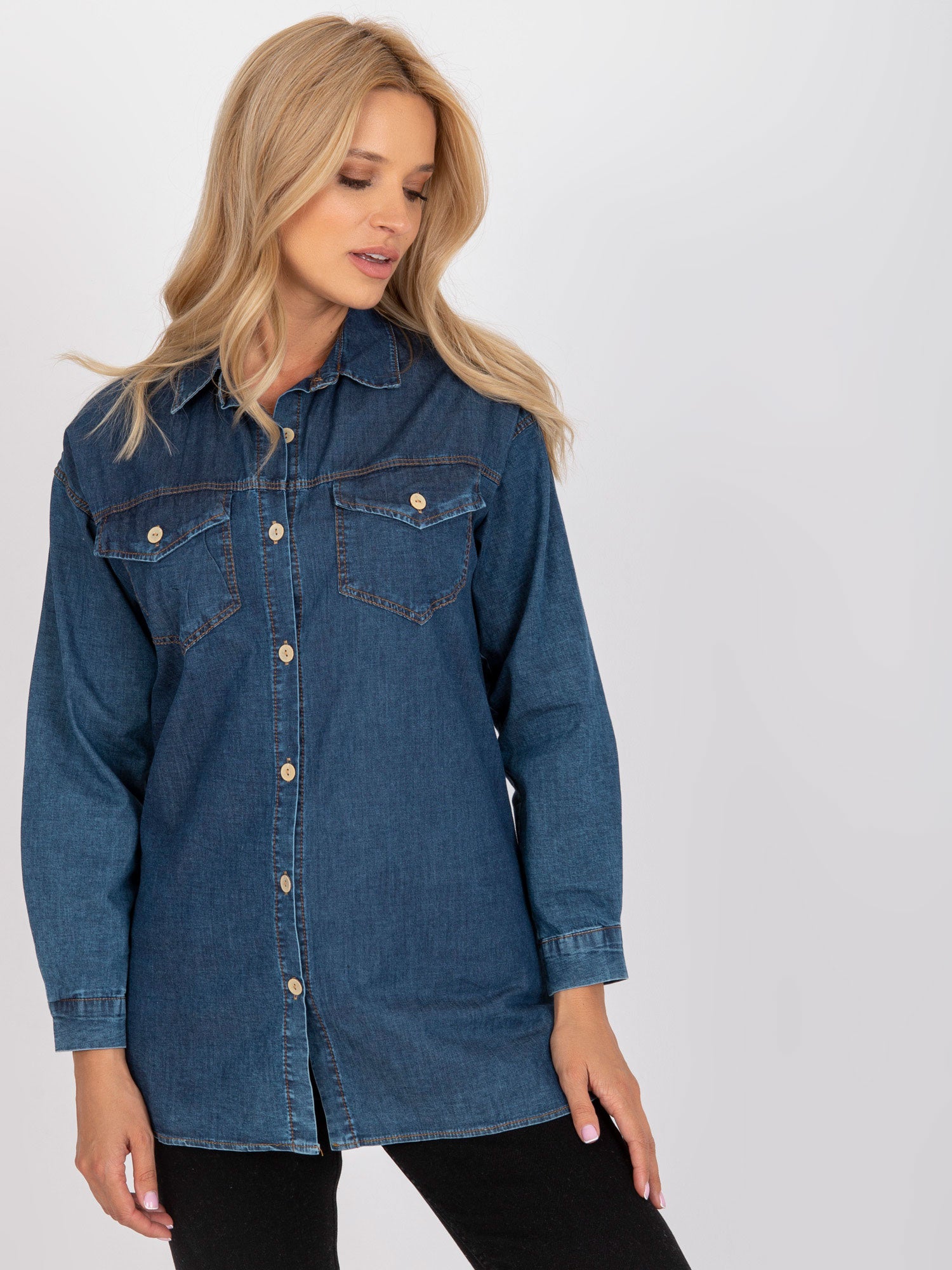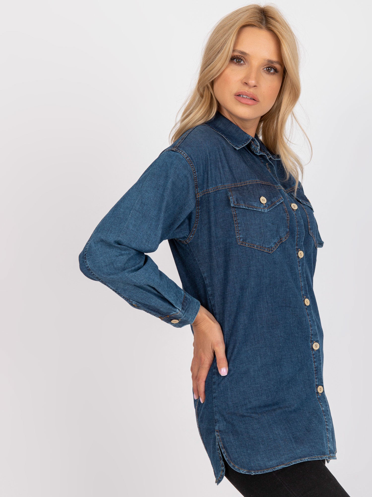 Wymiary koszuli w rozmiarze S mierzone na płasko: szerokość pod pachami - 49 cm, długość całkowita - 73 cm, długość rękawa - 55 cm.