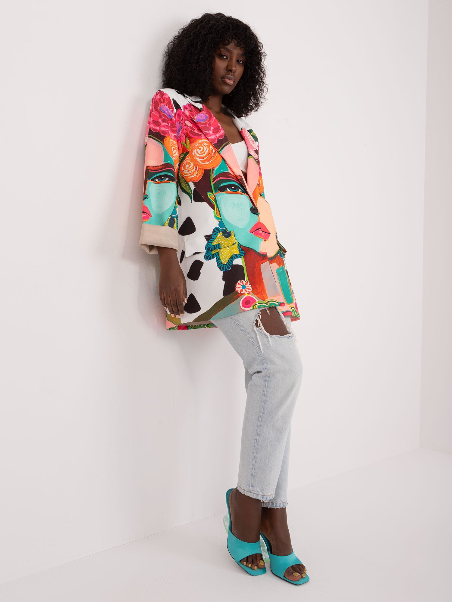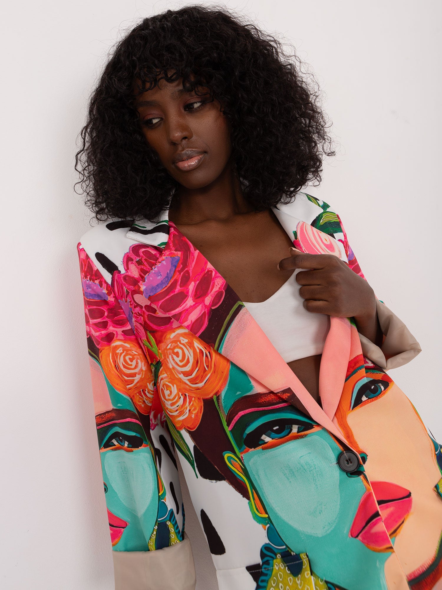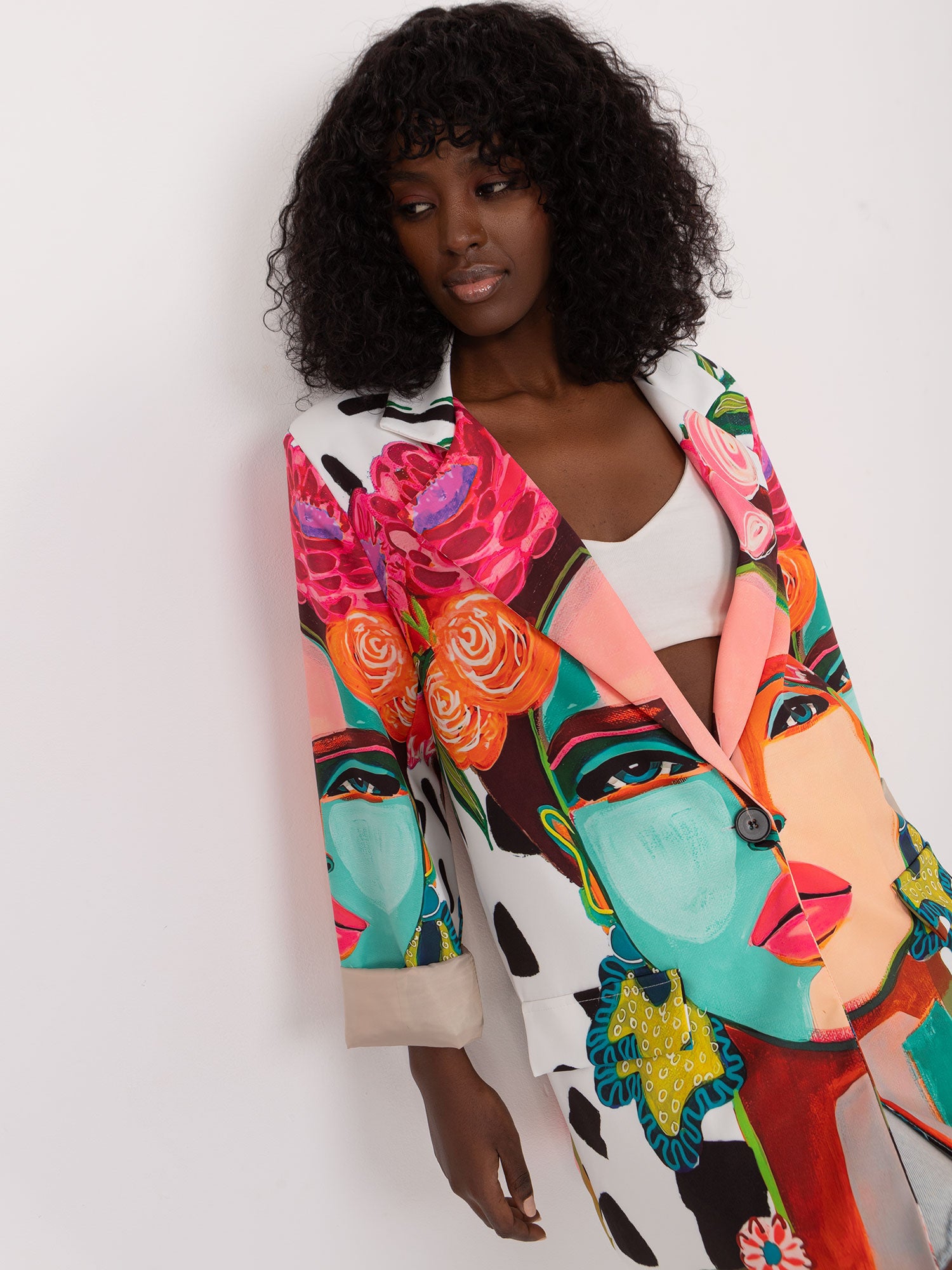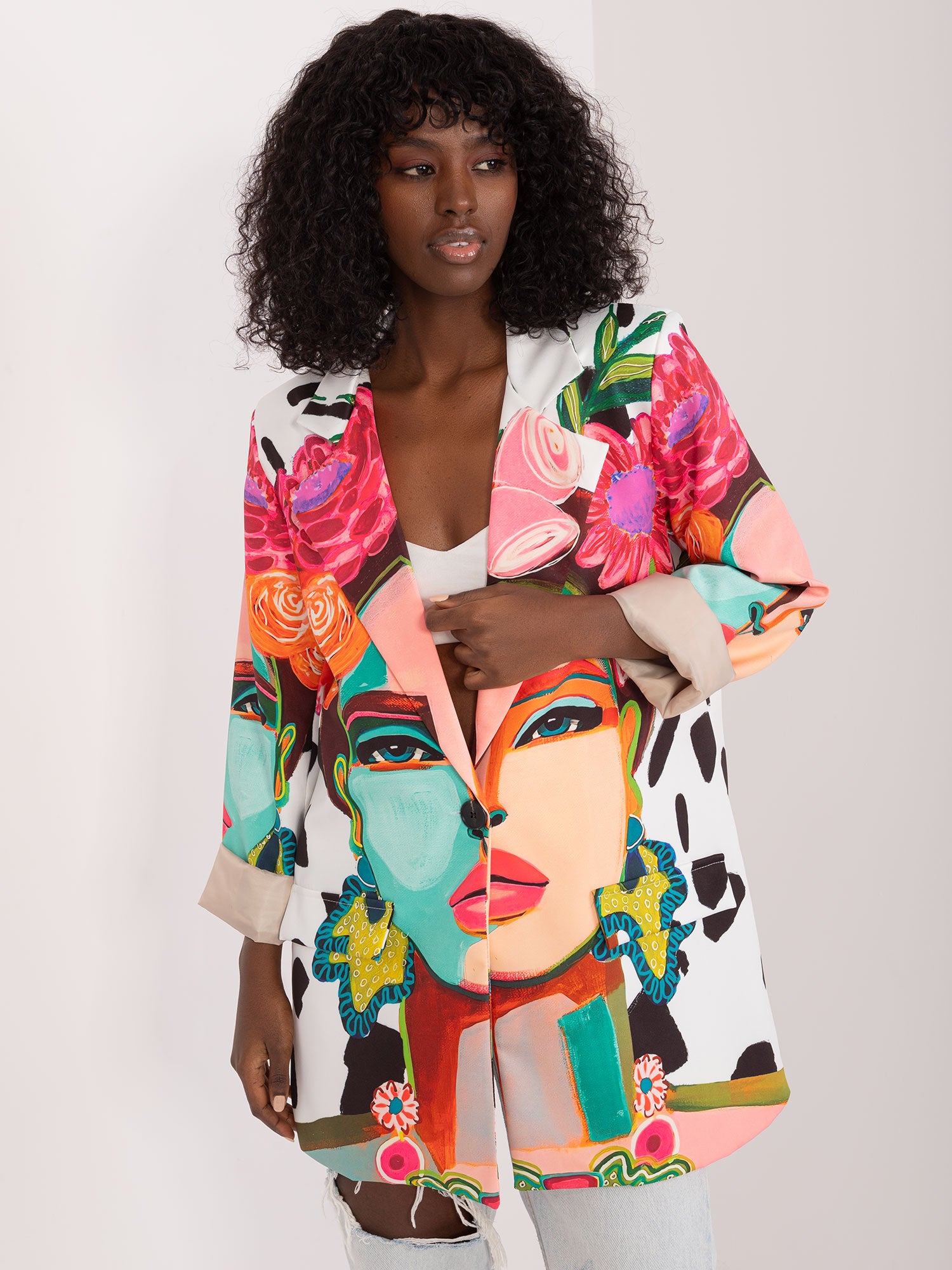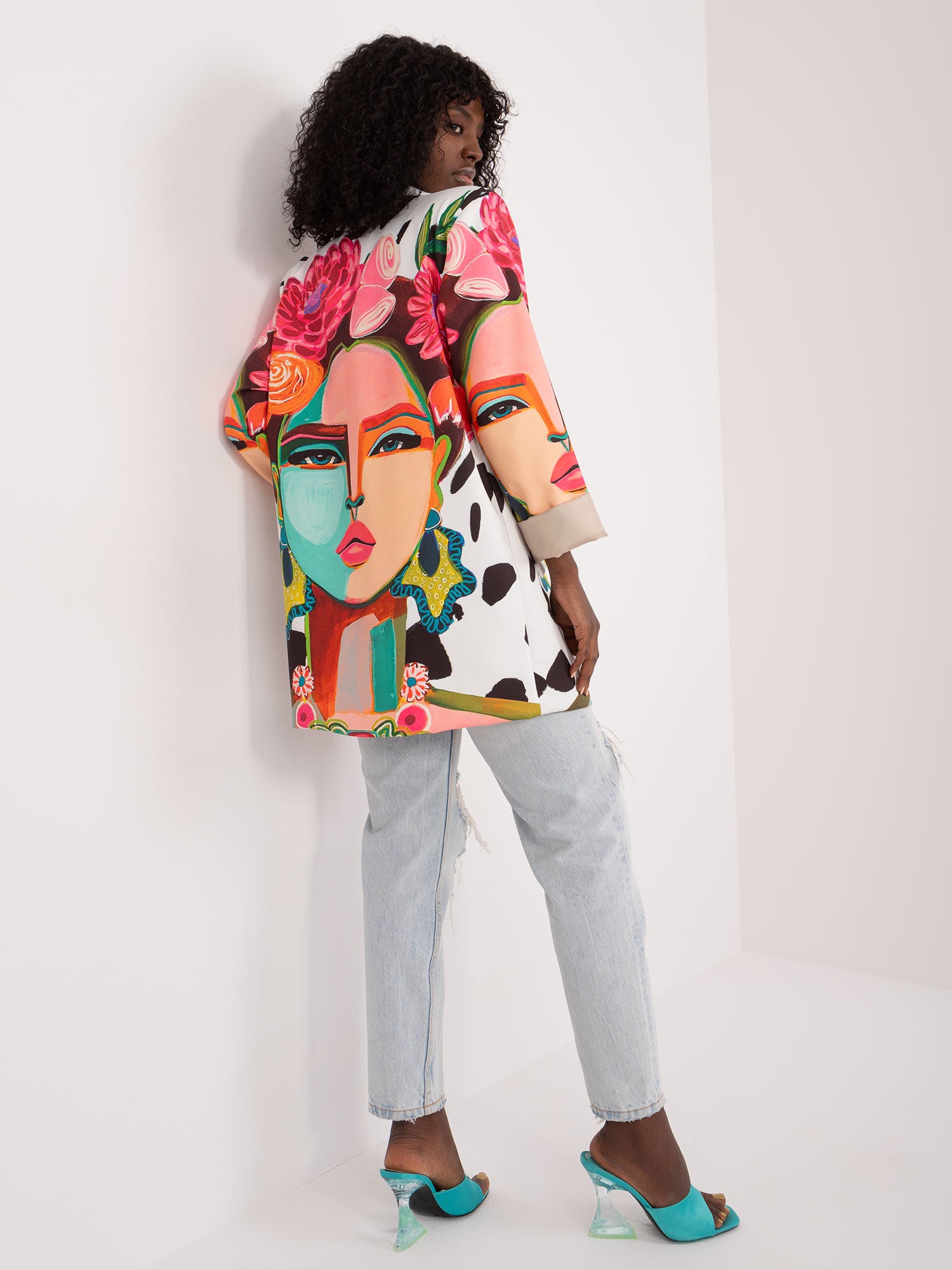 Wymiary marynarki w rozmiarze one size mierzone na płasko: szerokość pod pachami - 55 cm, długość rękawa - 60 cm, długość całkowita - 79 cm