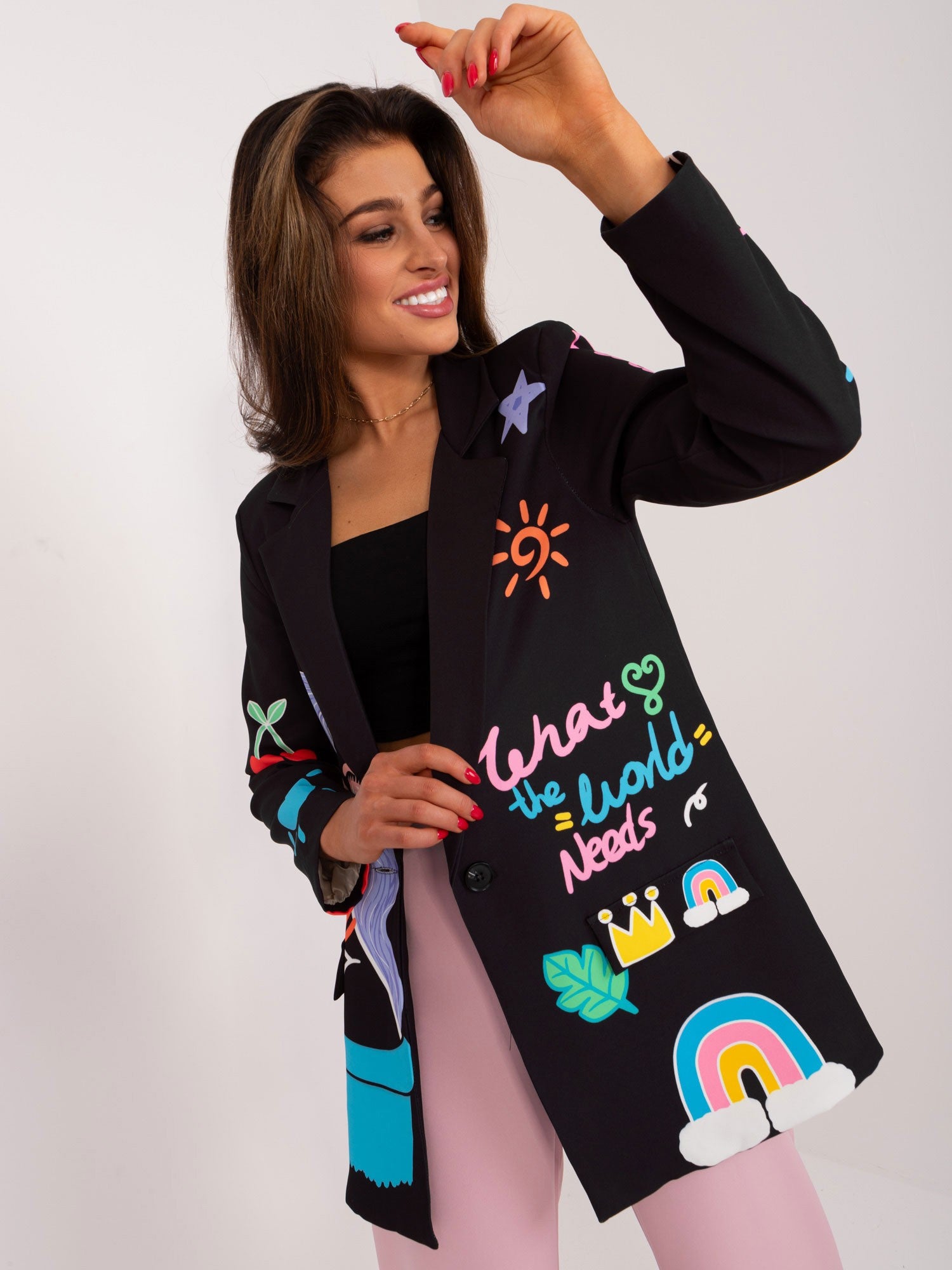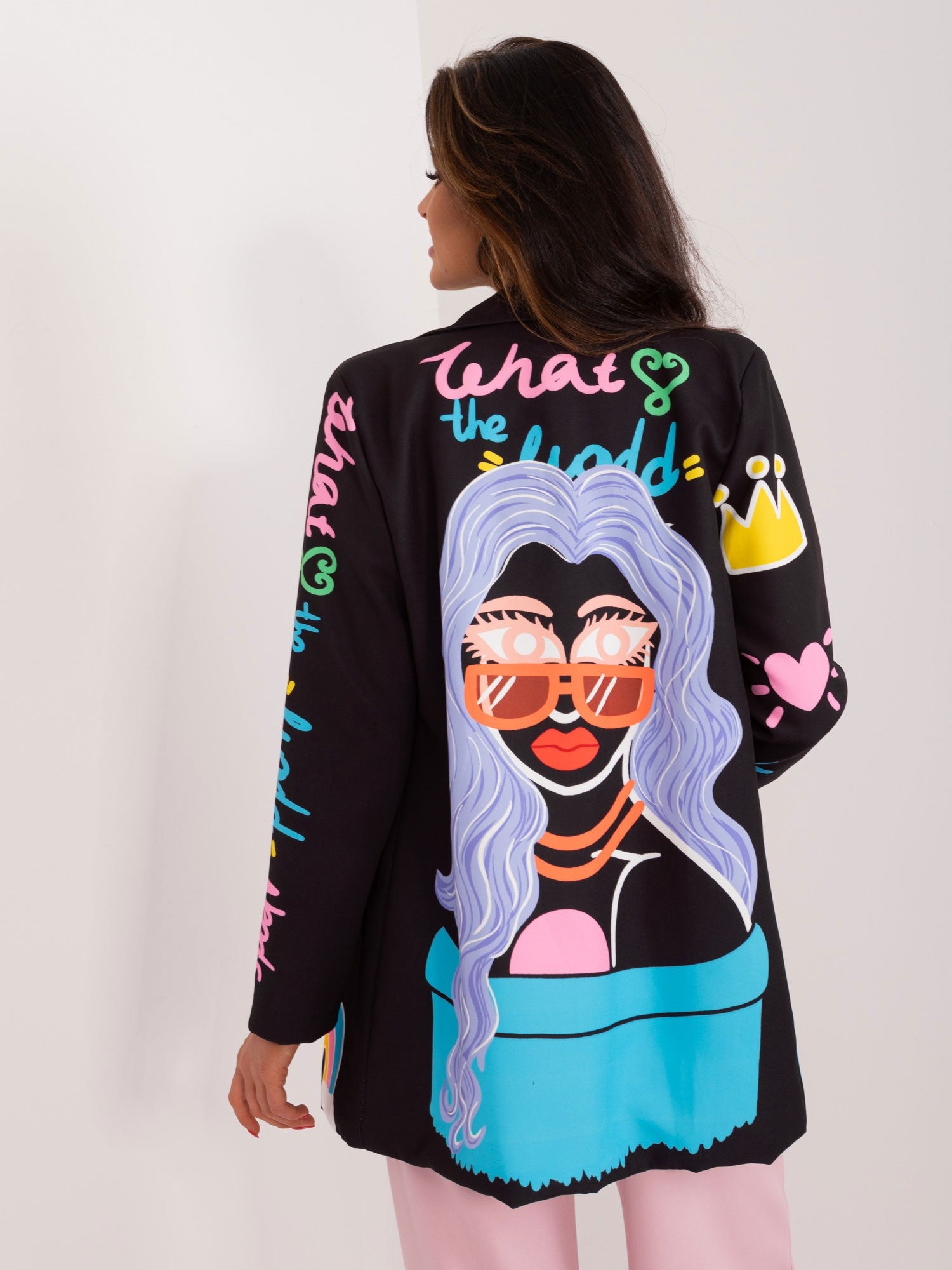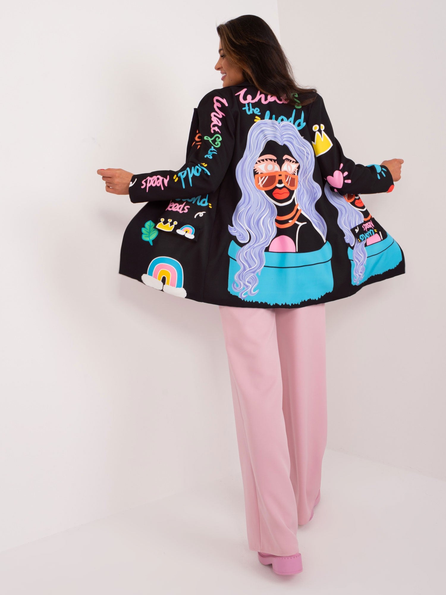 Wymiary marynarki w rozmiarze one size mierzone na płasko: szerokość pod pachami - 54 cm, długość rękawa - 58 cm, długość całkowita - 73 cm