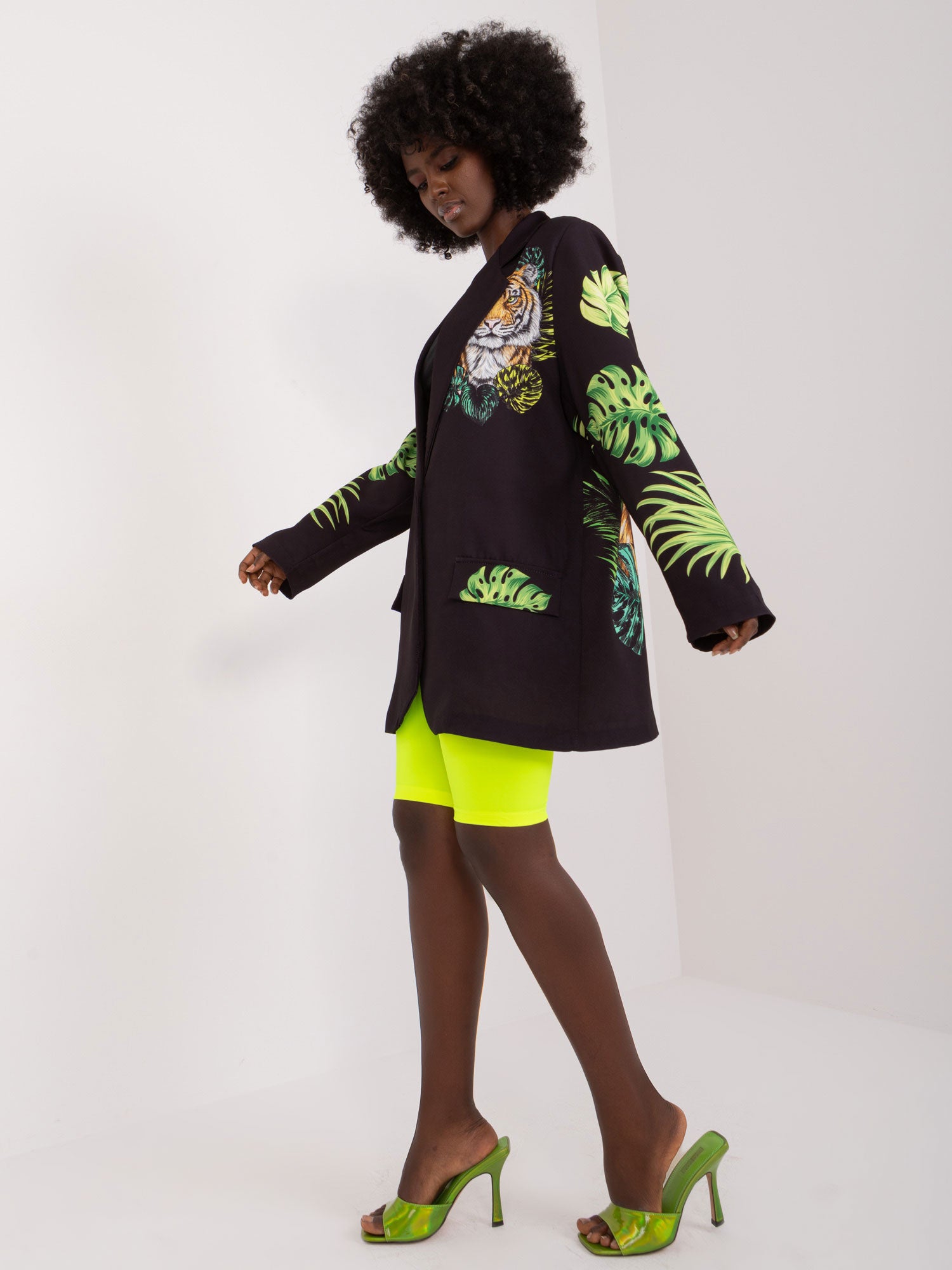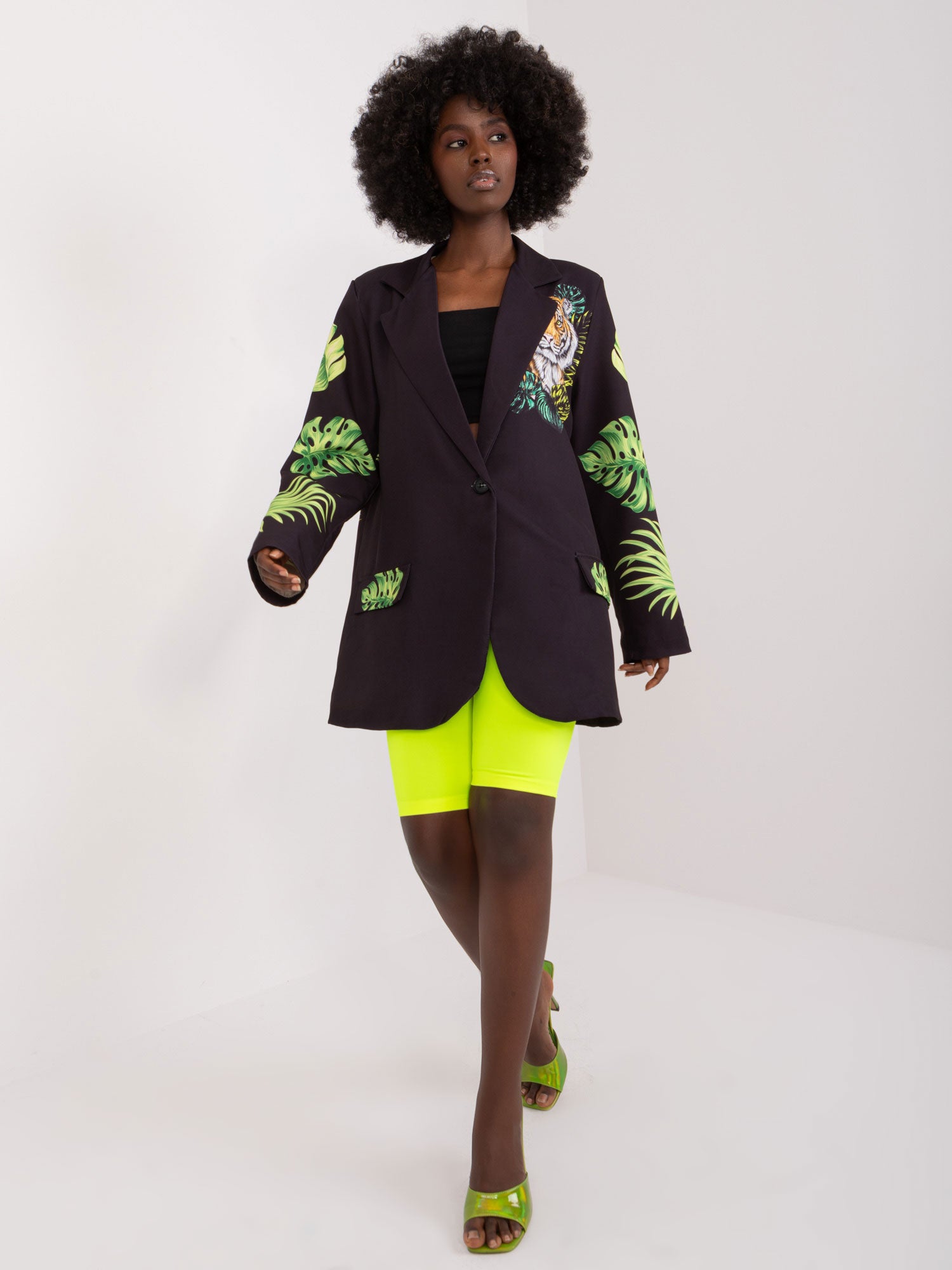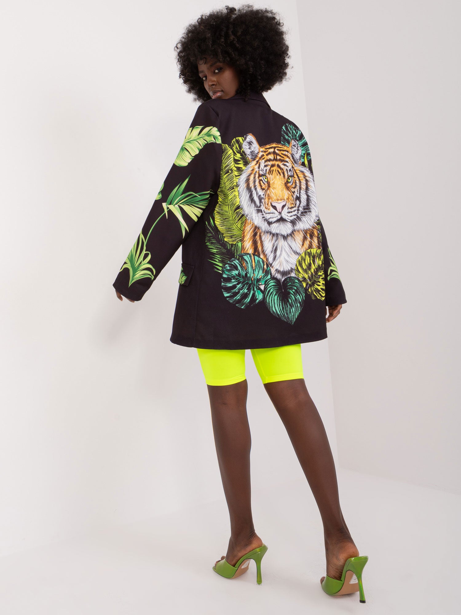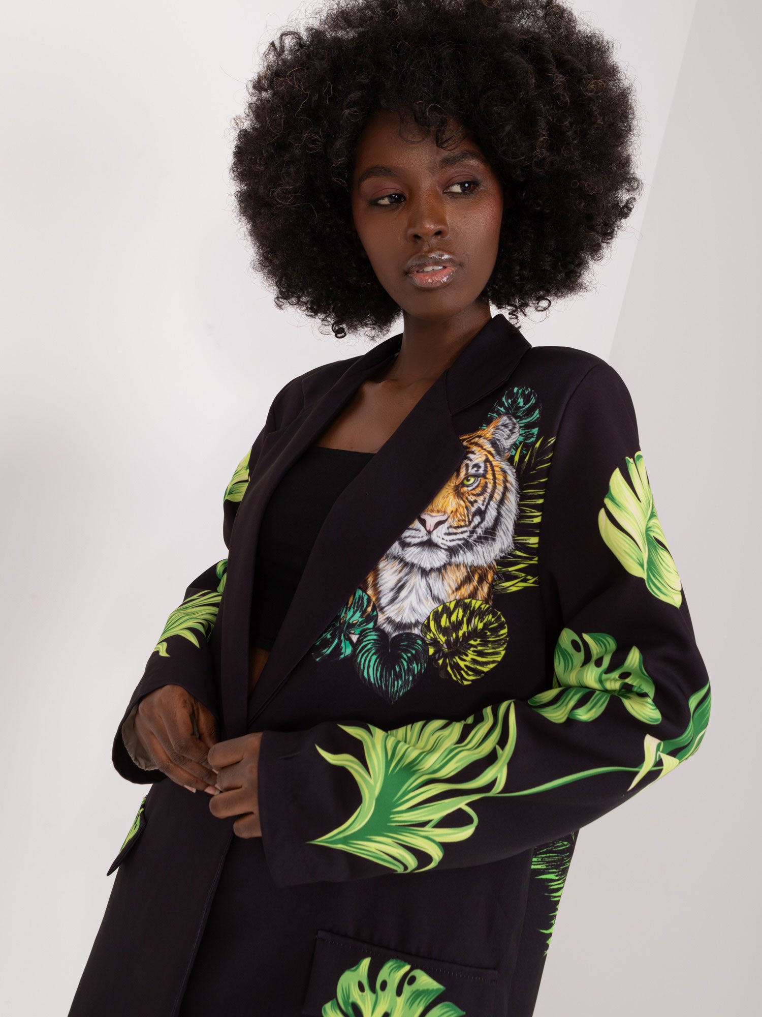 Wymiary marynarki w rozmiarze one size mierzone na płasko: szerokość pod pachami - 58 cm, długość rękawa - 61 cm, długość całkowita - 77 cm