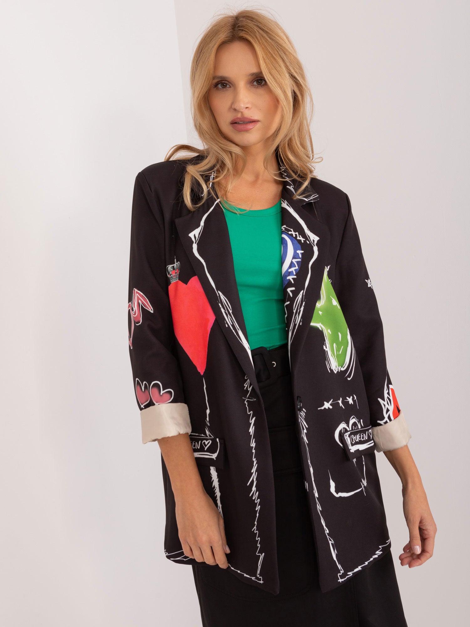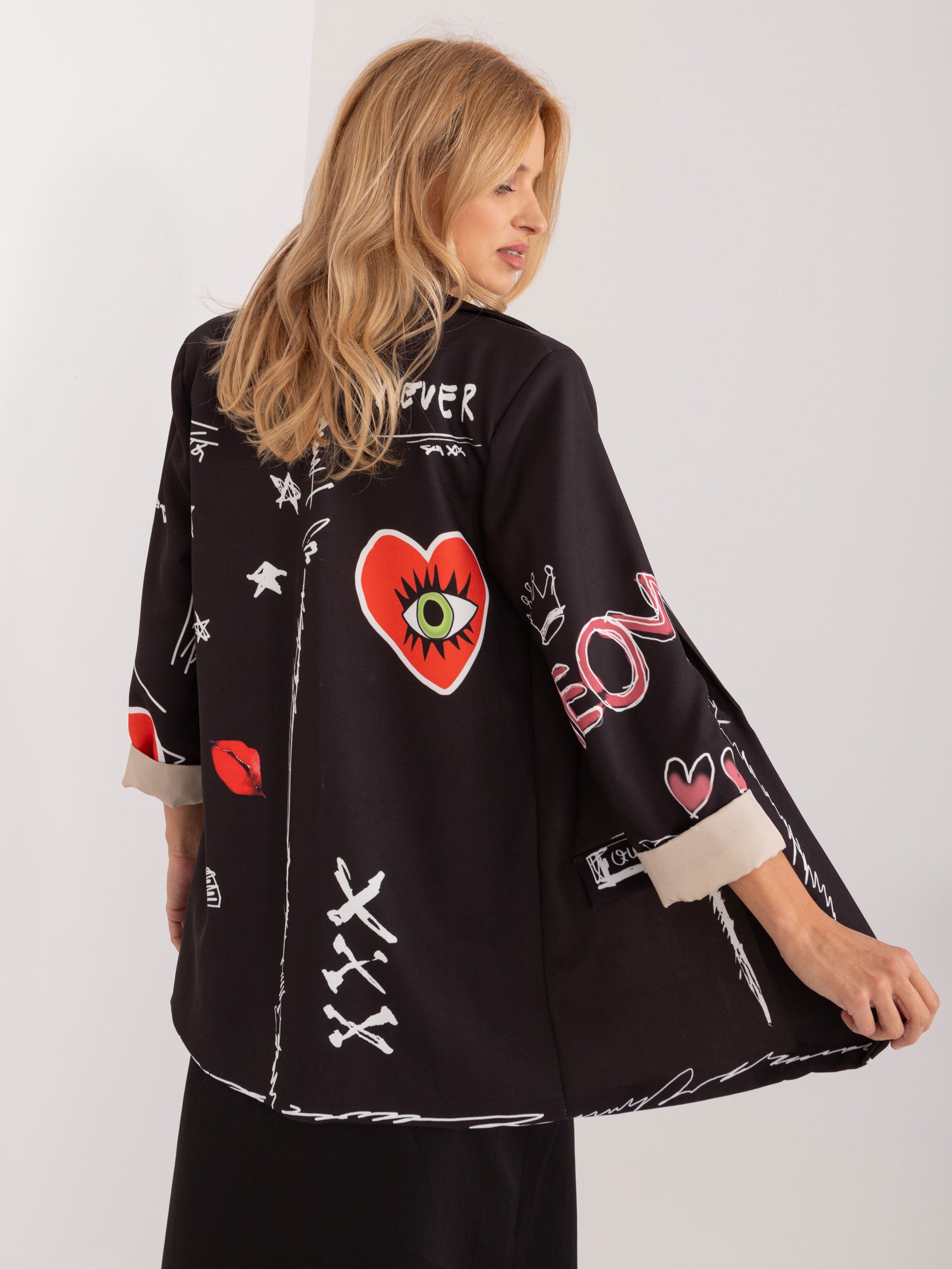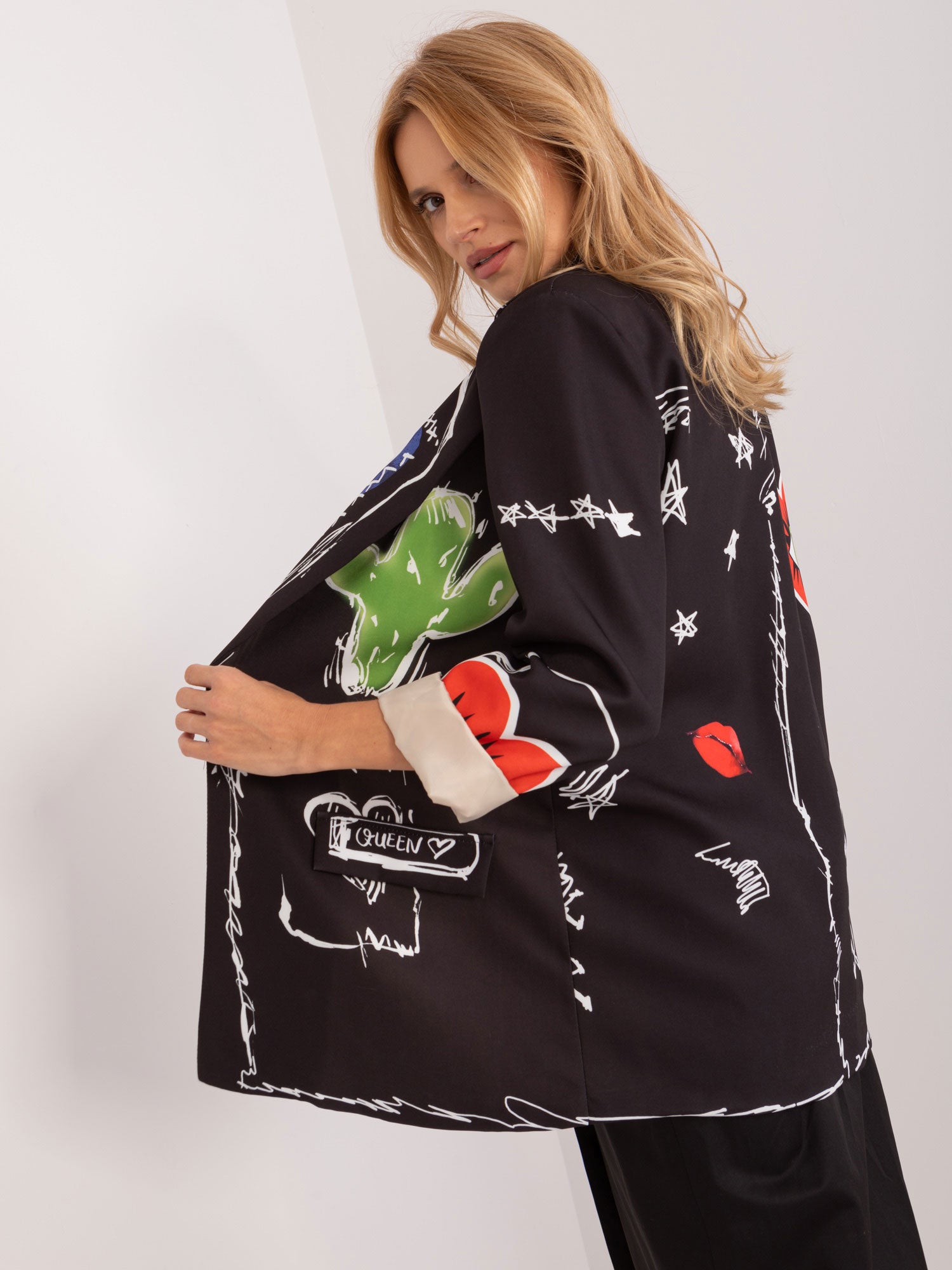 Wymiary marynarki w rozmiarze one size mierzone na płasko: szerokość pod pachami - 56 cm, długość rękawa - 60 cm, długość całkowita - 76 cm