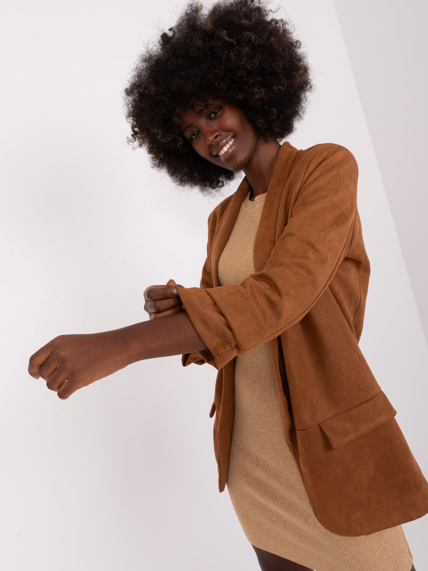 Jasnobrązowa zamszowa marynarka z rękawem 3/4 .