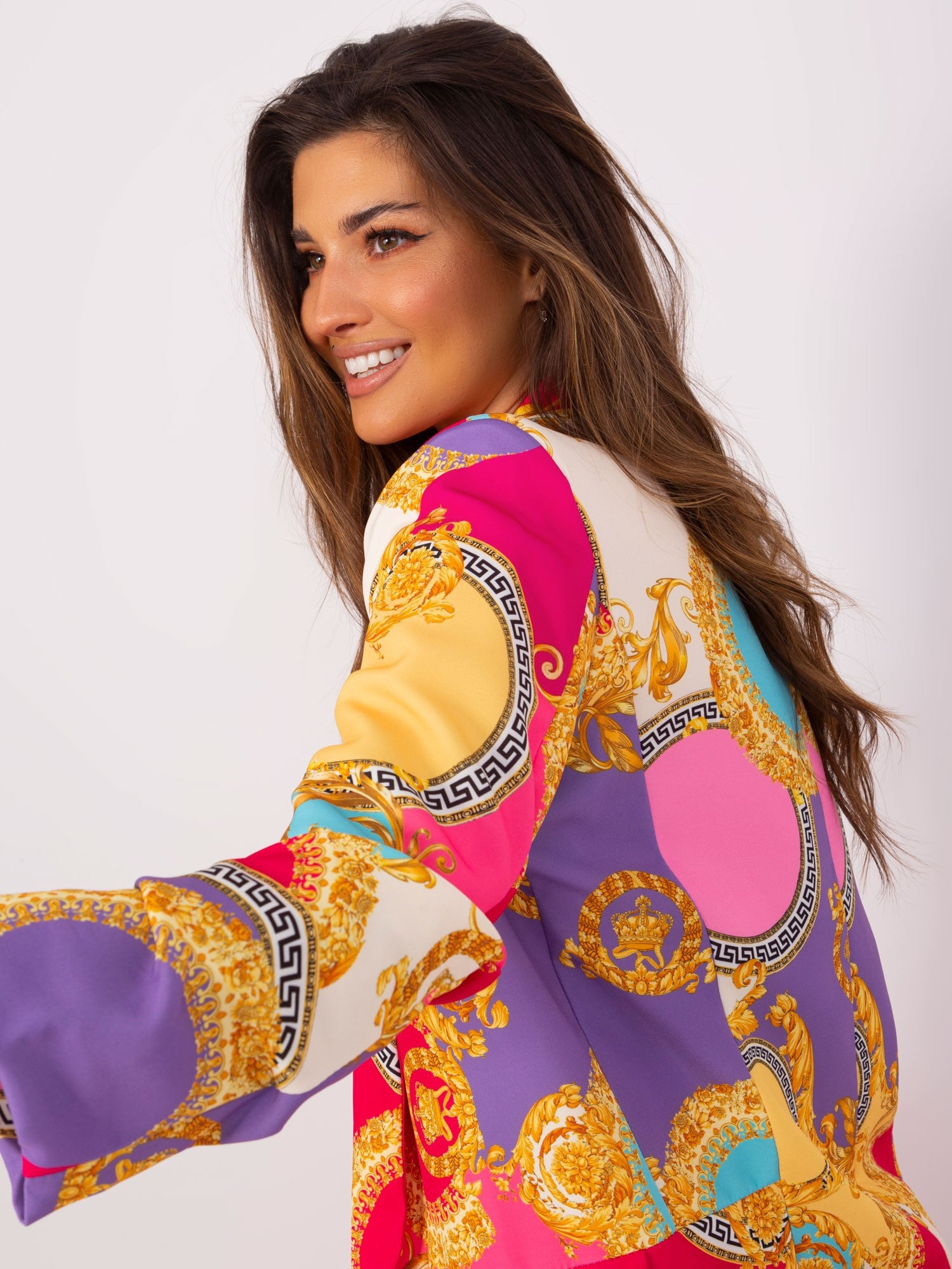 Różowo-fioletowa marynarka z drapowanymi rękawami .