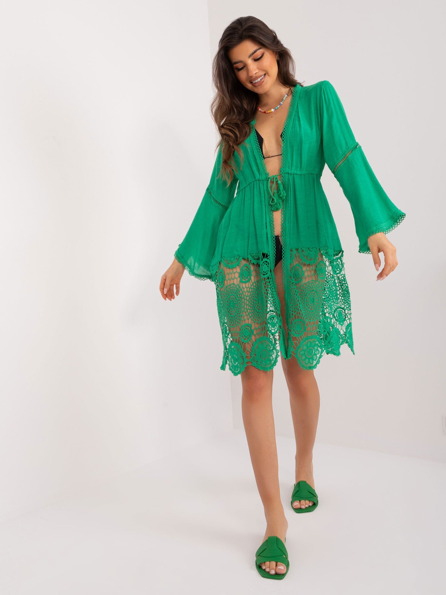 Wymiary narzutki w rozmiarze S/M mierzone na płasko: szerokość pod pachami - 58 cm, długość rękawa - 56 cm, długość całkowita - 101 cm.