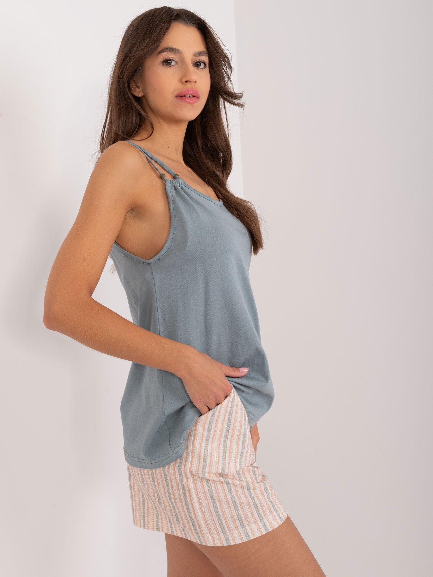 Wymiary kompletu w rozmiarze S mierzone na płasko: szerokość topu pod pachami - 43 cm, długość topu - 52 cm, szerokość szortów w pasie - 36 cm, wysokość stanu - 31 cm, długość szortów - 35 cm.