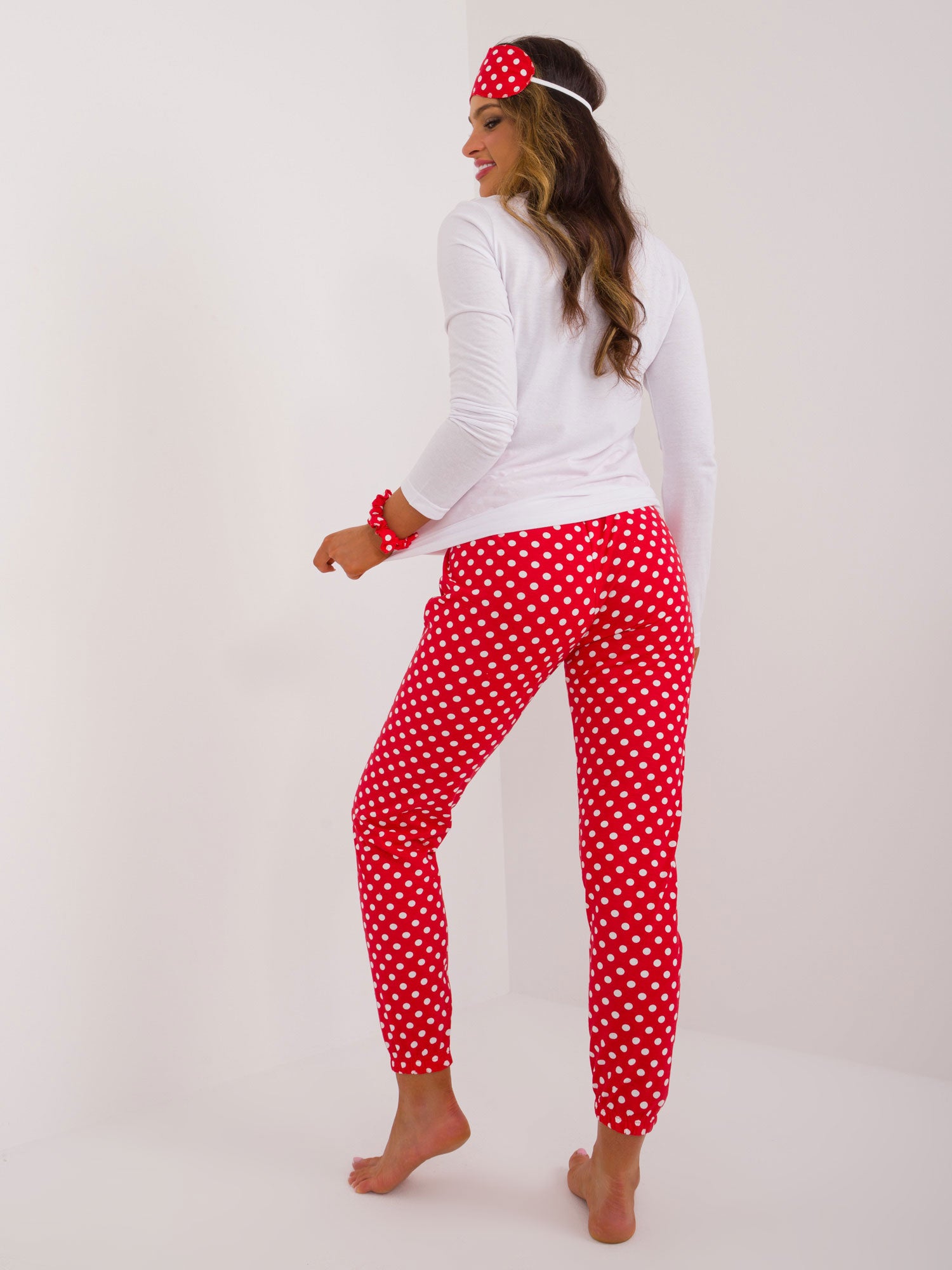 Wymiary piżamy w rozmiarze S mierzone na płasko: bluzka: szerokość pod pachami - 47 cm, długość rękawa - 61 cm, długość całkowita - 73 cm, spodnie: szerokość w pasie - 30 cm, długość całkowita - 98 cm.
