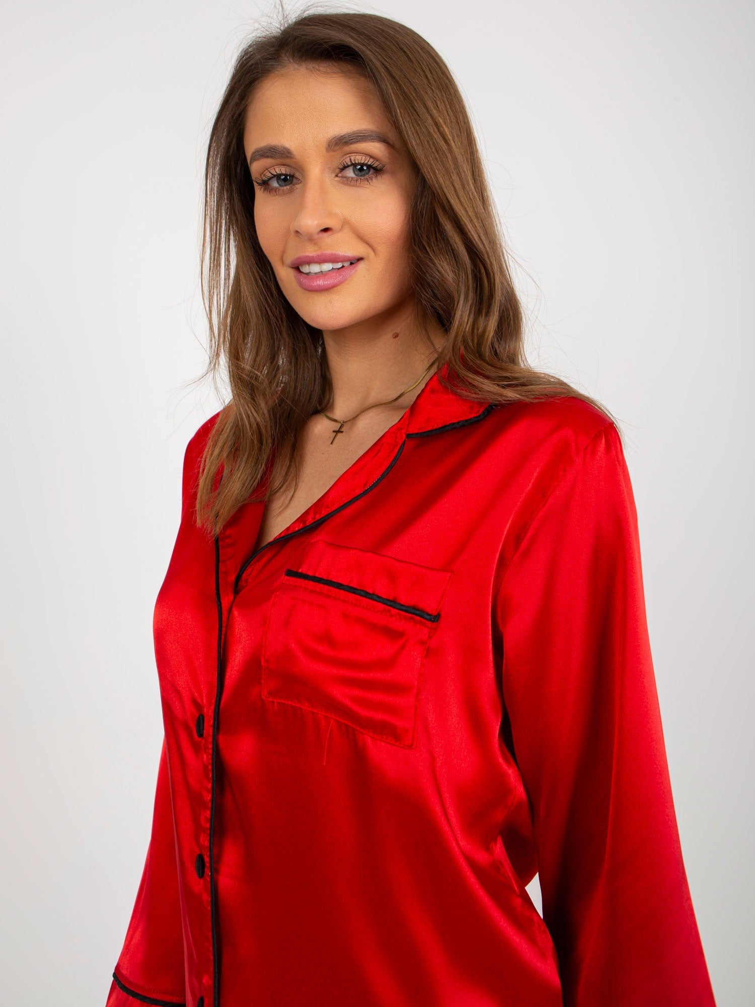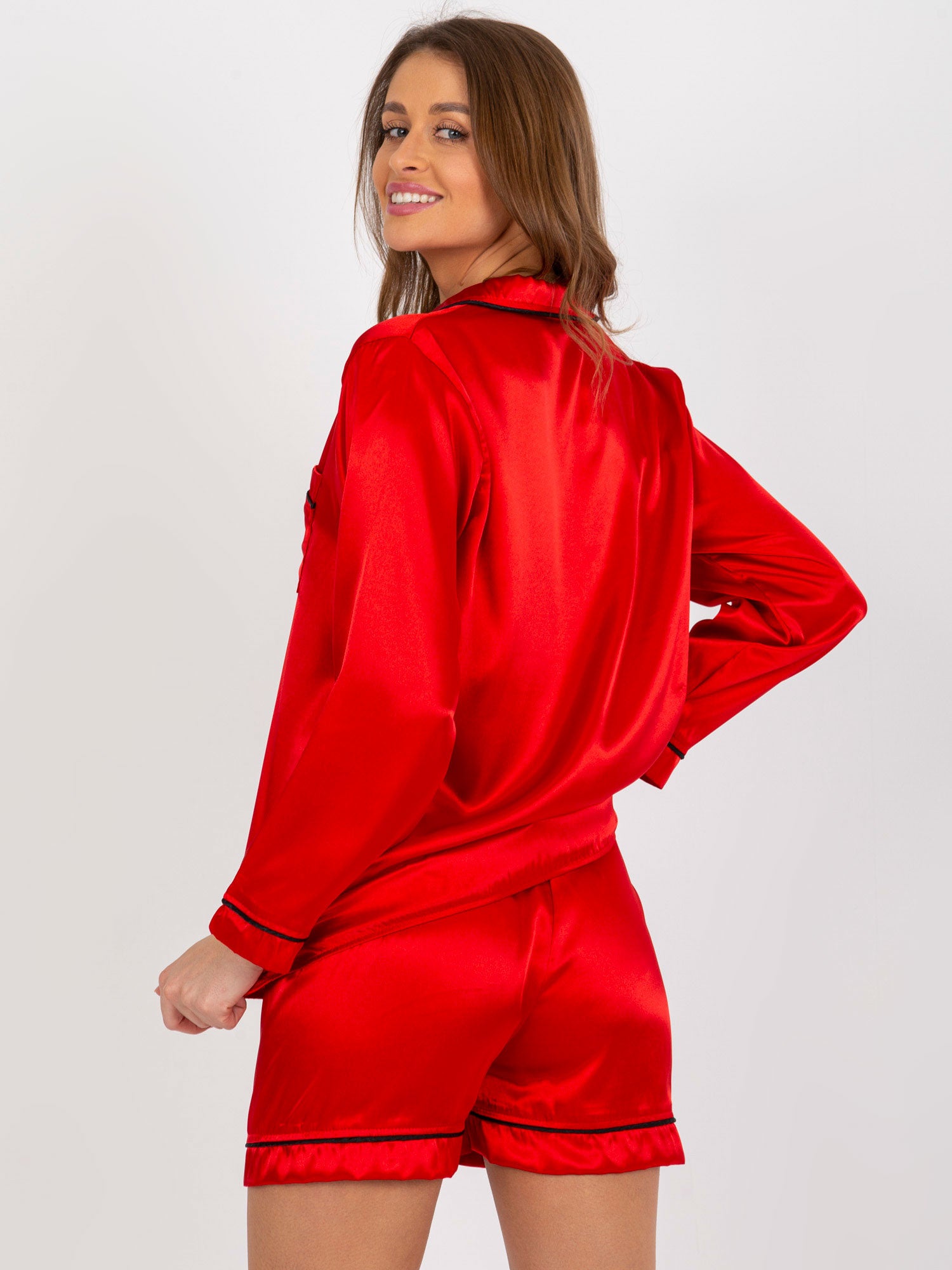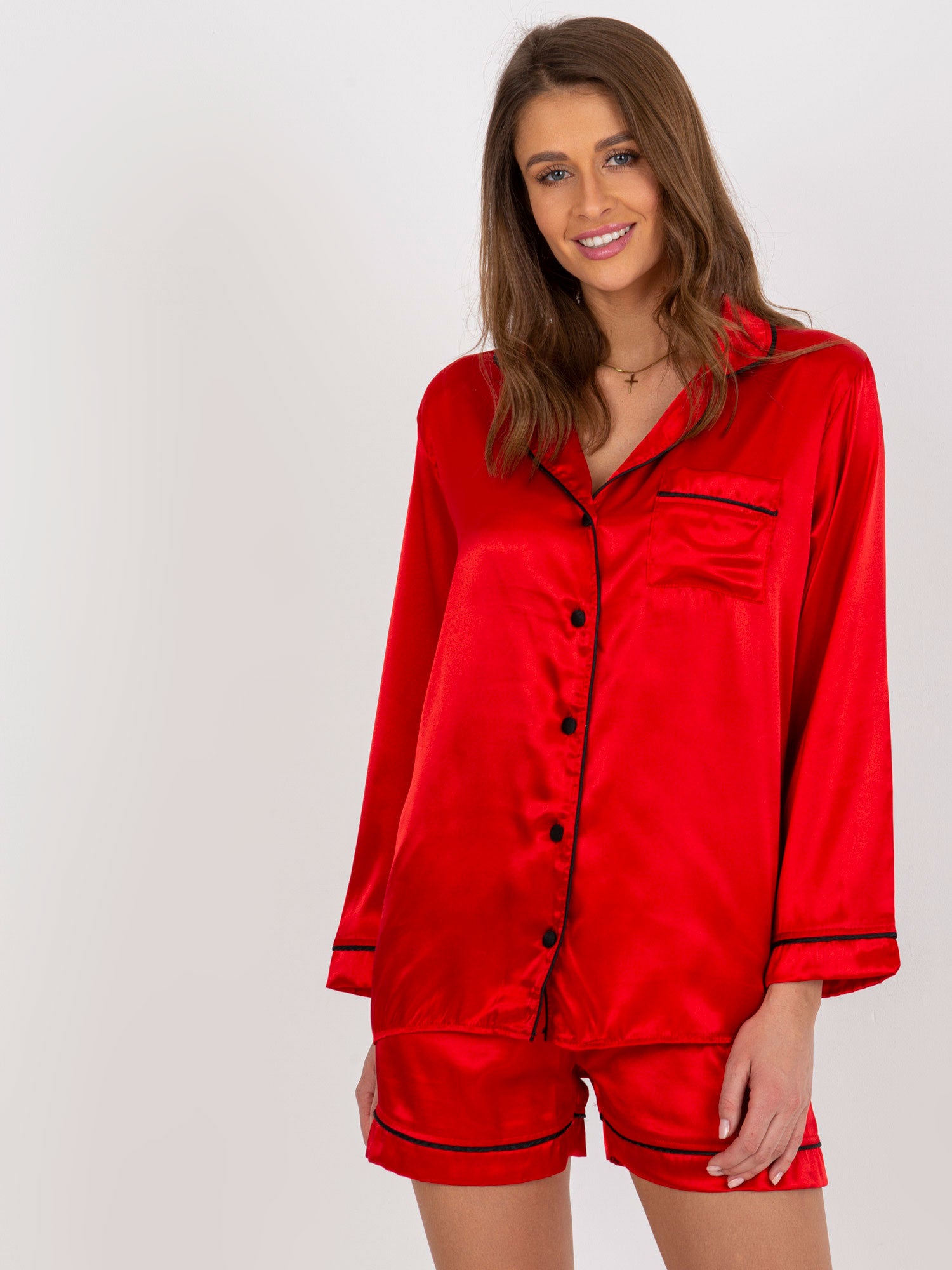 Czerwona damska piżama satynowa z szortami i koszulą .