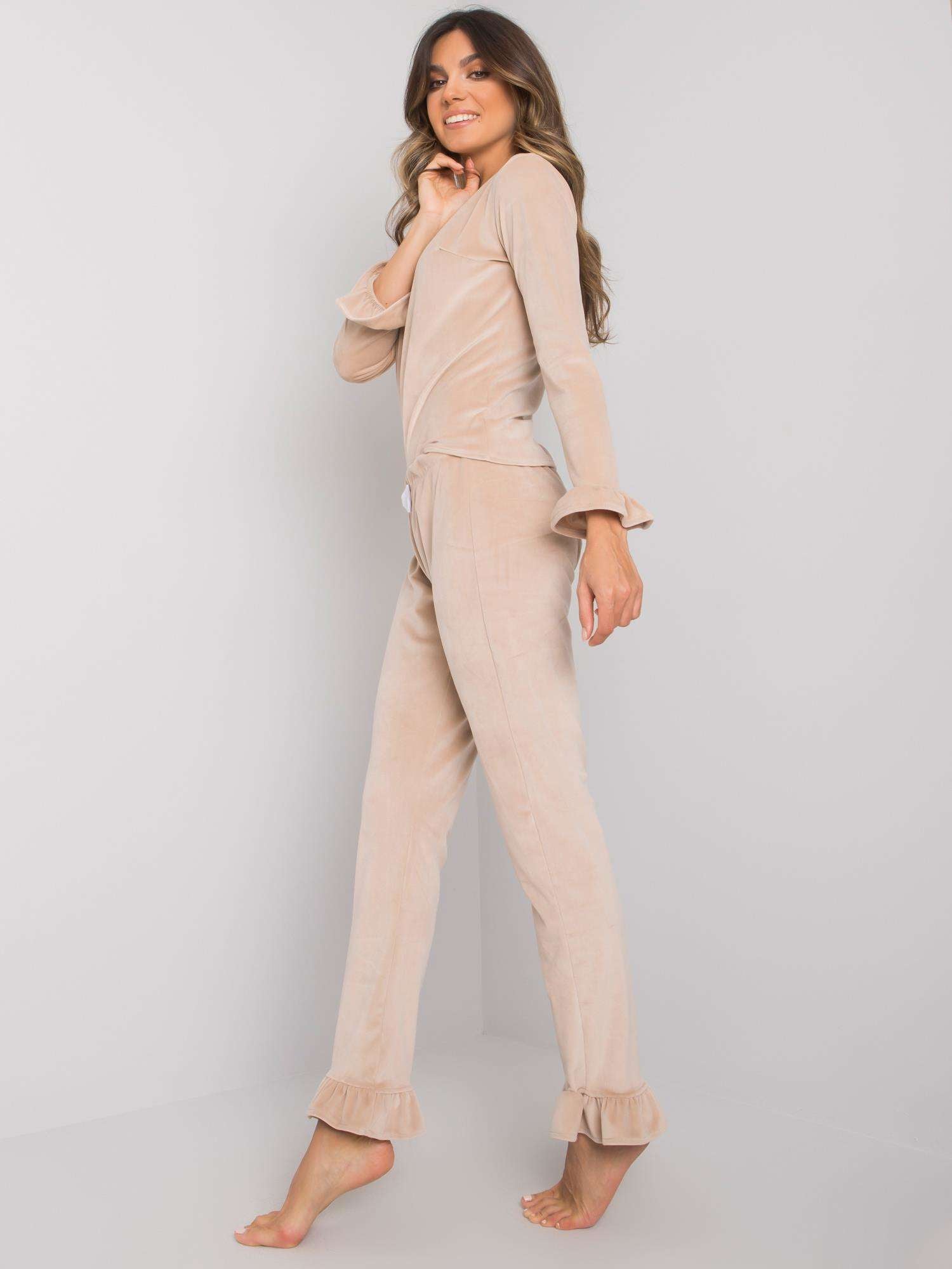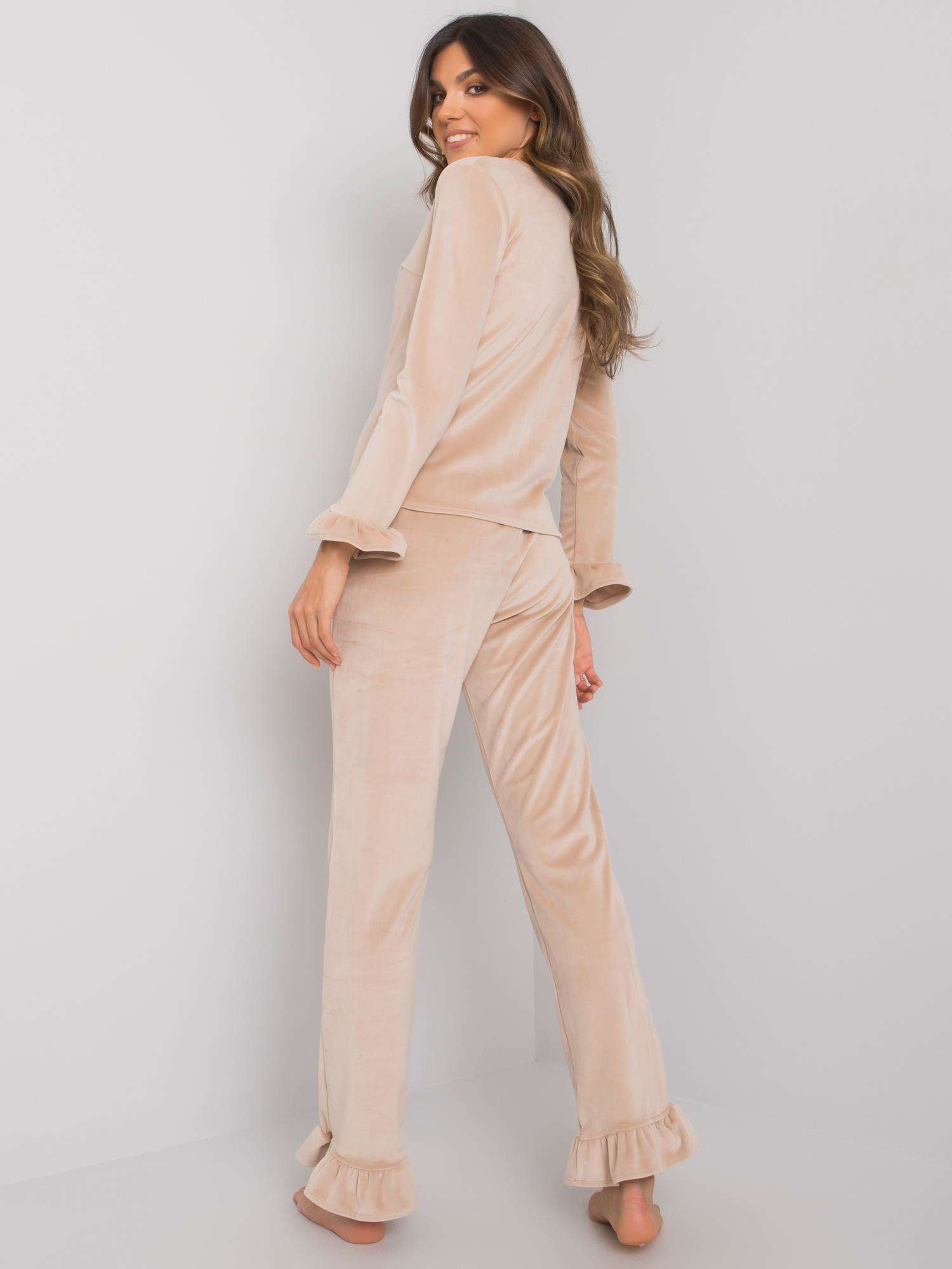 Wymiary piżamy w rozmiarze S mierzone na płasko: bluzka: szerokość pod pachami - 45 cm, długość całkowita - 54 cm, długość rękawa - 54 cm, spodnie: szerokość w pasie - 38 cm, długość całkowita - 97 cm