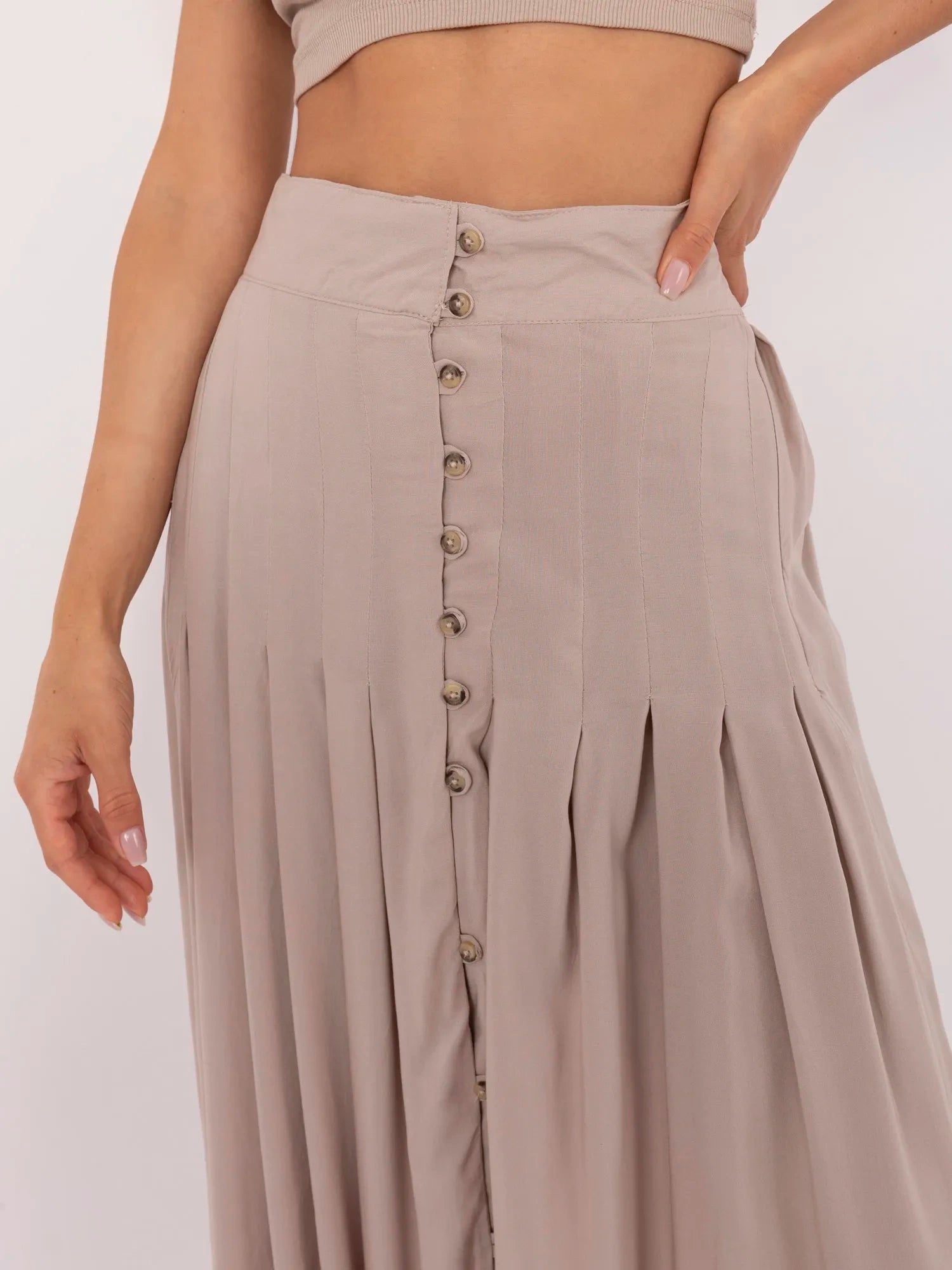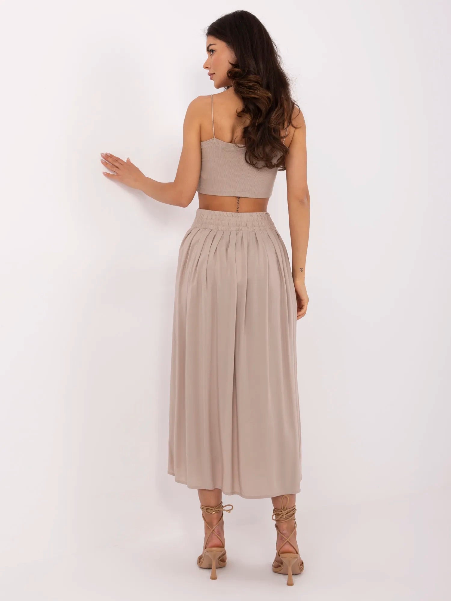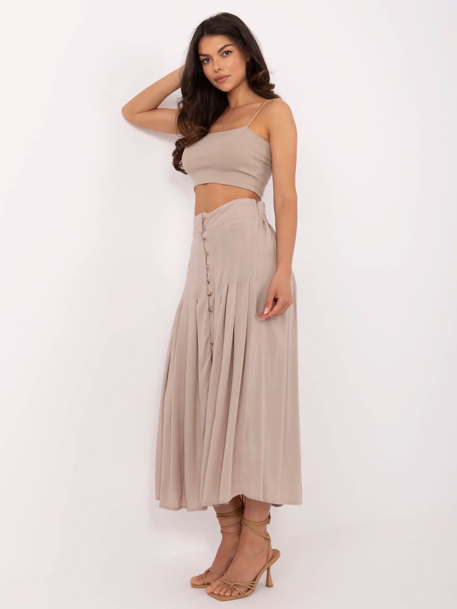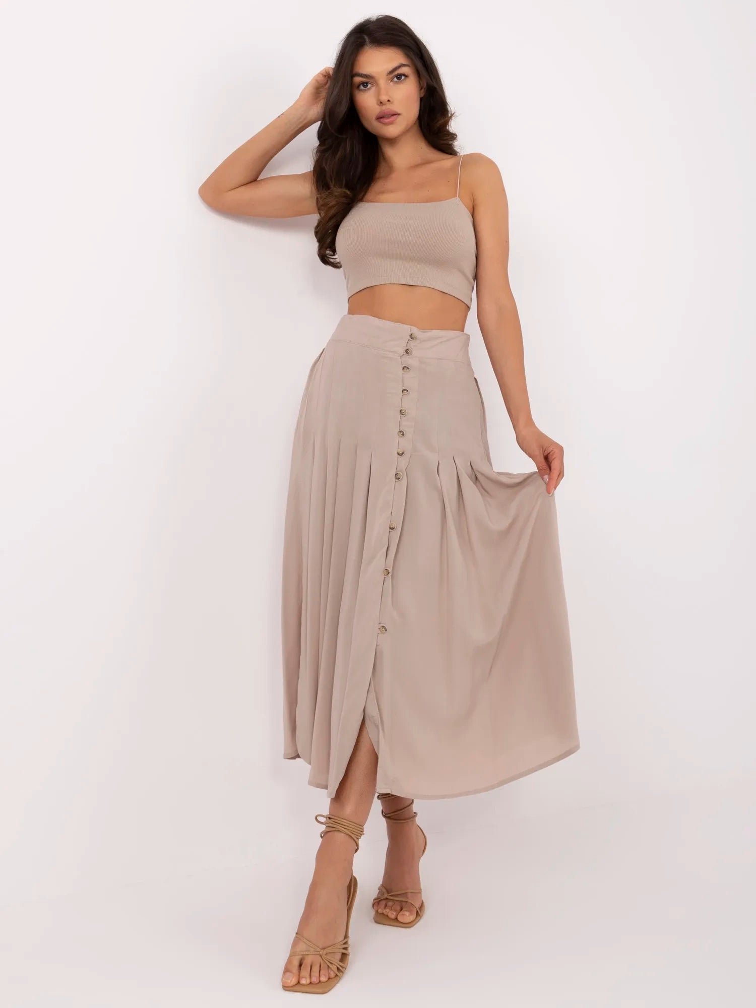 Wymiary spódnicy w rozmiarze S mierzone na płasko: szerokość w pasie - 35 cm (na płasko), szerokość w pasie - 39 cm (po rozciągnięciu), szerokość w biodrach - 66 cm, długość całkowita - 87 cm.