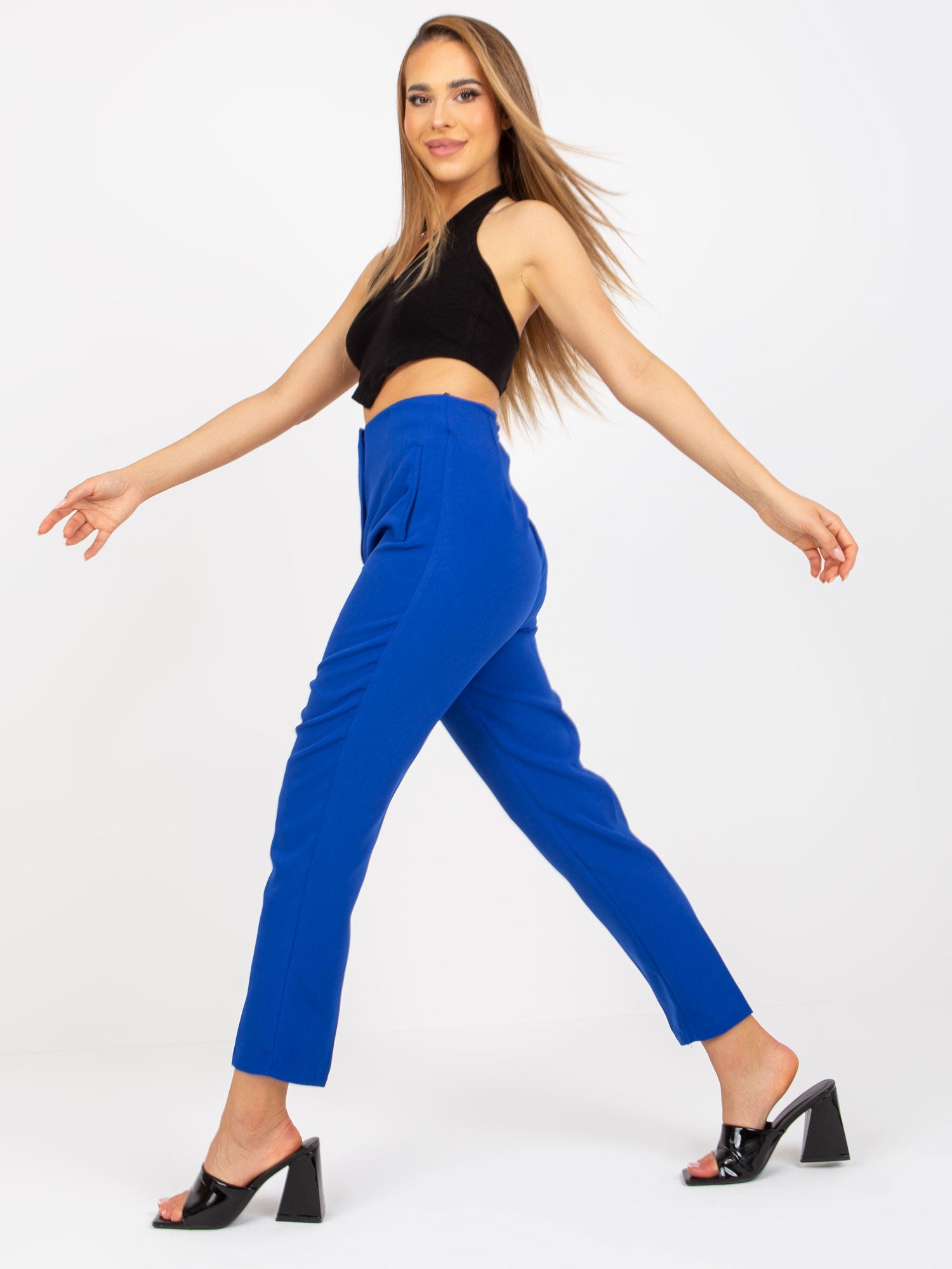 Kobaltowe damskie spodnie od garnituru z prostą nogawką .
