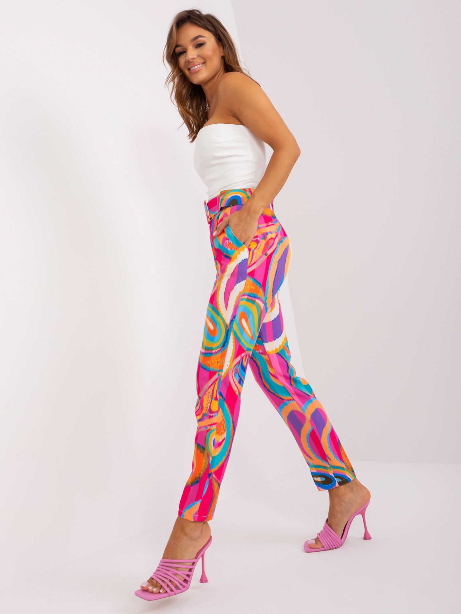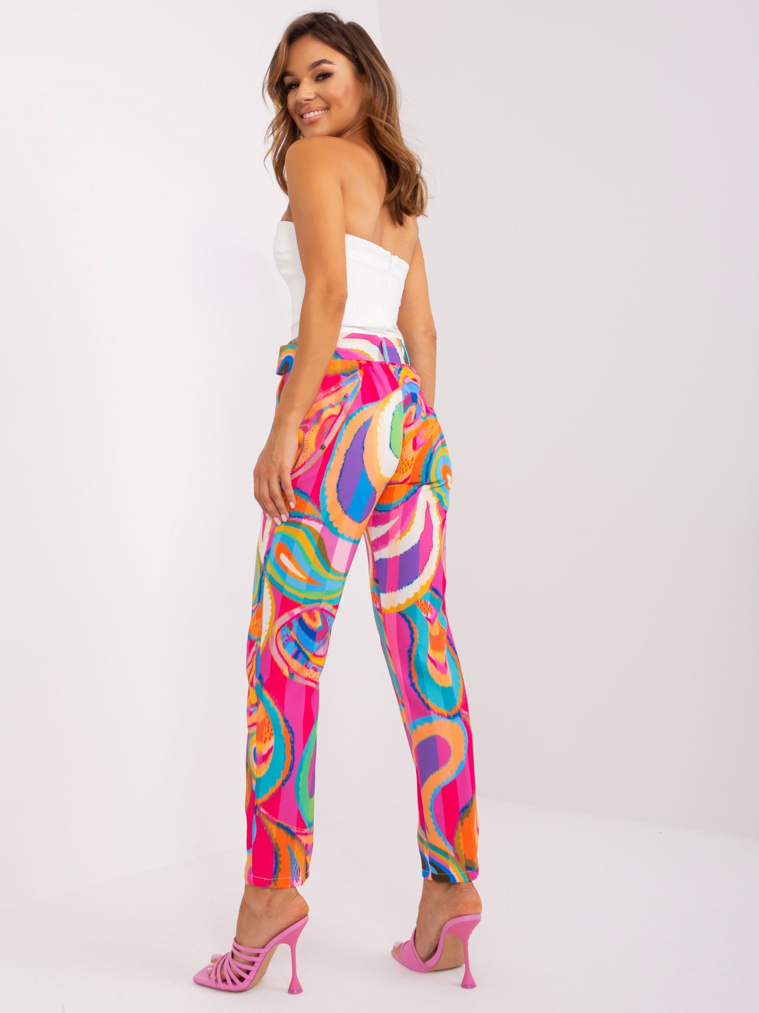 Różowe damskie spodnie z materiału we wzory .