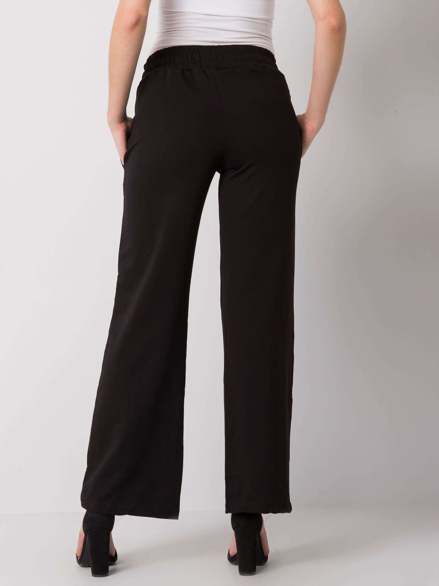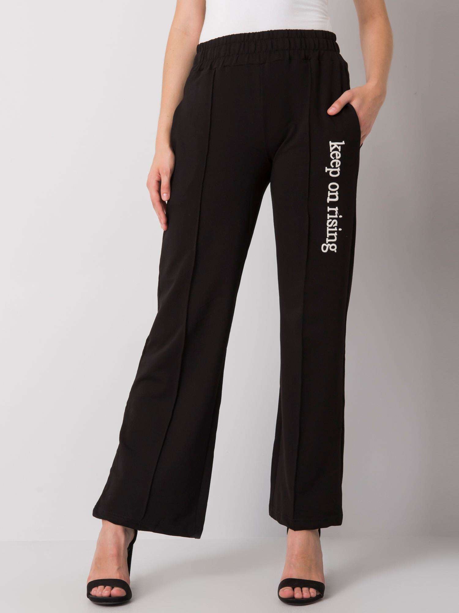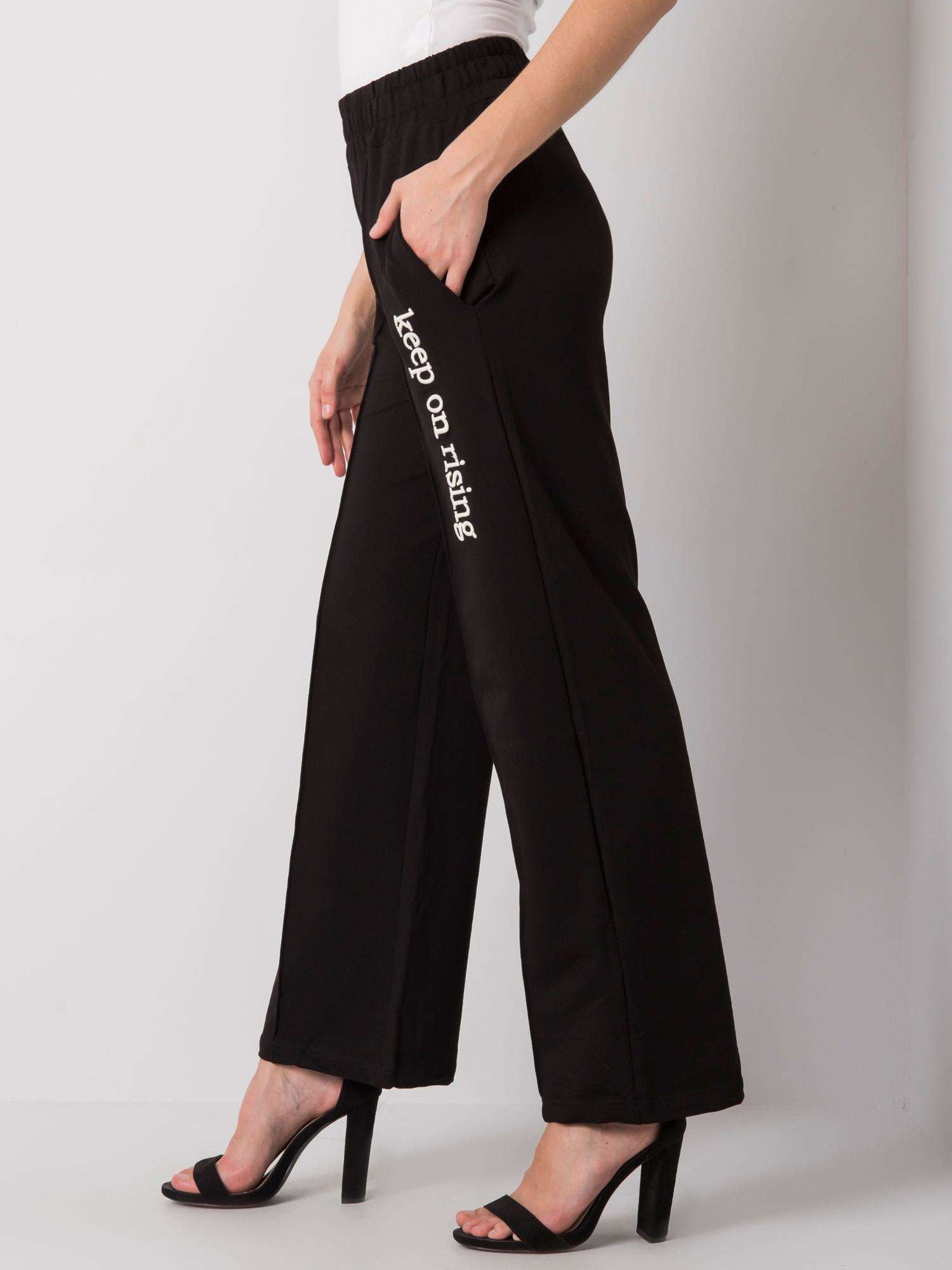 Czarne proste dresy z napisem.