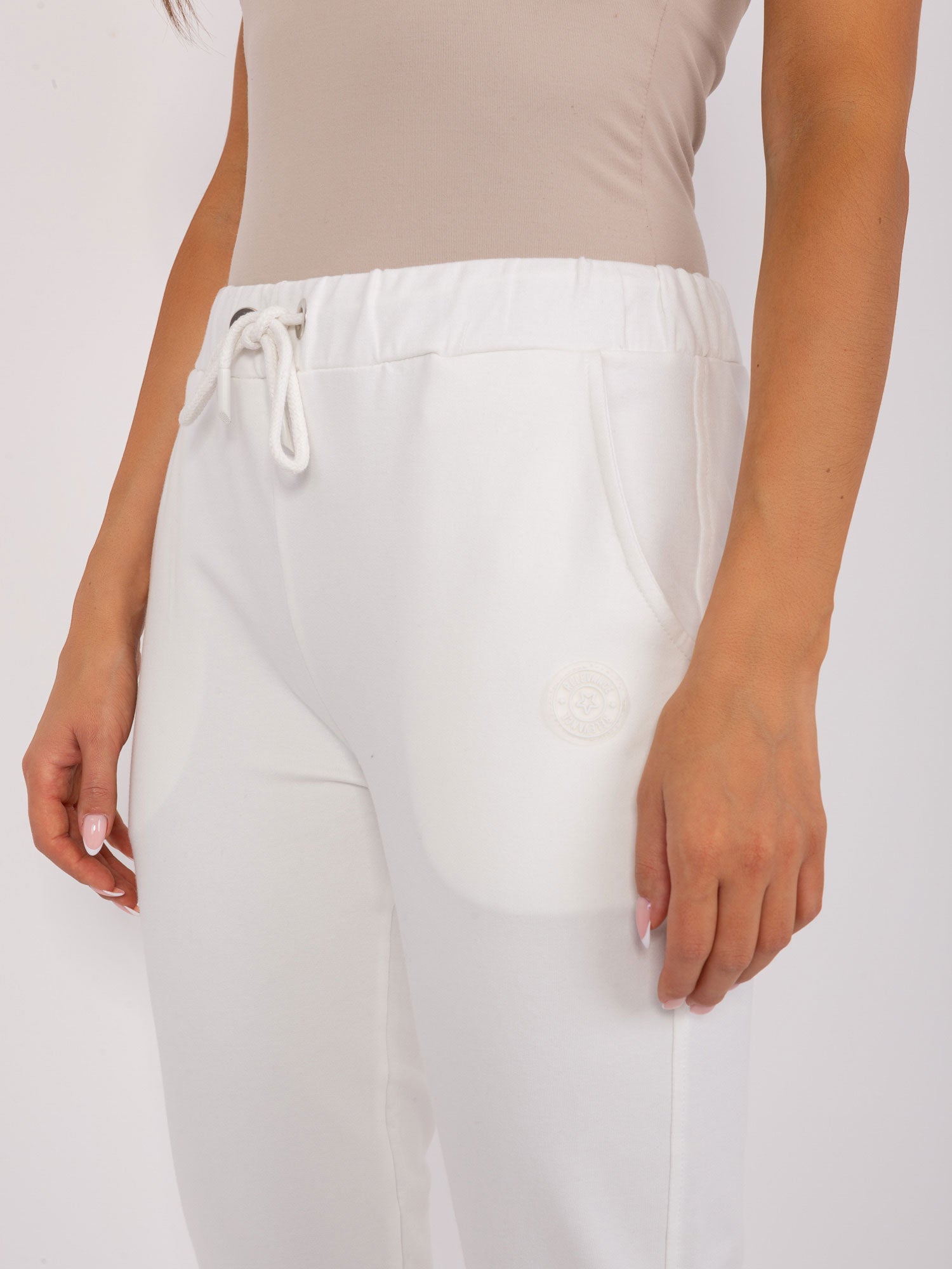 Ecru spodnie dresowe z troczkami i kieszeniami.