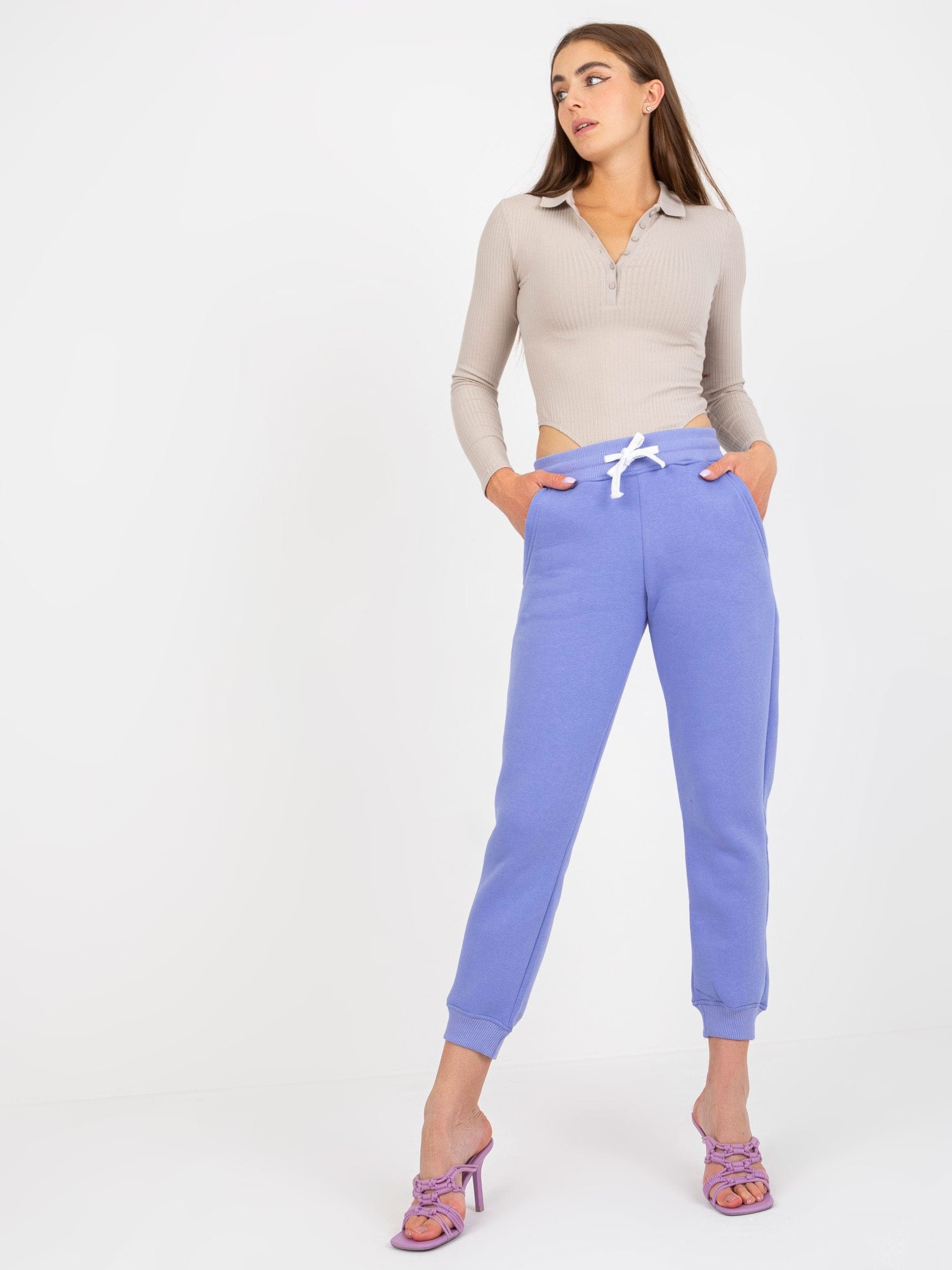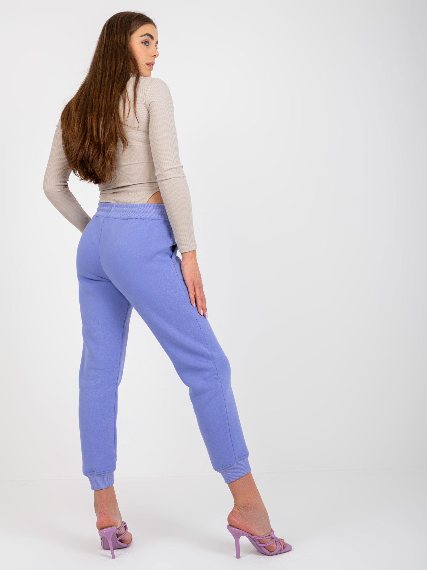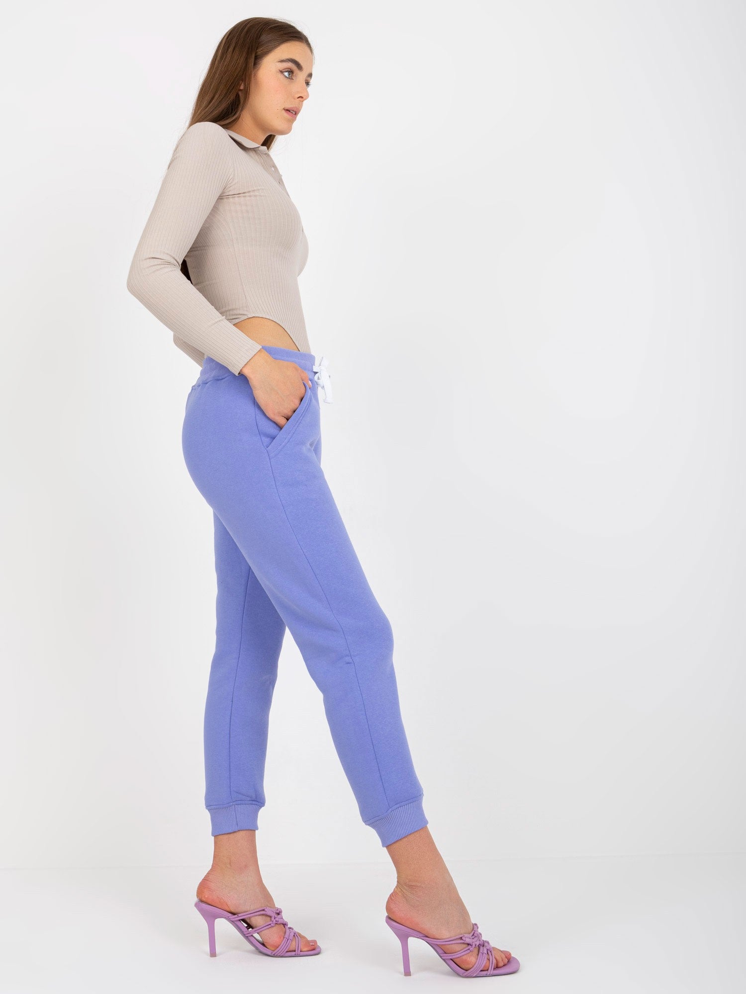 Jasnofioletowe spodnie dresowe ze ściągaczami .