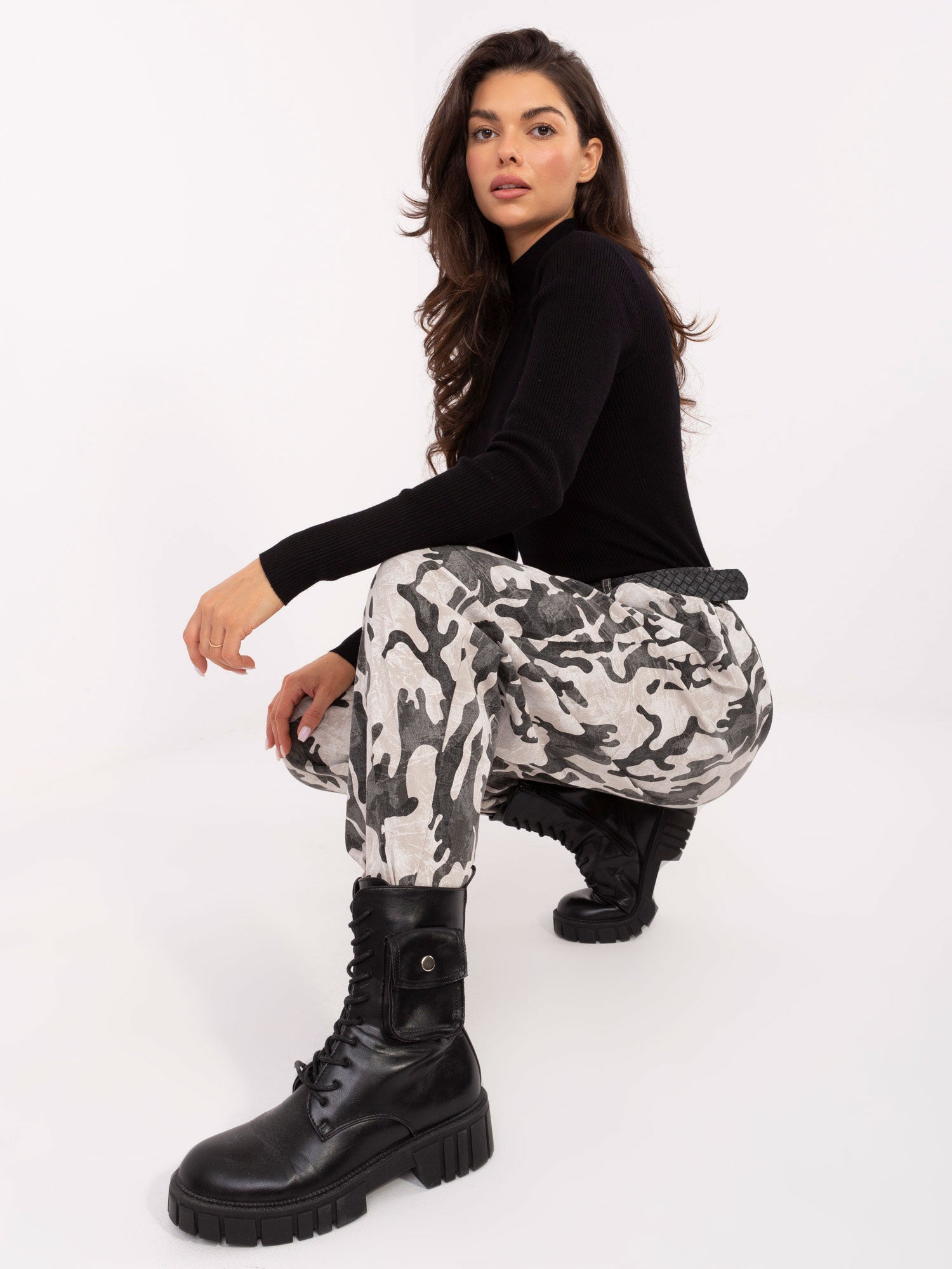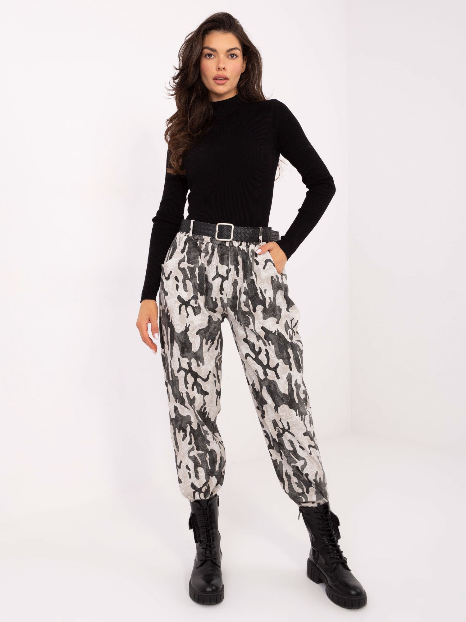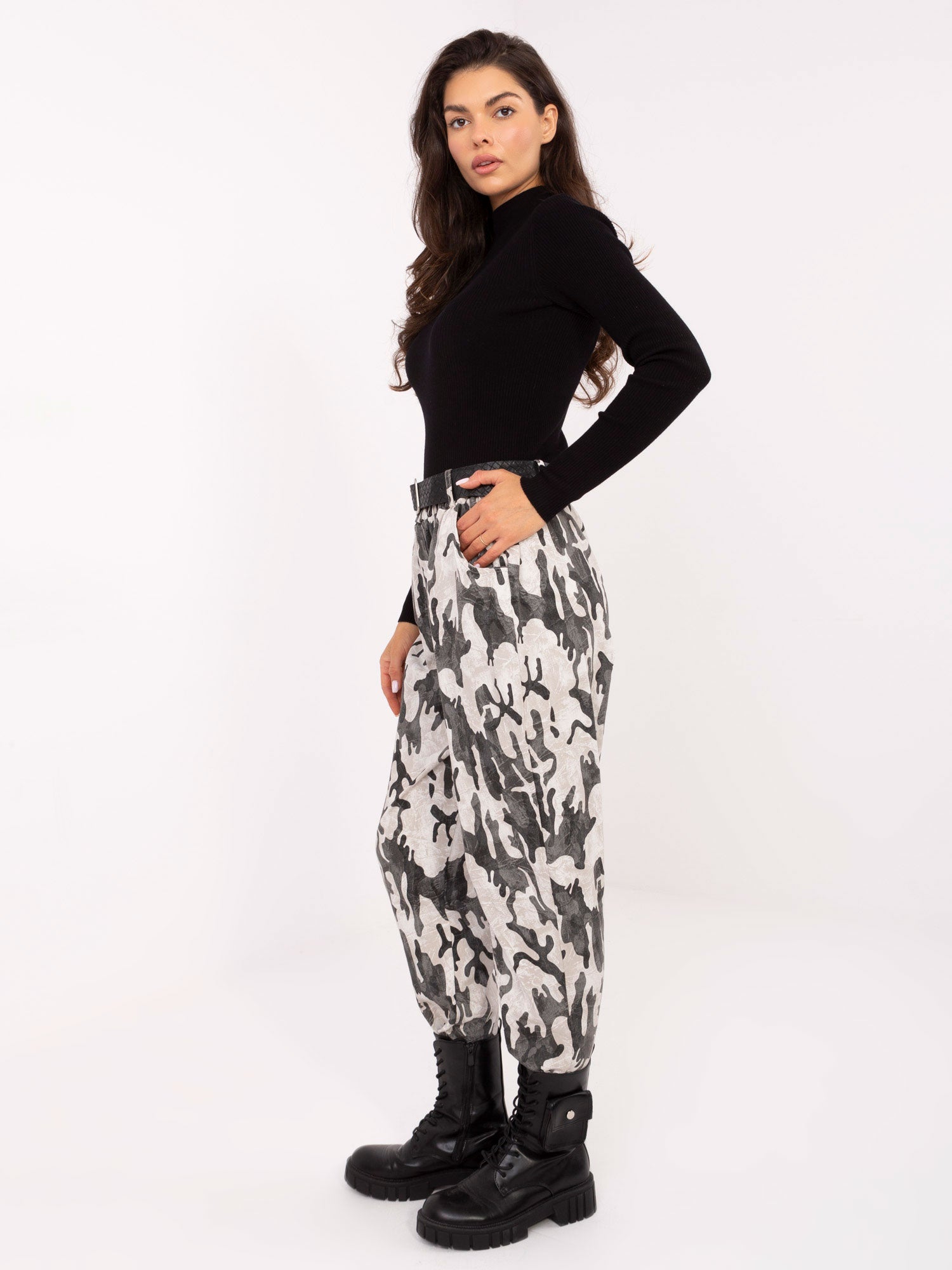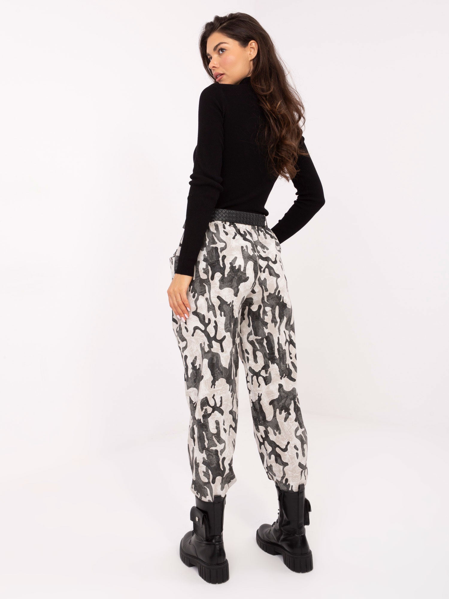 Wymiary spodni w rozmiarze one size: szerokość spodni w pasie - 33 cm (na płasko), szerokość spodni w pasie - 75 cm (po rozciągnięciu), szerokość w biodrach - 60 cm, długość spodni - 98 cm.
